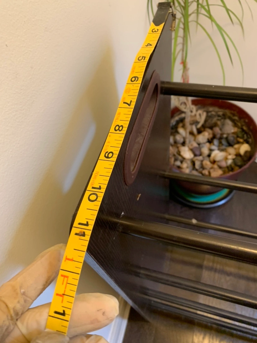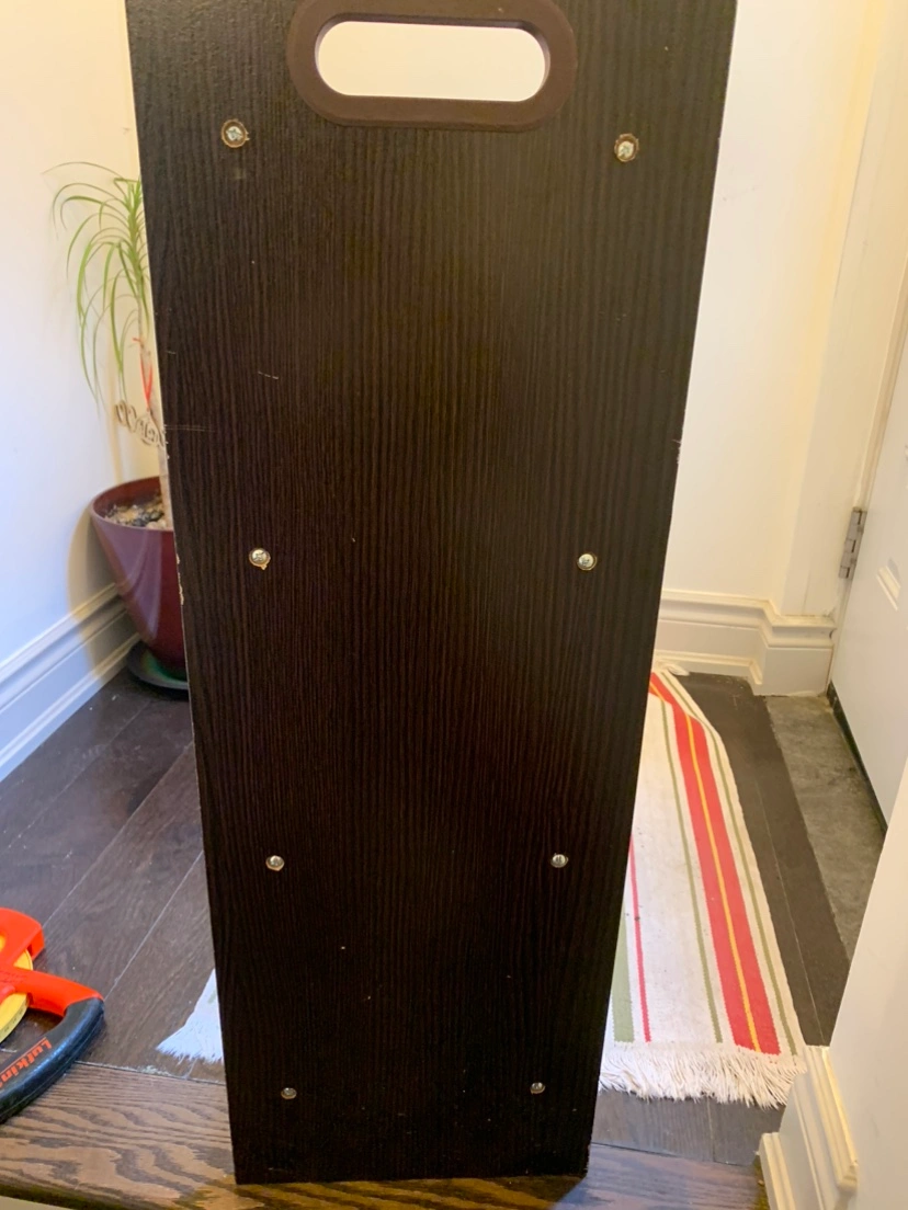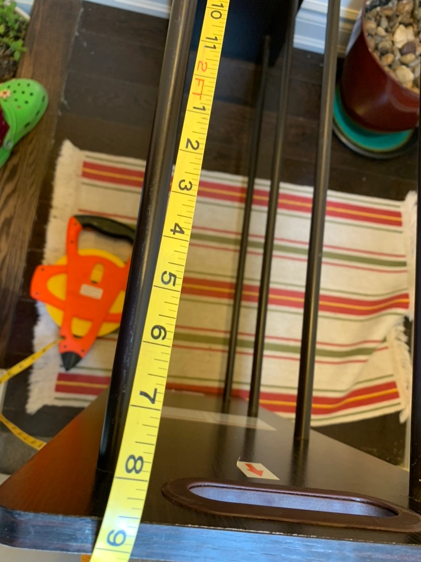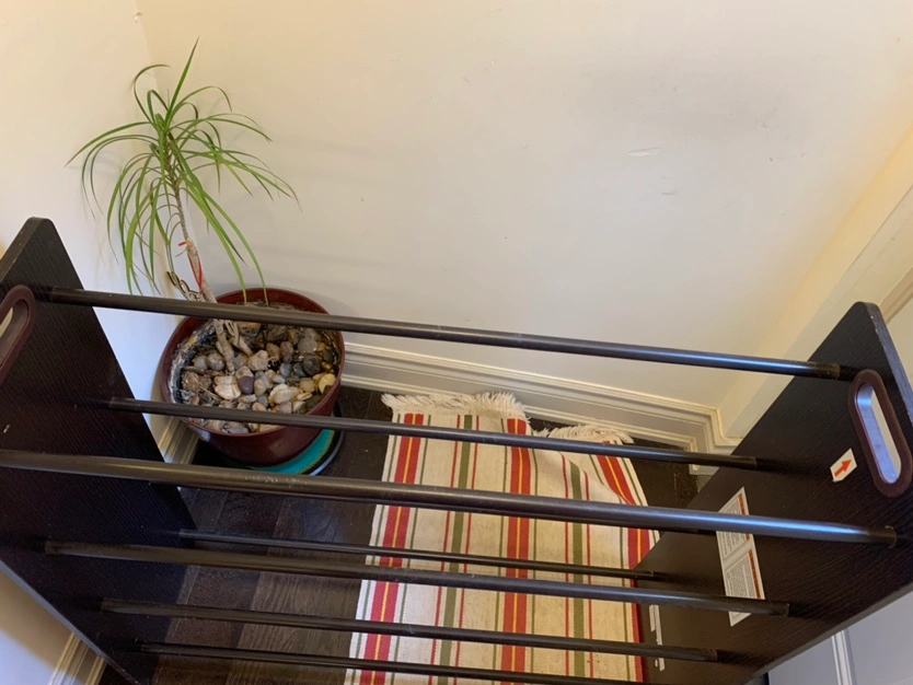 A 4 tier shoe rack that stands approximately 30 inches tall and is in great condition. It has 2 handles on each side of the rack and measures approximately 27 inches wide and 12 inches deep. It would make an excellent addition to any entryway or closet.