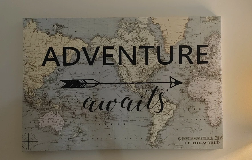 Canvas wall art with a world map featuring the text "Adventure awaits". Measures 36 inches by 24 inches