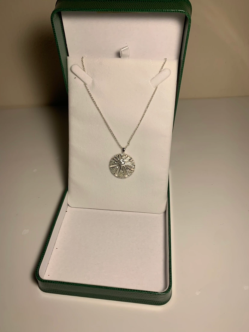 A Silver necklace with a Swarovski Elements sand dollar pendant. Comes in a green alligator leather box.