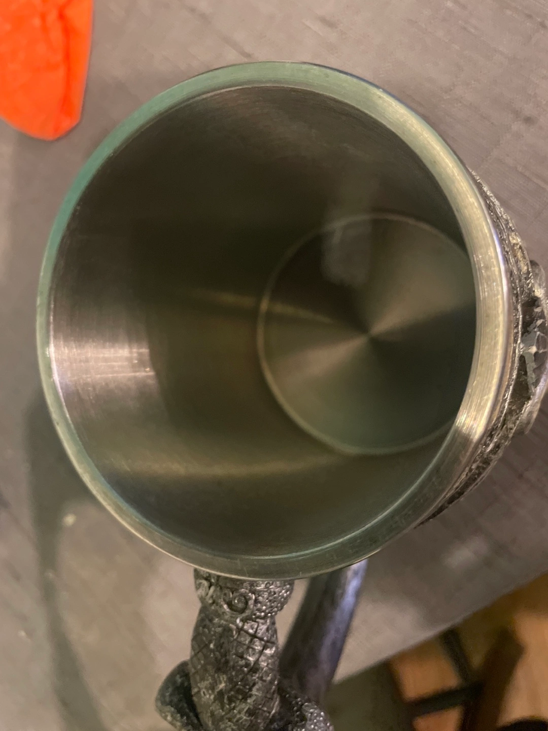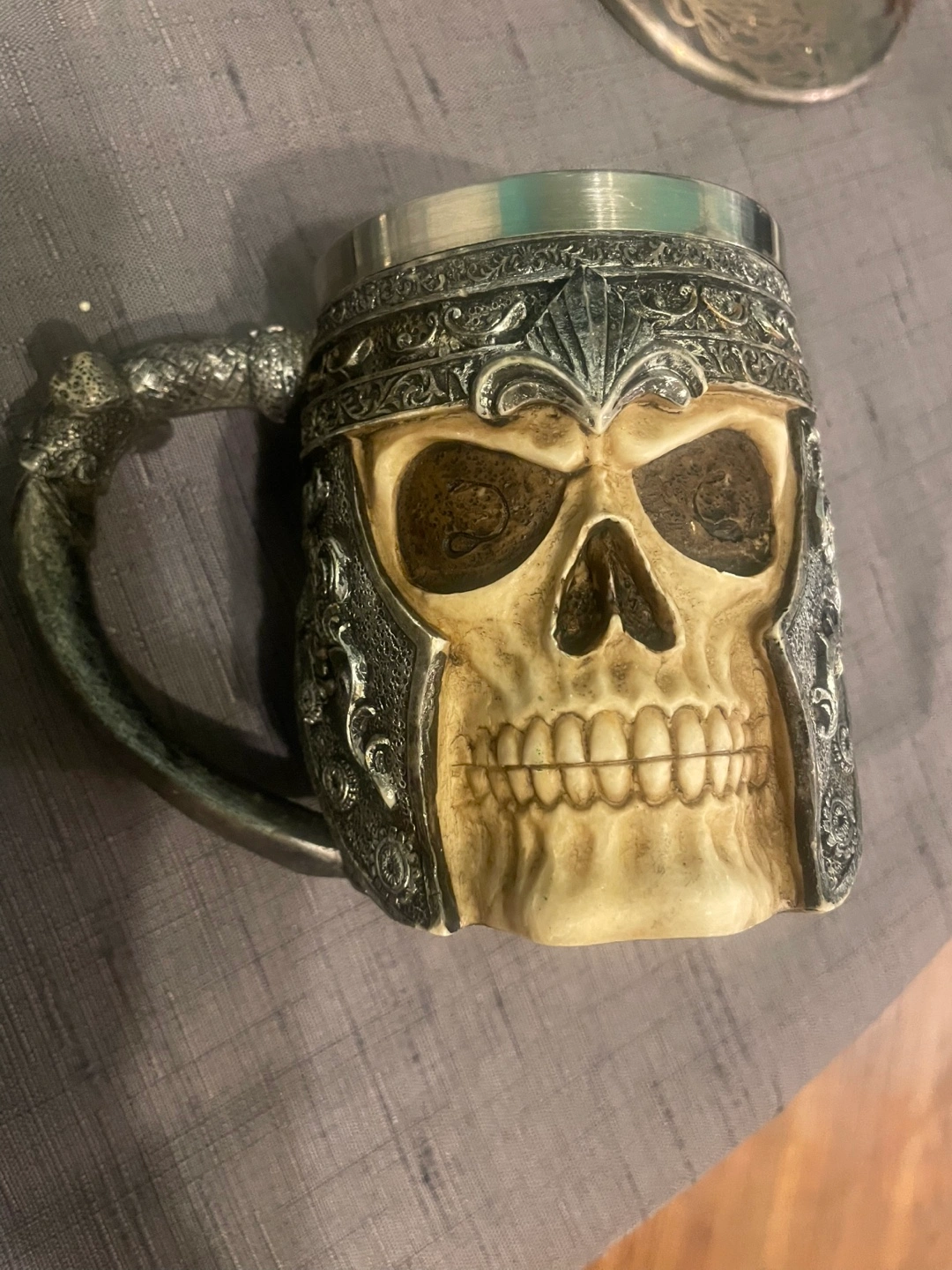 Metal and ceramic skull mug, with a stainless steel rim. The skull is adorned with a decorative design resembling a helmet.