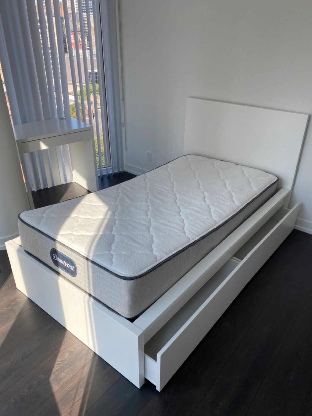 Ikea malm twin bed with 2 storage shelves + Beautyrest mattress