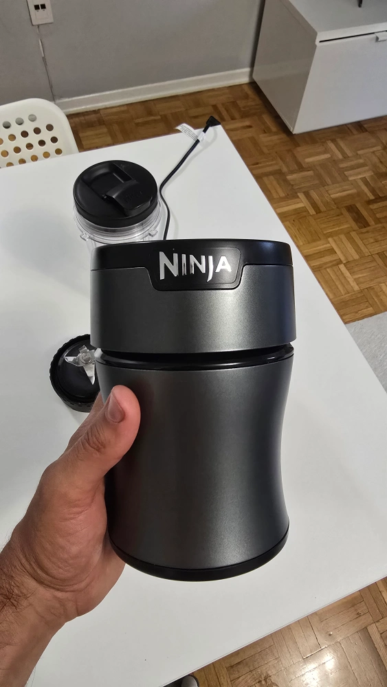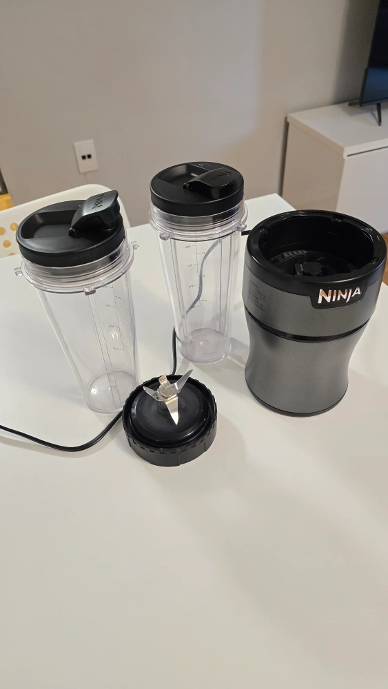Two cups, one blade, and the base of a Ninja blender. All parts are in good condition.