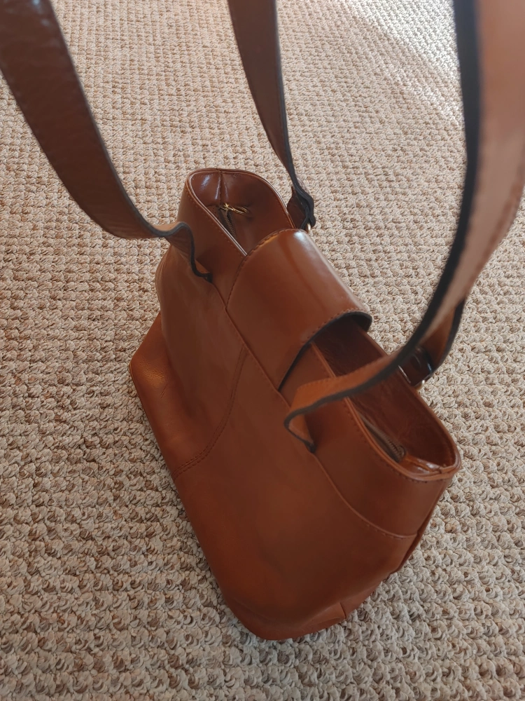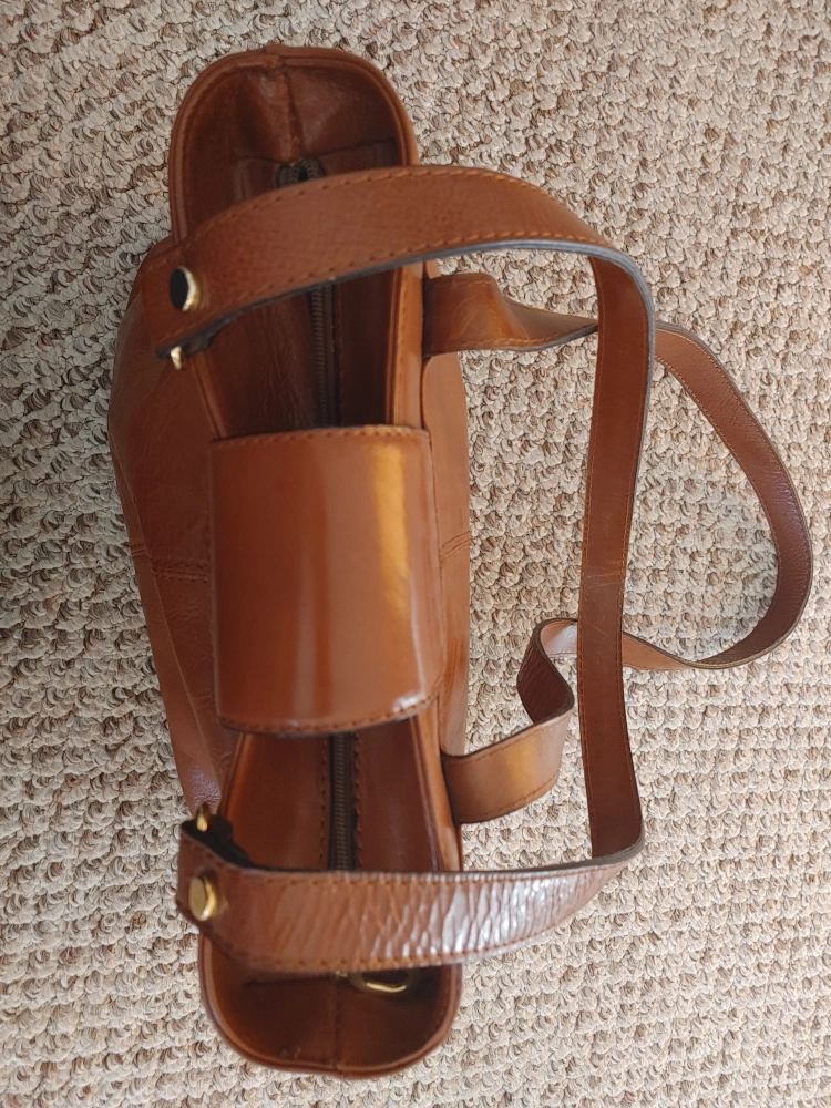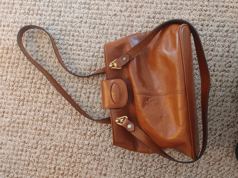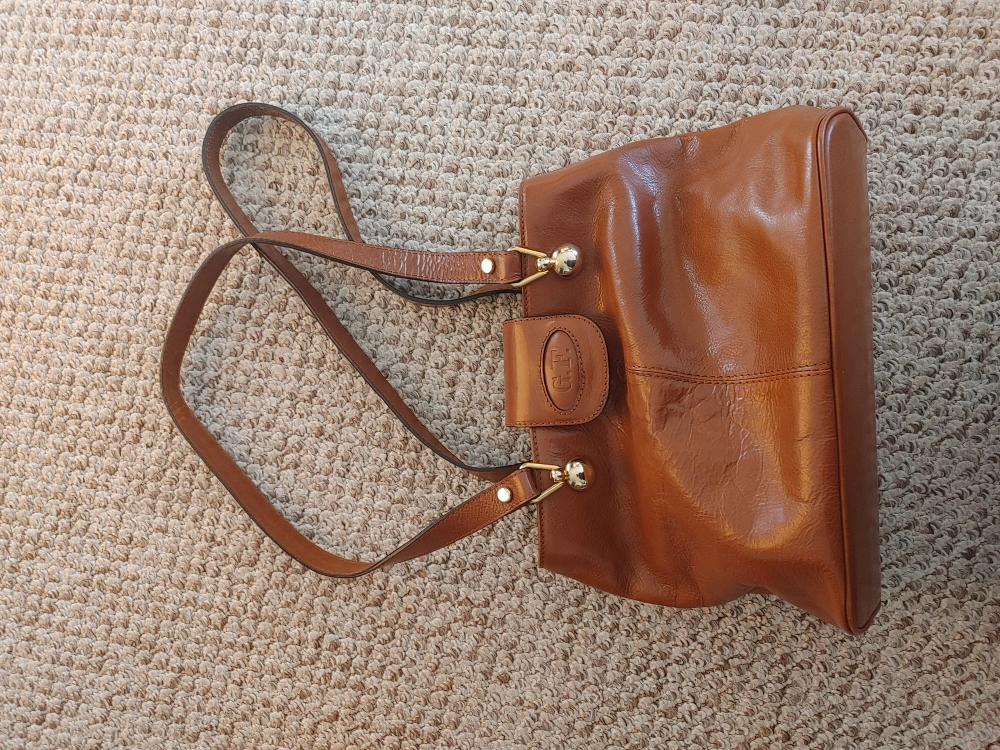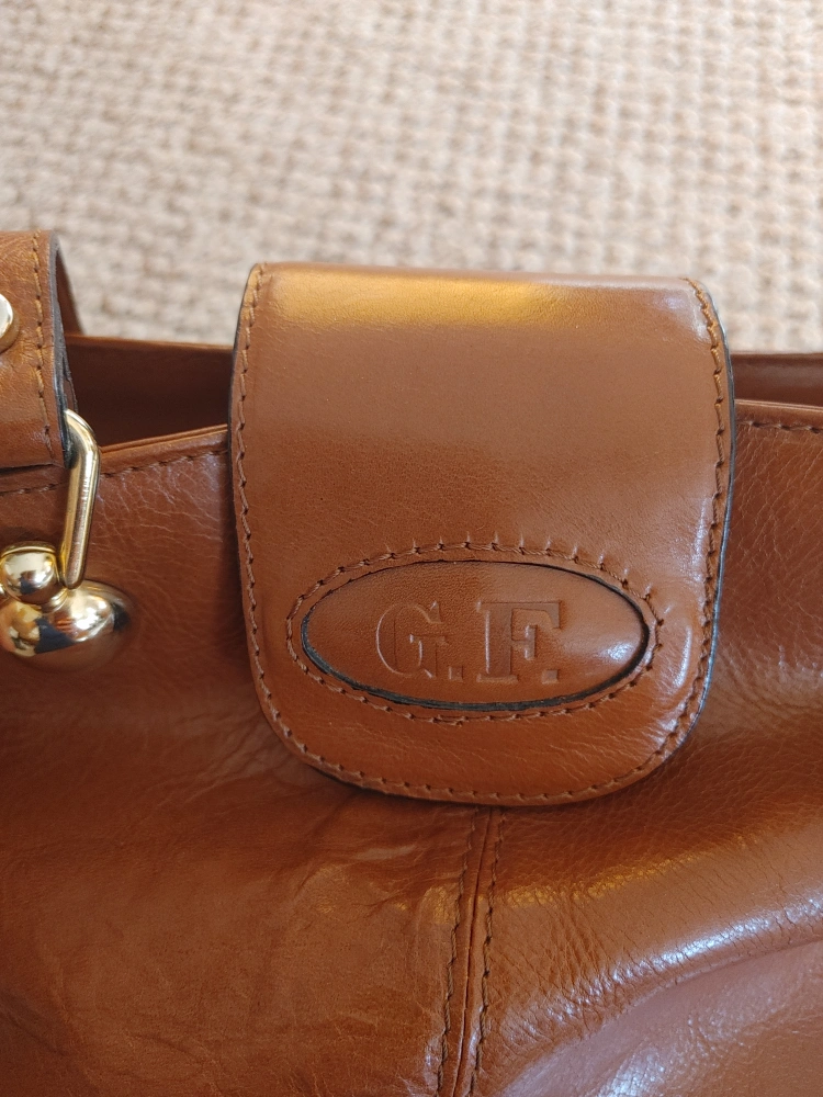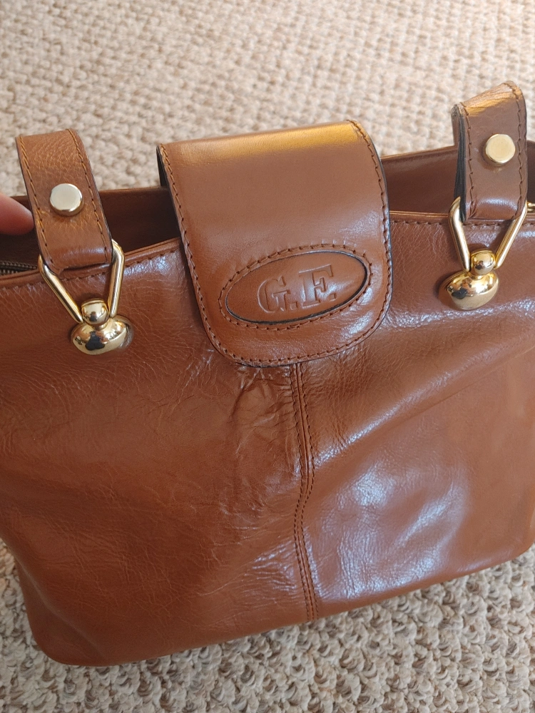 GF Brown leather shoulder bag with gold hardware. Has a long shoulder strap. Excellent condition.
