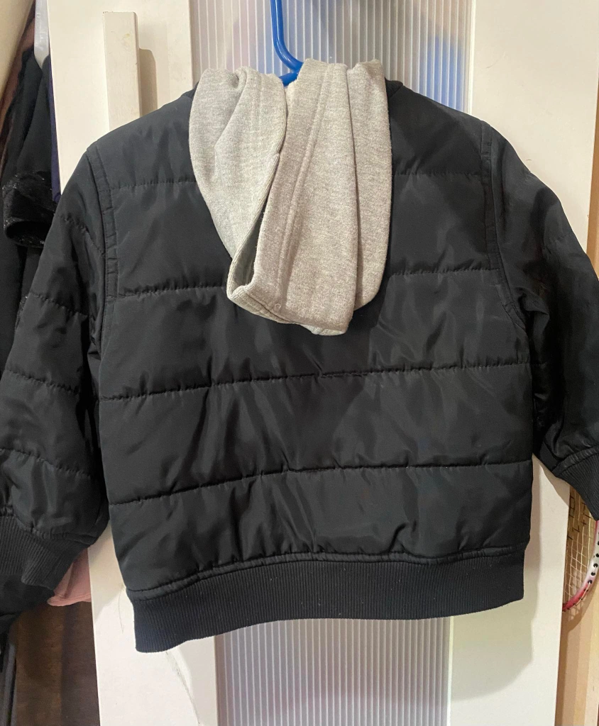 Black puffer jacket with a grey and red hooded liner. Zipper closure and side pockets. size is 24 months.