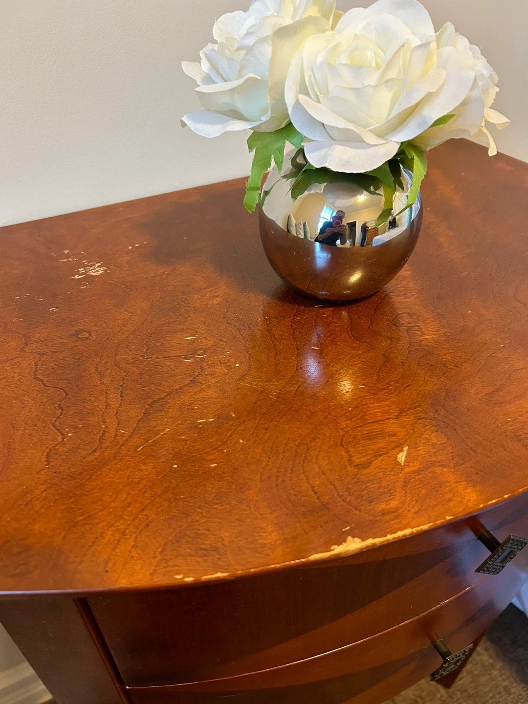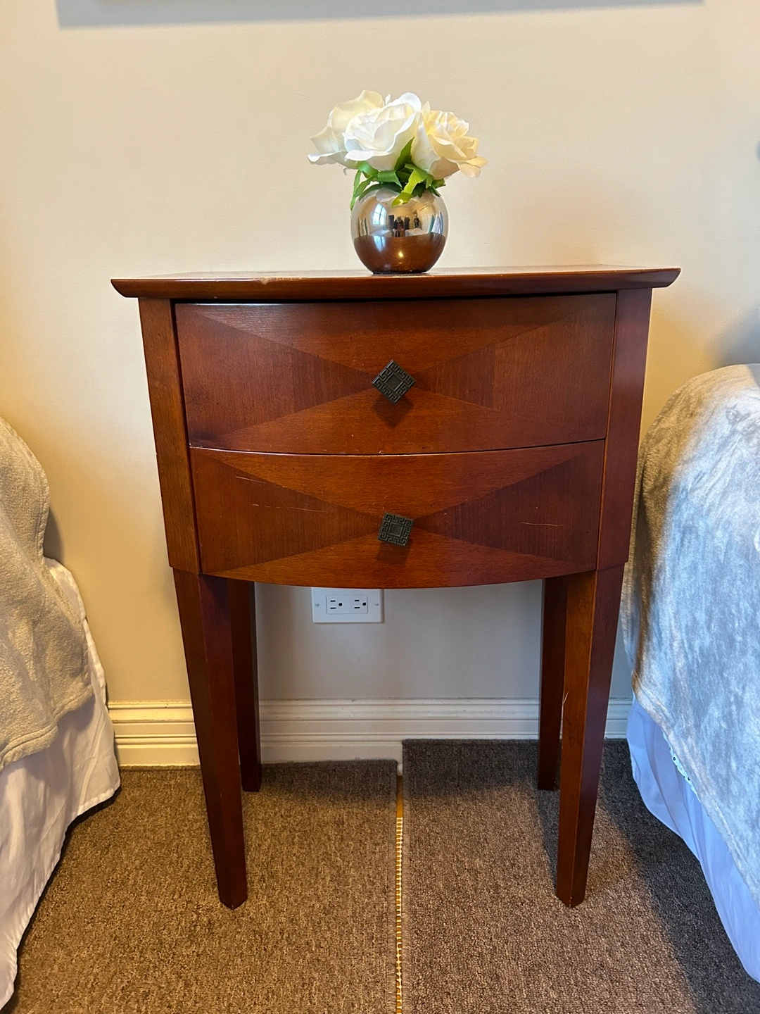 Wooden nightstand with two drawers and a curved front. The color of deep warm, Cherry wood with deep mahogany. Some scratches on top surface with some wear and tear, but overall fairly good condition.