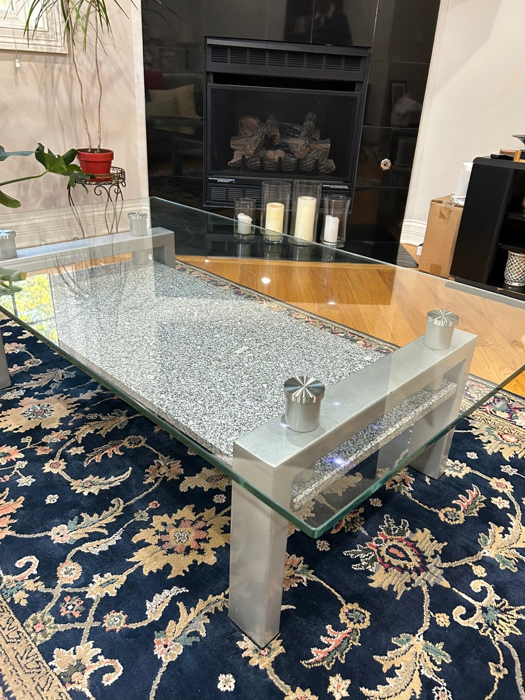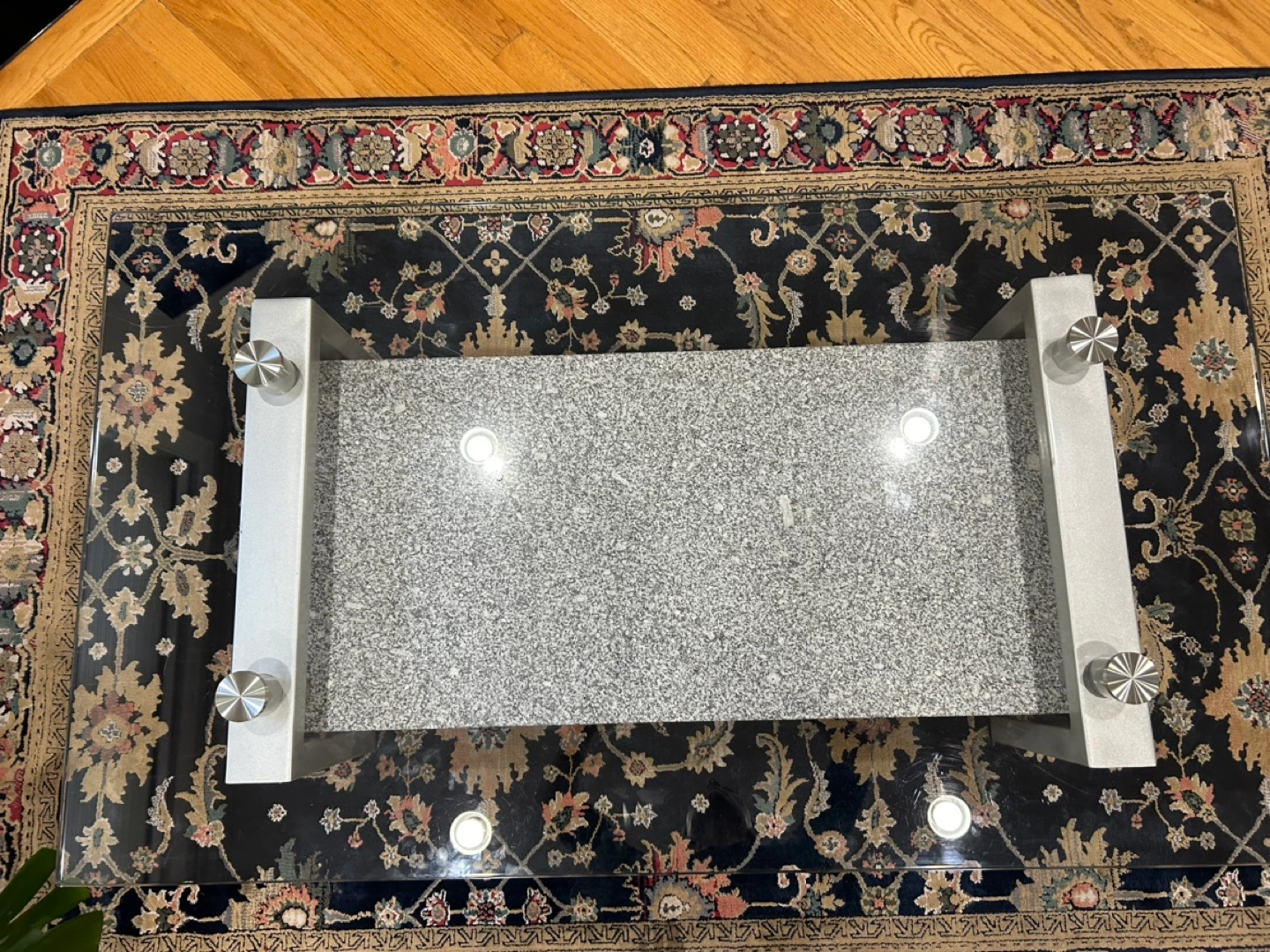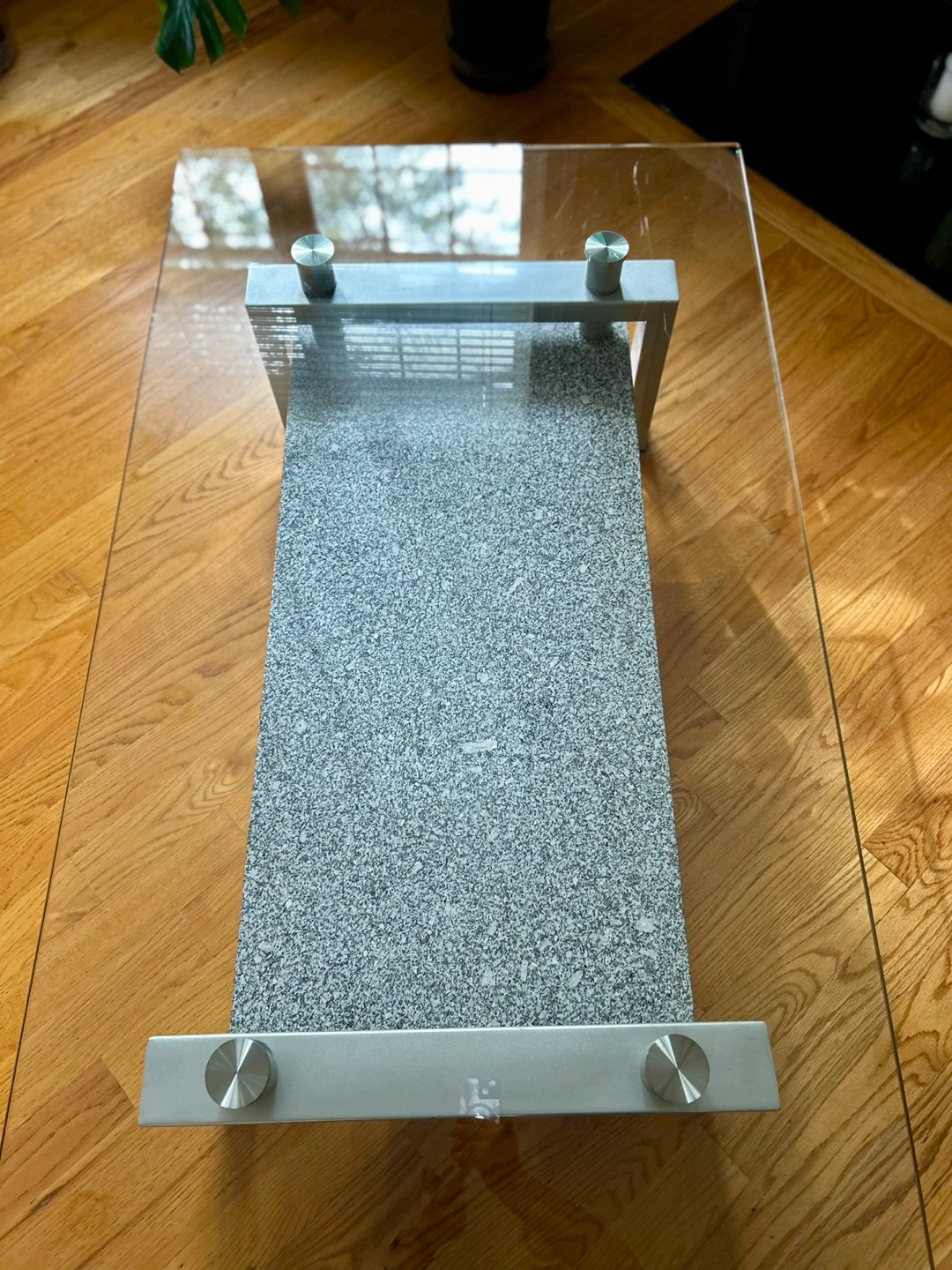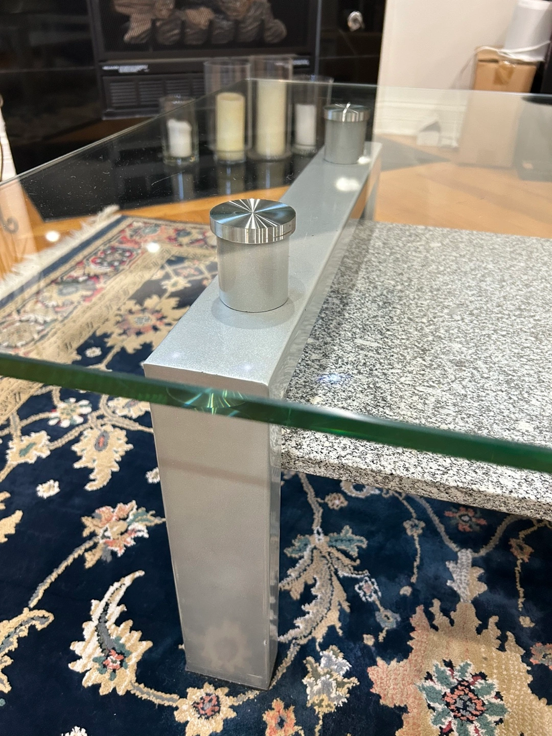 Glass top coffee table with granite insert and silver metal frame. Good condition.