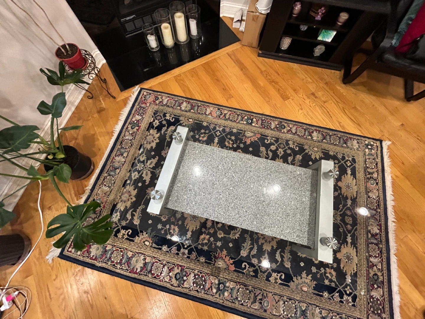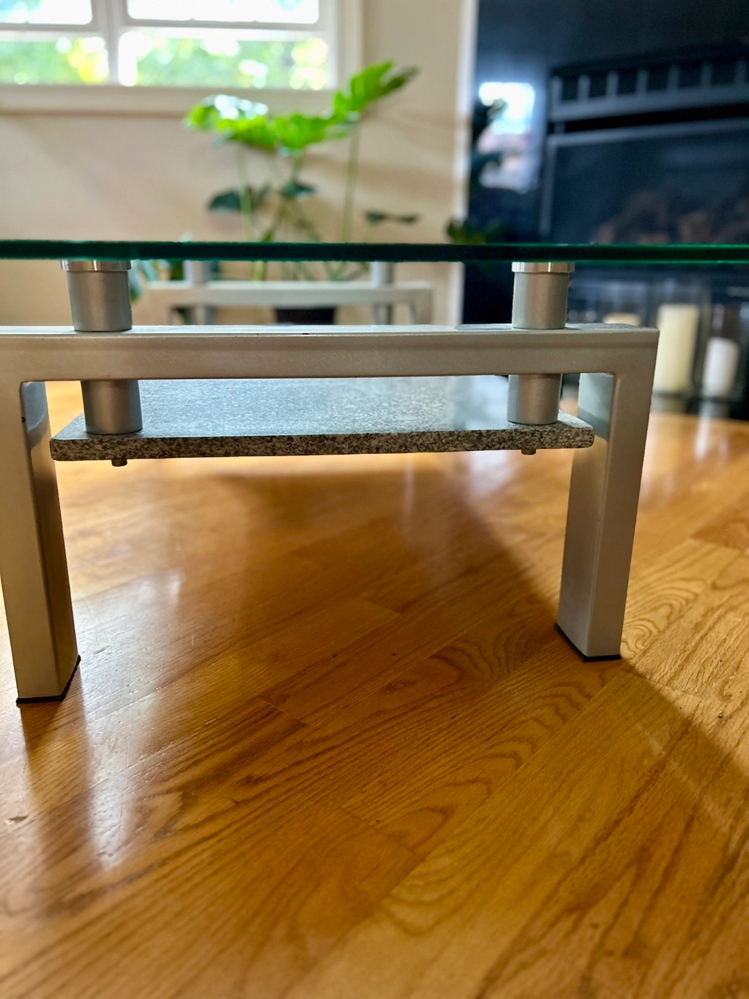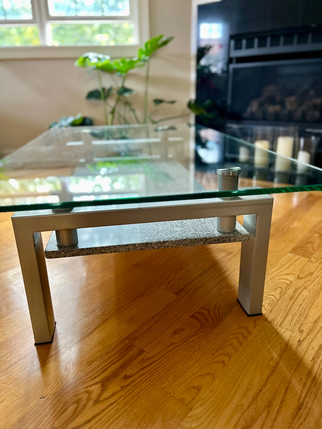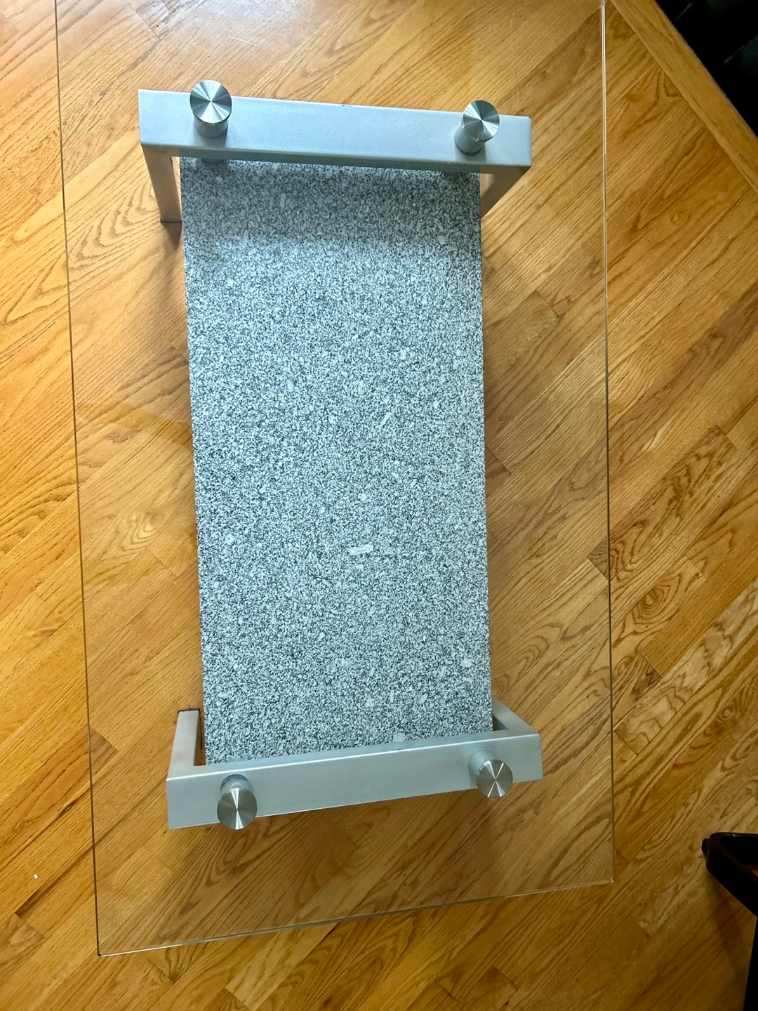 Glass top coffee table with granite insert and silver metal frame. Good condition.
