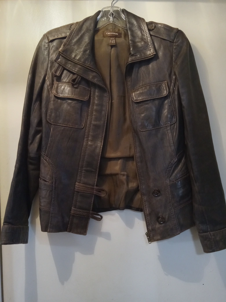 Brown leather jacket with a zipper and buttons. Has two pockets on the front.