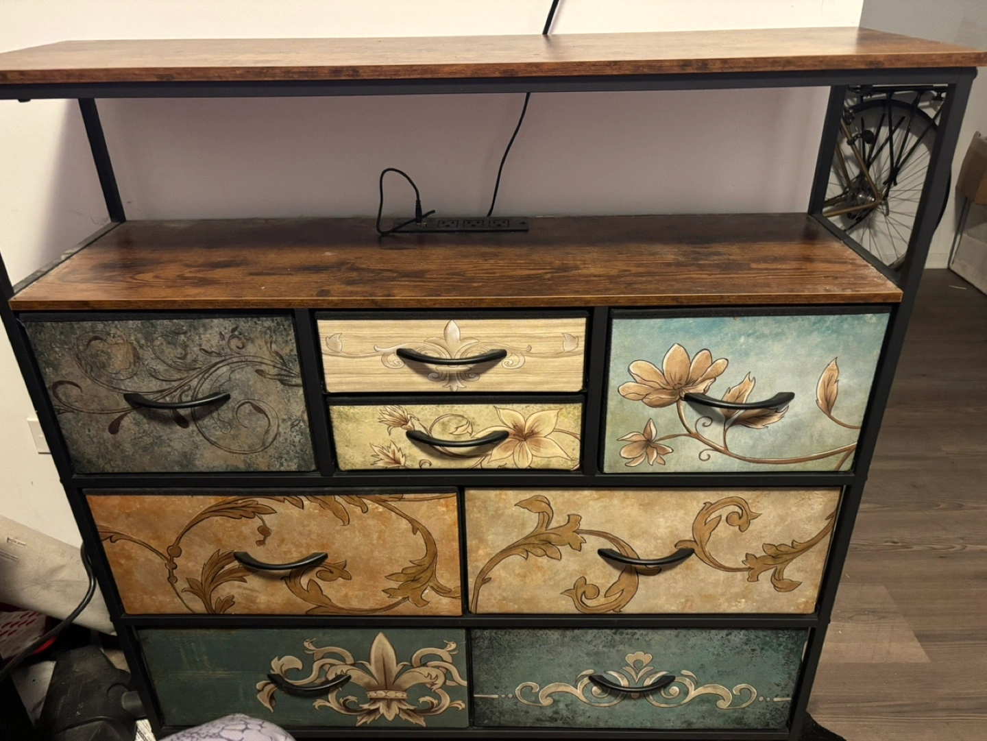 Black metal frame, wood top, and drawers with floral designs. Includes LED lights and a power cord. Remote included, but lights may no longer be functional. Perfect for small spaces. Serious inquiries only.
