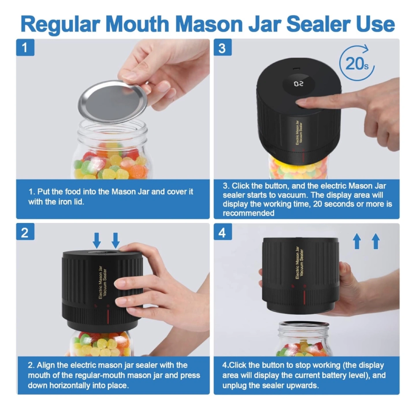 Electric Mason Jar Vacuum Sealer. Includes wide mouth and regular mouth sealer, USB charger, and instructions. Sealer can be used for regular mouth mason jars and wide mouth mason jars.