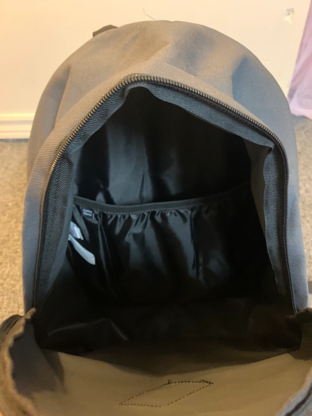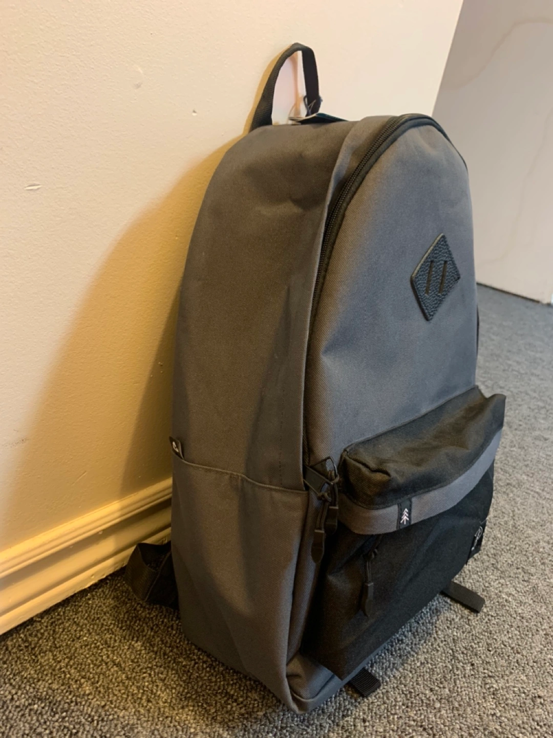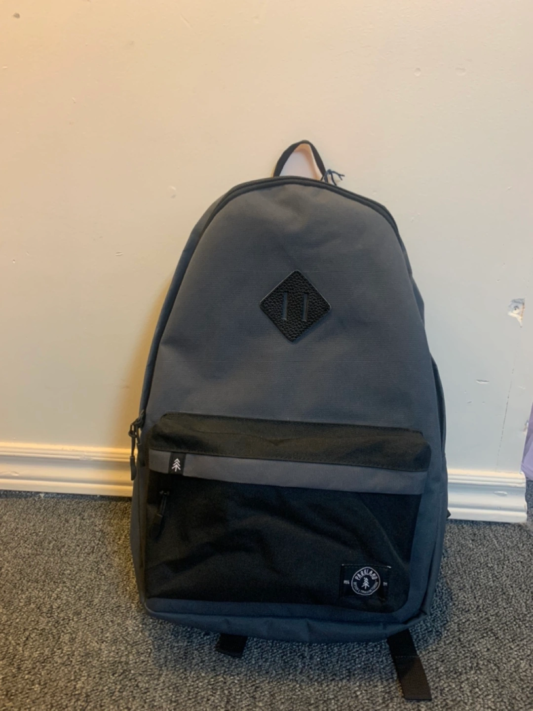 This is a sleek grey and black backpack with multiple compartments, adjustable straps, and a laptop sleeve perfect way to carry your things in style.