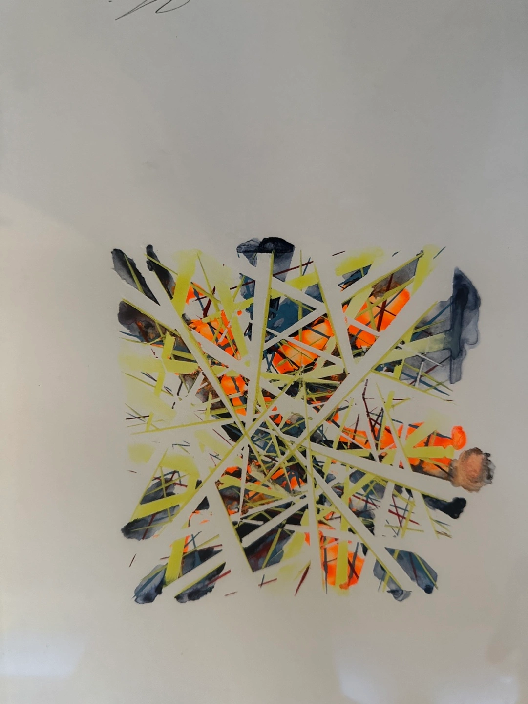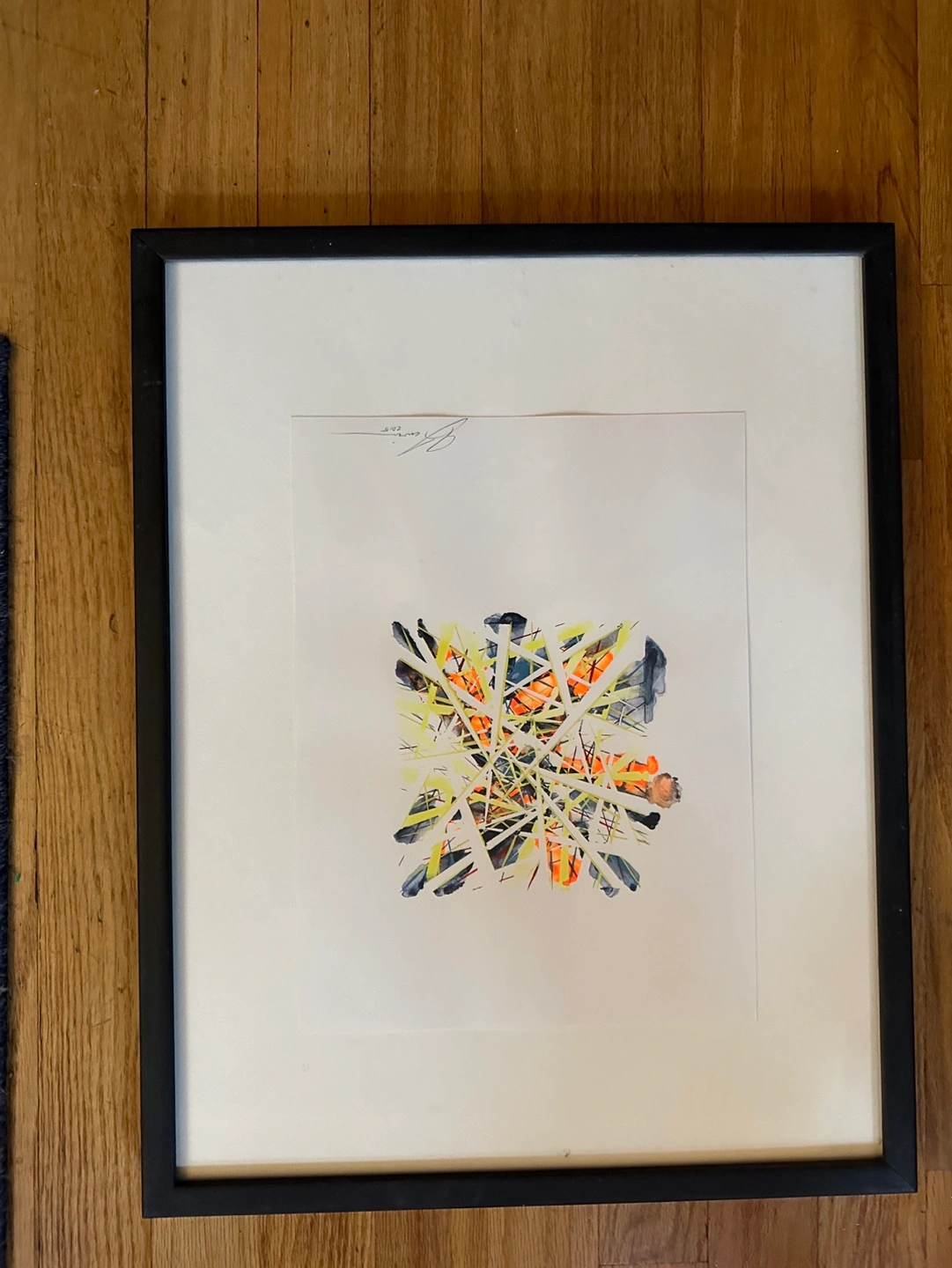 260Framed original art signed and dated by artist Jason Clay Lewis. www.jasonclaylewis.com. Abstract artwork with yellow, orange, and blue watercolor on white paper. Signed in the bottom left corner.