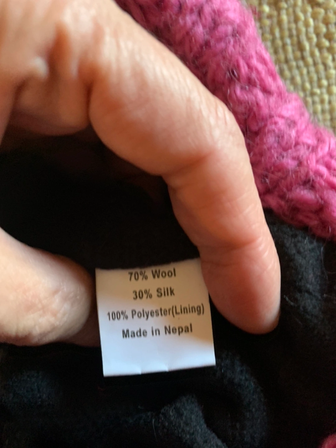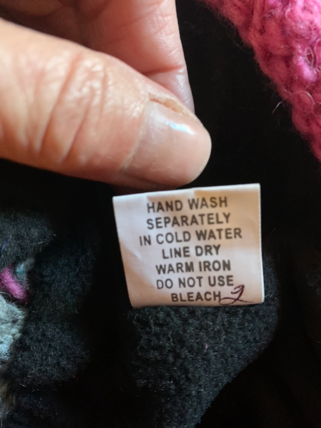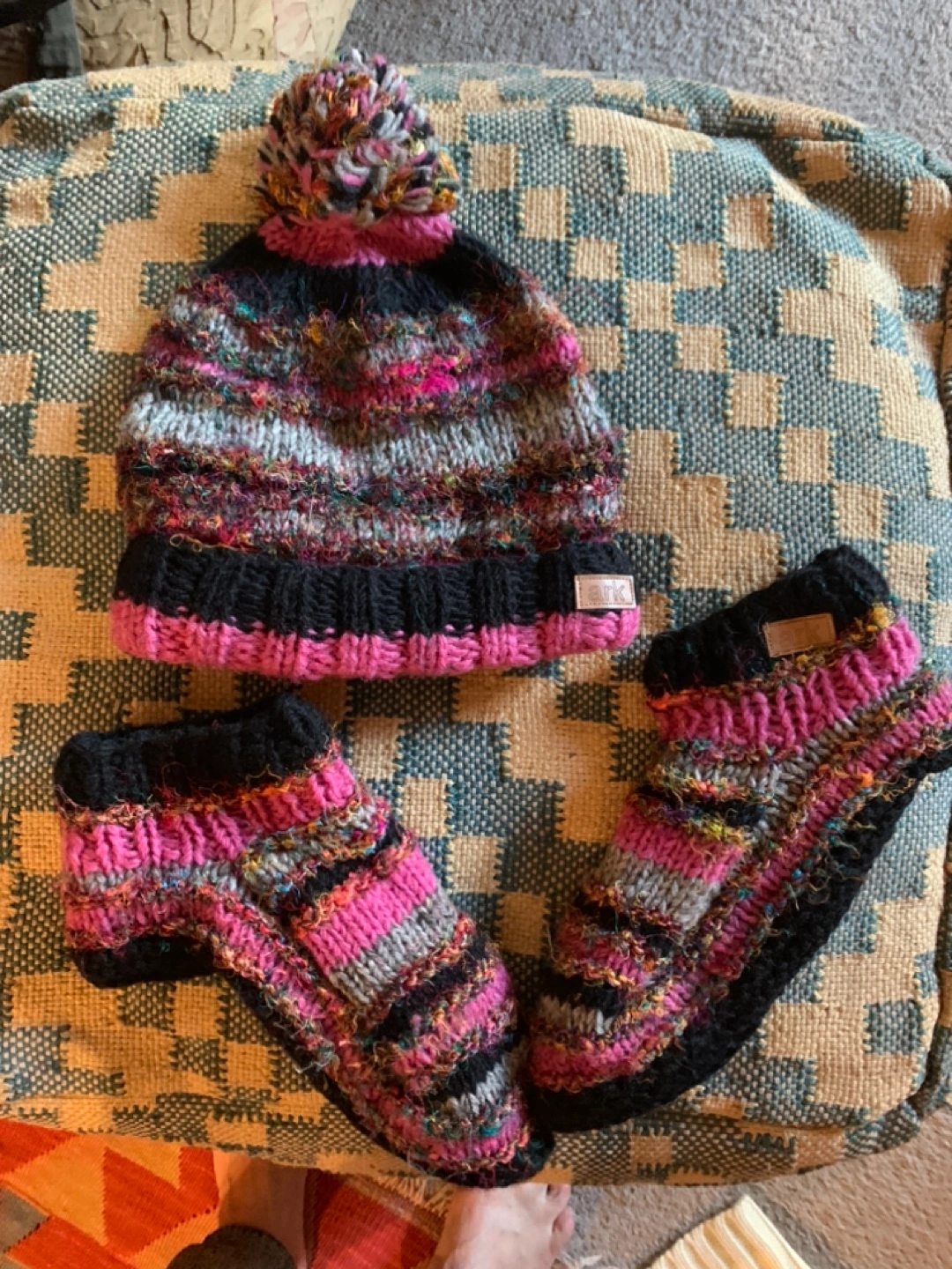 Knitted hat and slipper set. Black, pink and multicoloured wool blend. Pom pom on the hat. Hand wash in cold water.