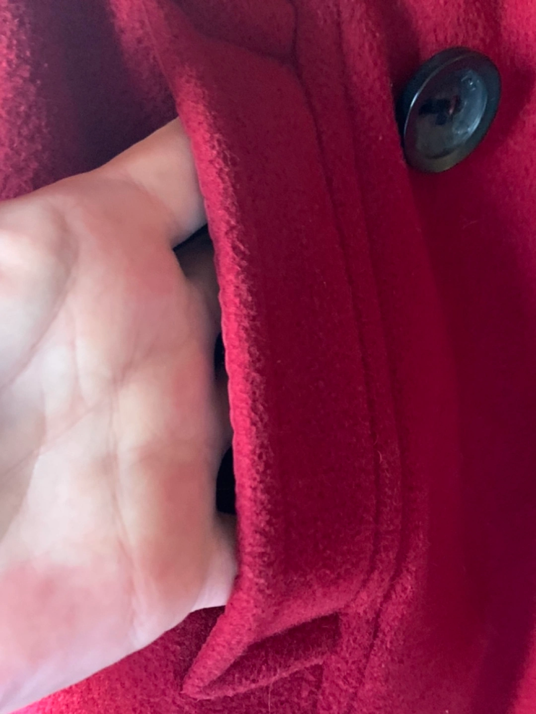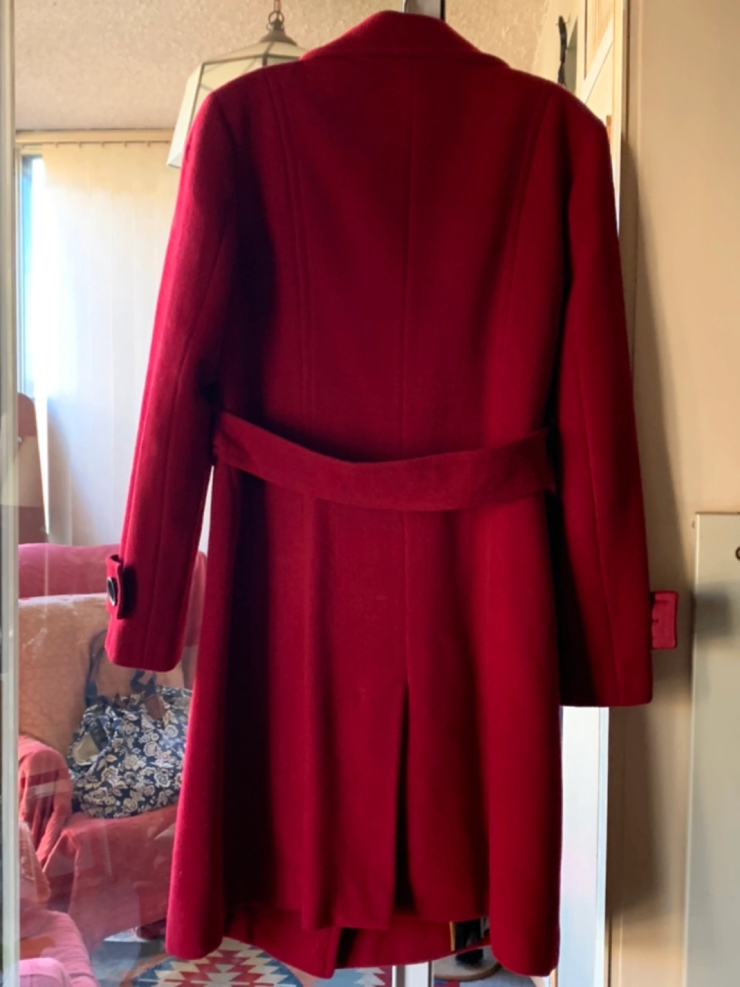 Winter Red wool coat with a double-breasted closure, pockets, and a belt.