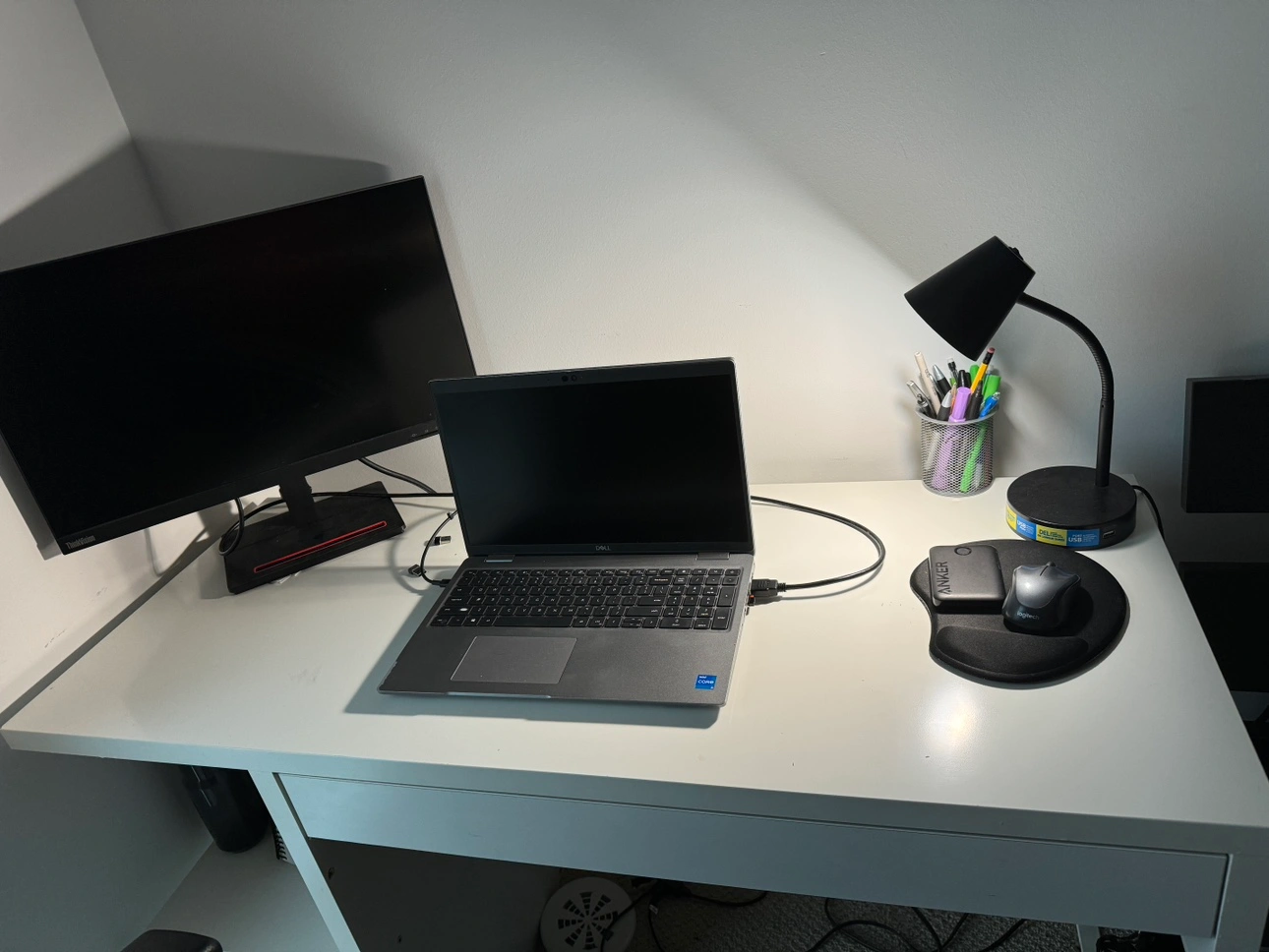 White computer desk with a shelf and drawer. The desk has some wear and tear but is still in good condition.