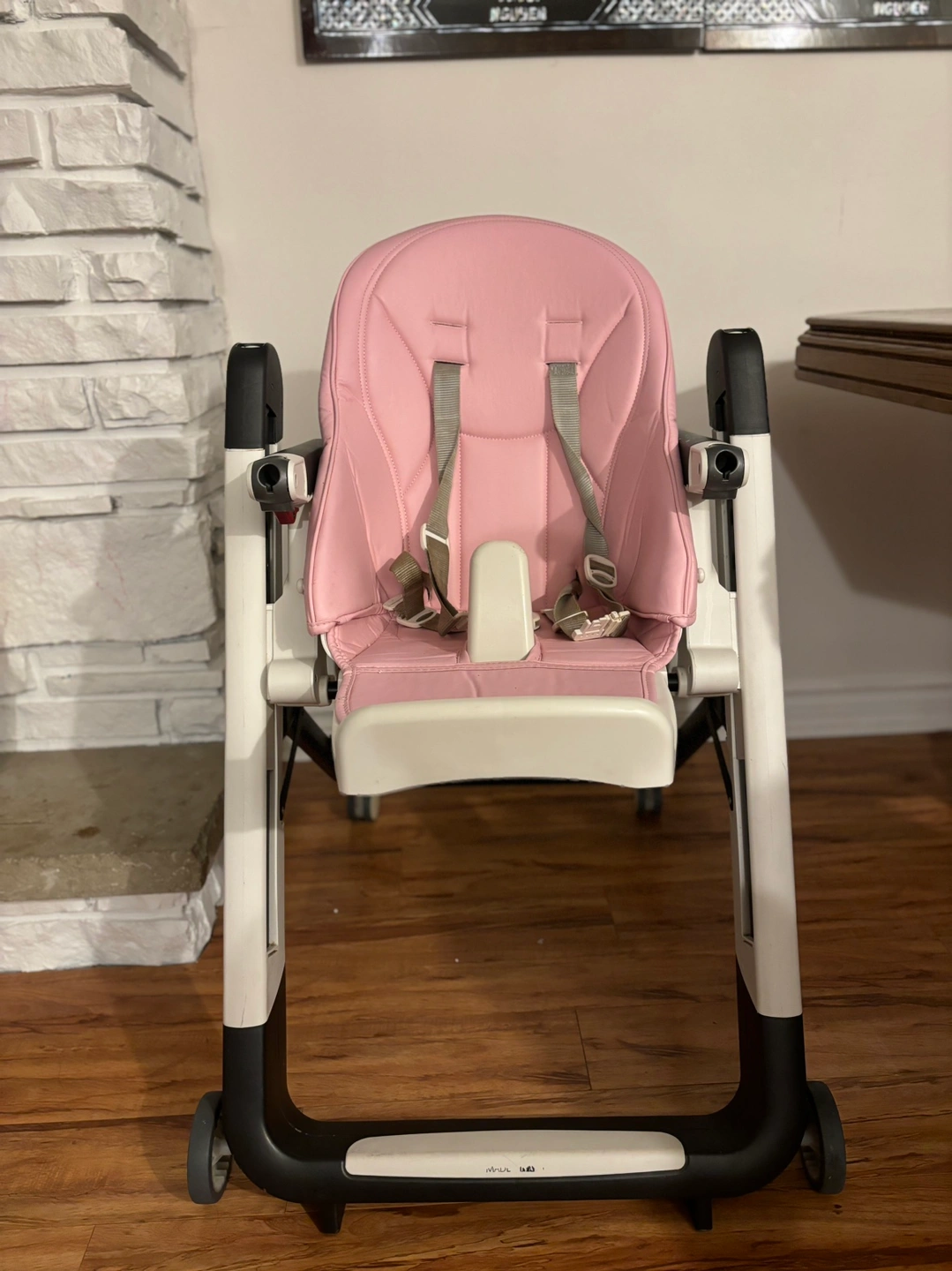 The brand of the highchair is Peg Perego and the pink seat insert is new from Amazon. Comes with a removable tray. You can adjust the height of the chair and incline/recline the seat. The chair is also foldable if you need to move it around.