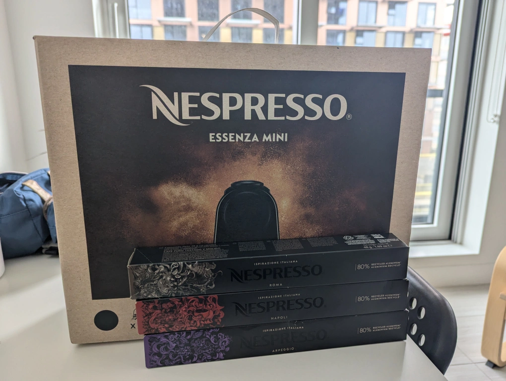 Nespresso Essenza Mini coffee machine. Includes three boxes of Nespresso capsules: Roma, Napoli, and Arpeggio. New and unused.