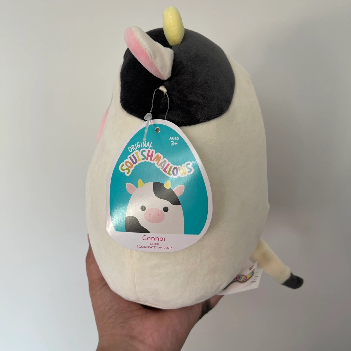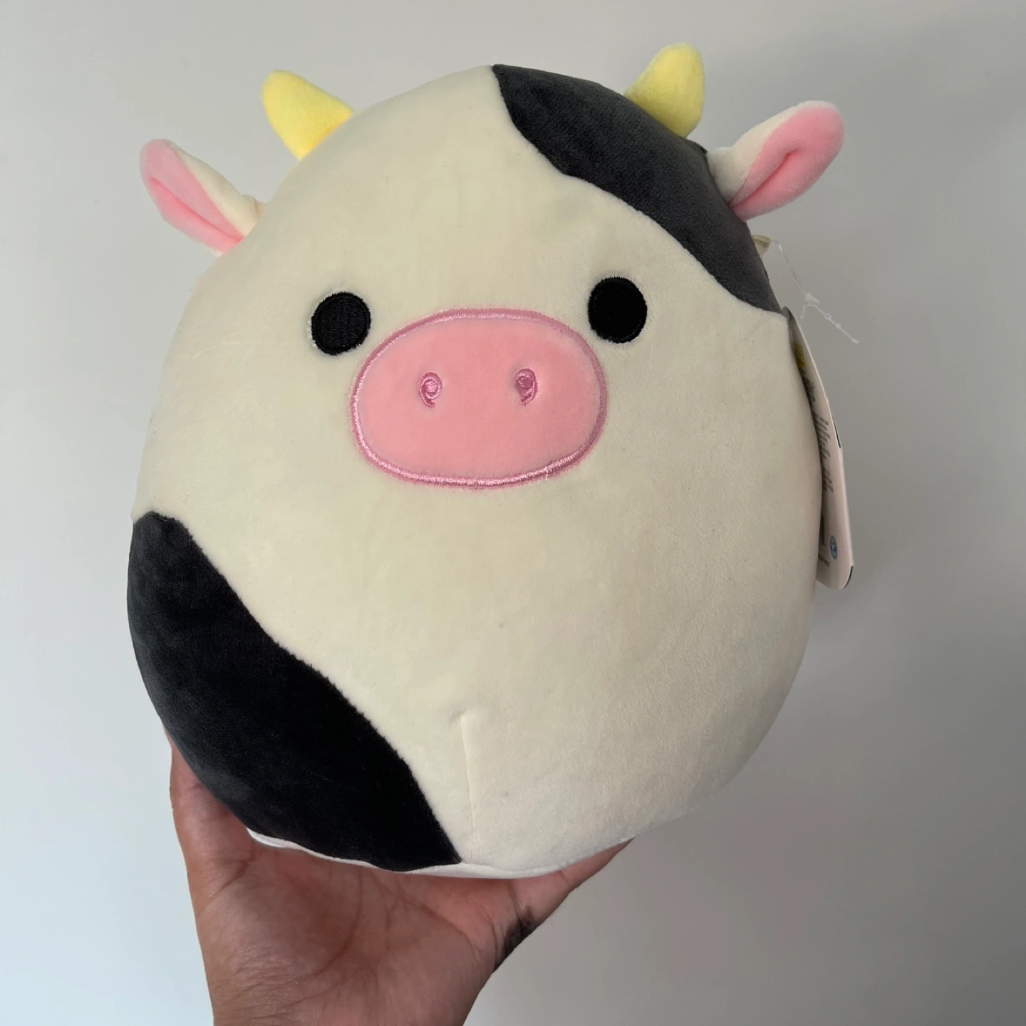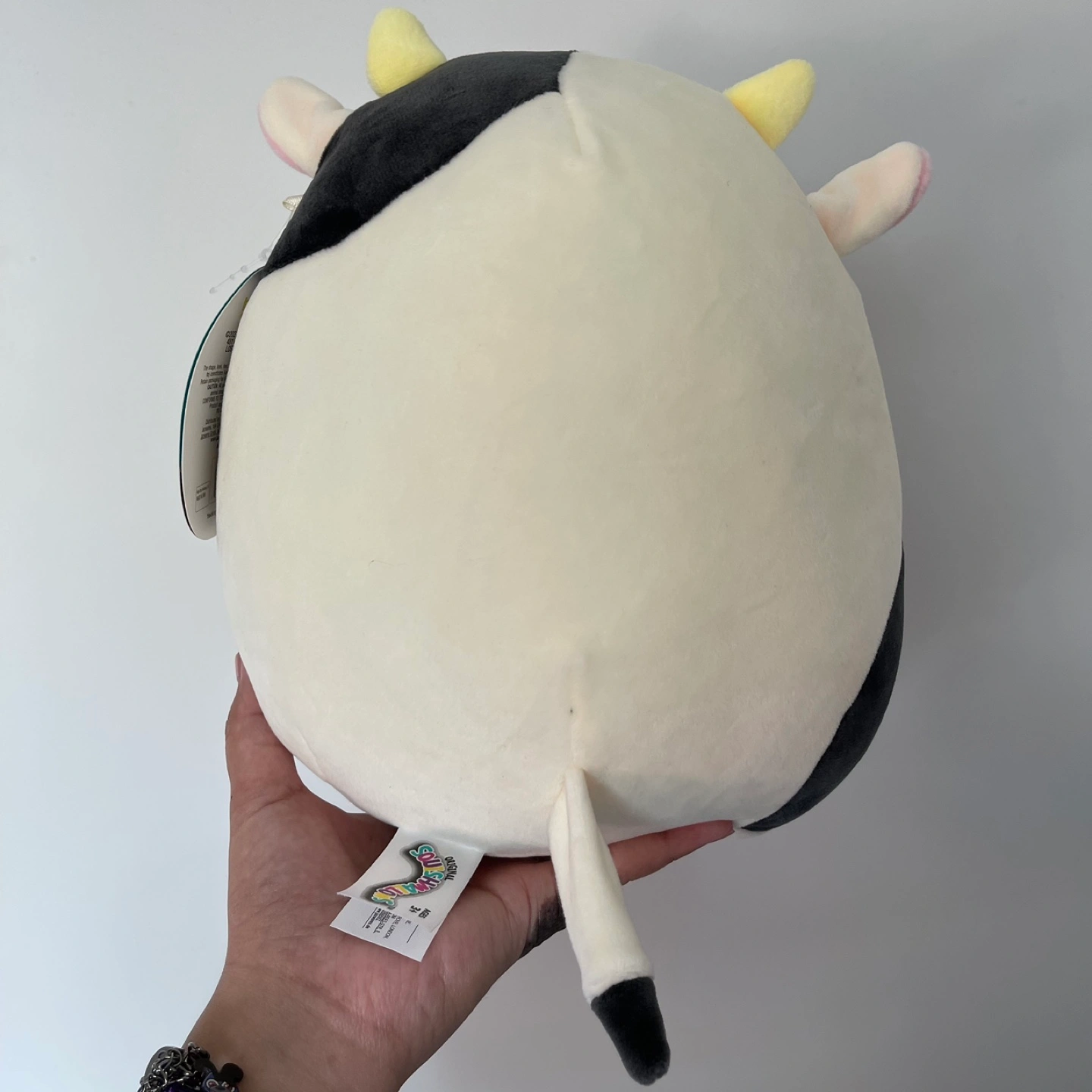 White and black cow plush with a pink nose, black eyes, and yellow horns. Comes with a tag.