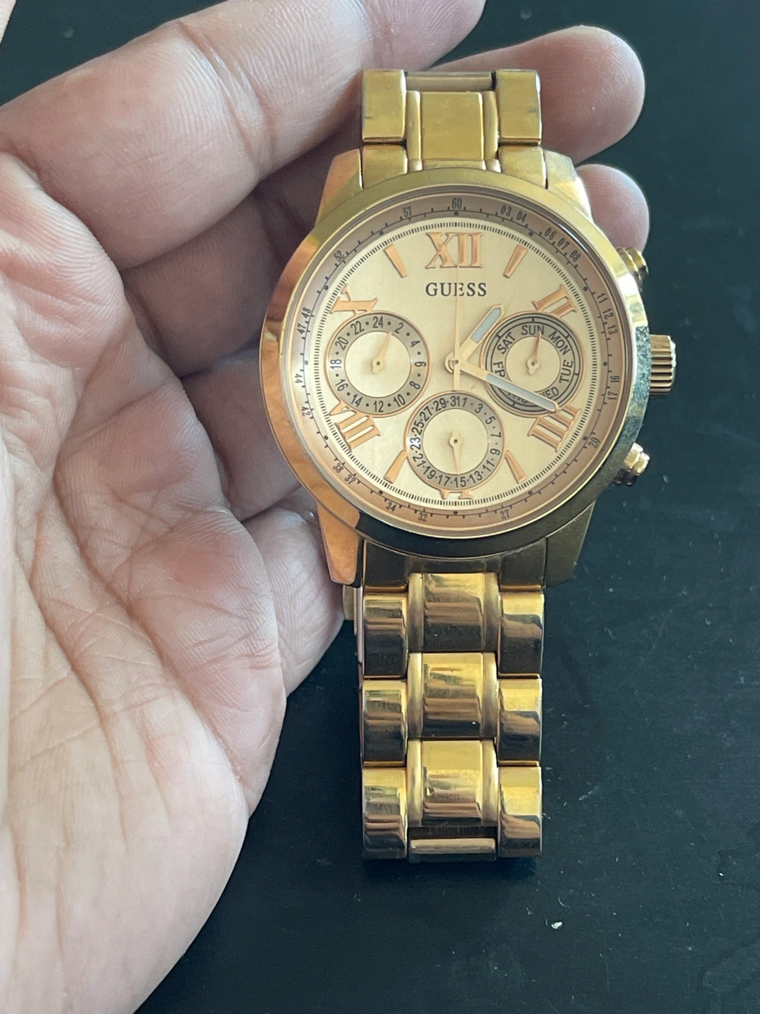 Gold-tone watch with a chronograph function, date display, and day of the week display. Requires a new battery.