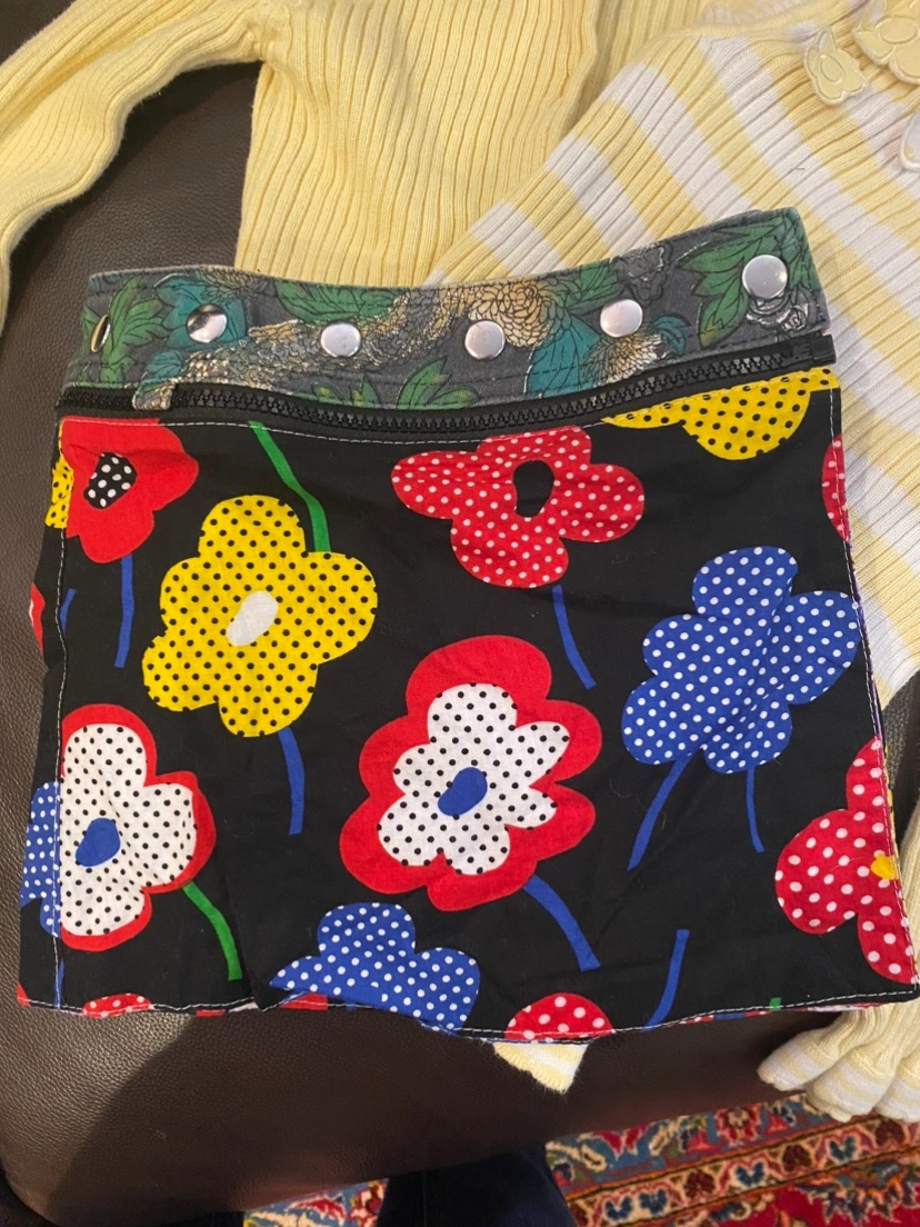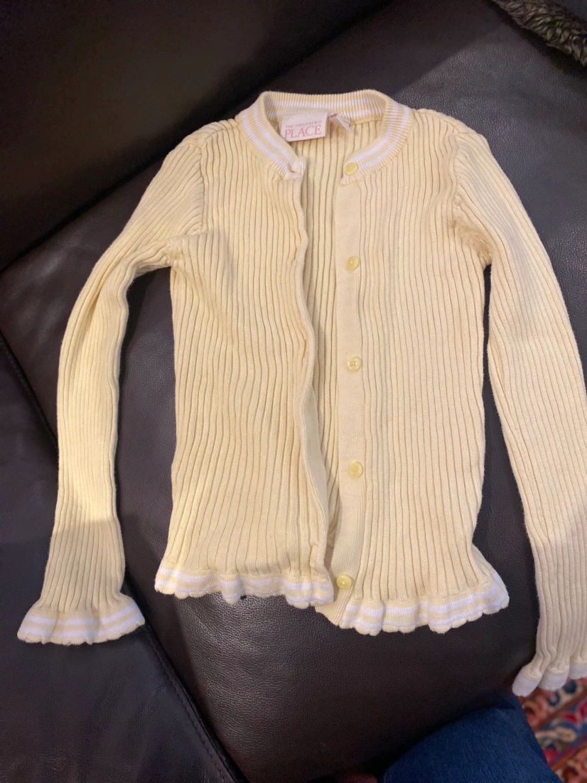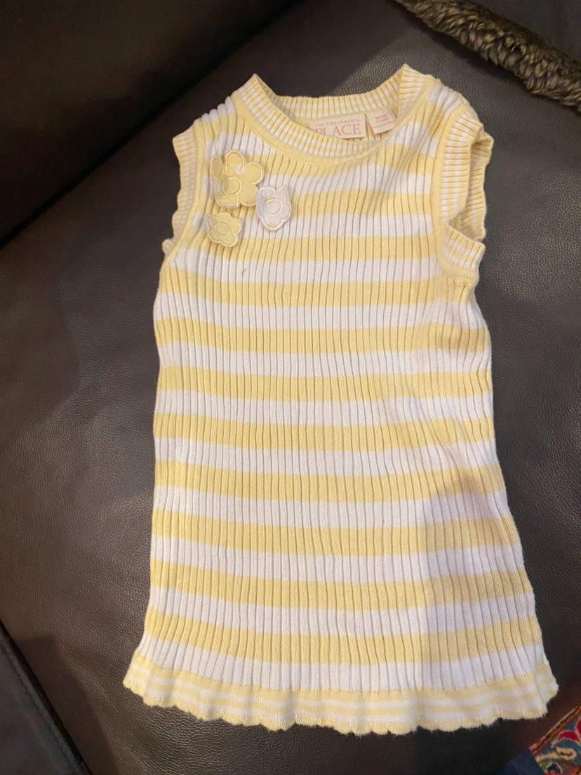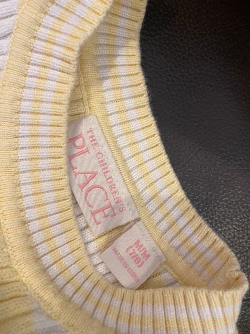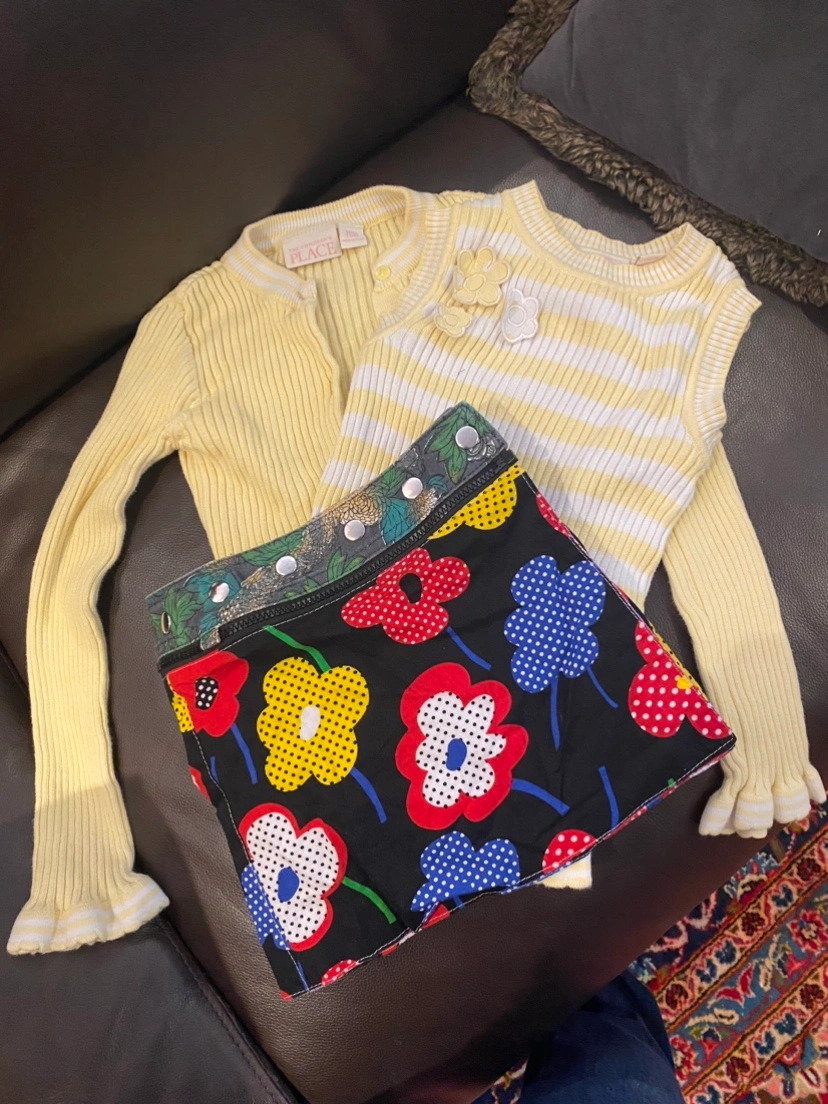 Yellow and white striped sleeveless top, yellow cardigan with white trim, and black floral skirt. Sizes 6/7 skirt and 7/8 sweater set. Sweater set from children’s place 100%cotton.