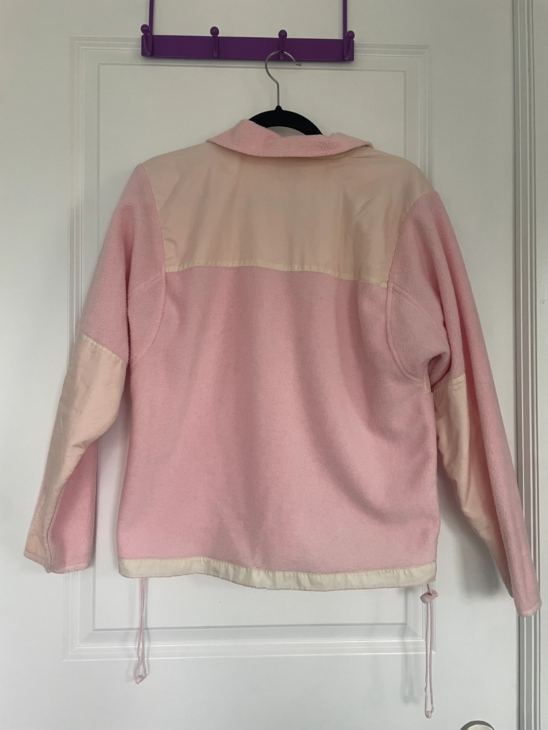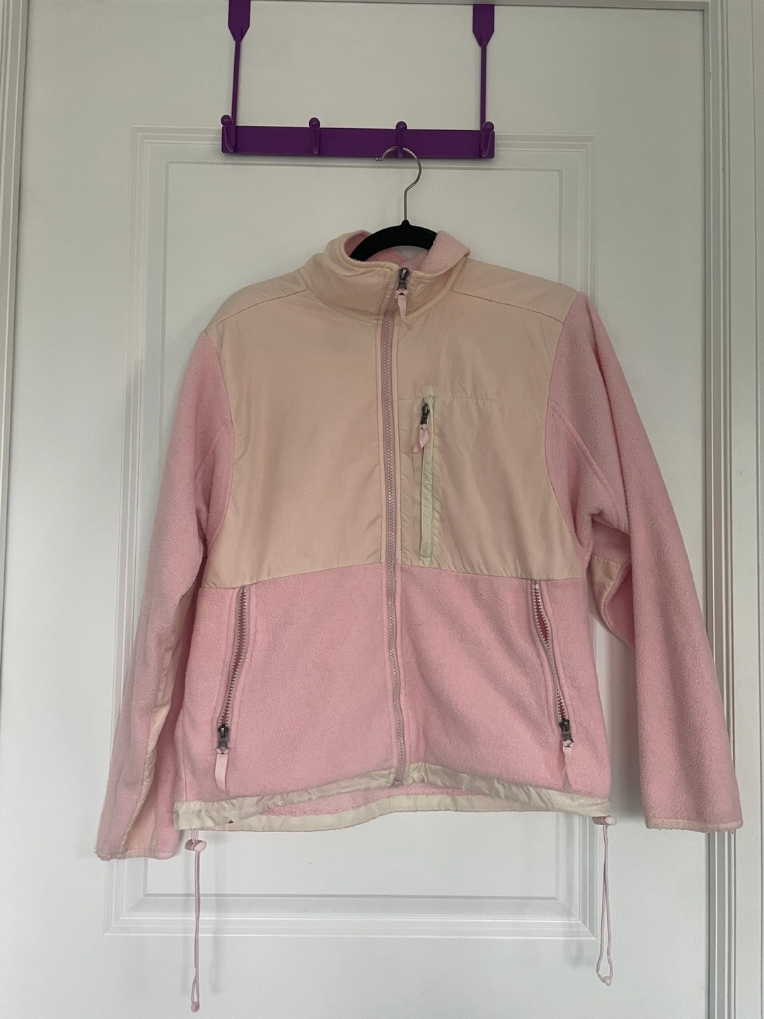 Size M, pink and white fleece jacket with zipper and two pockets. Bottom elastics are a bit stretched out but otherwise in great condition.