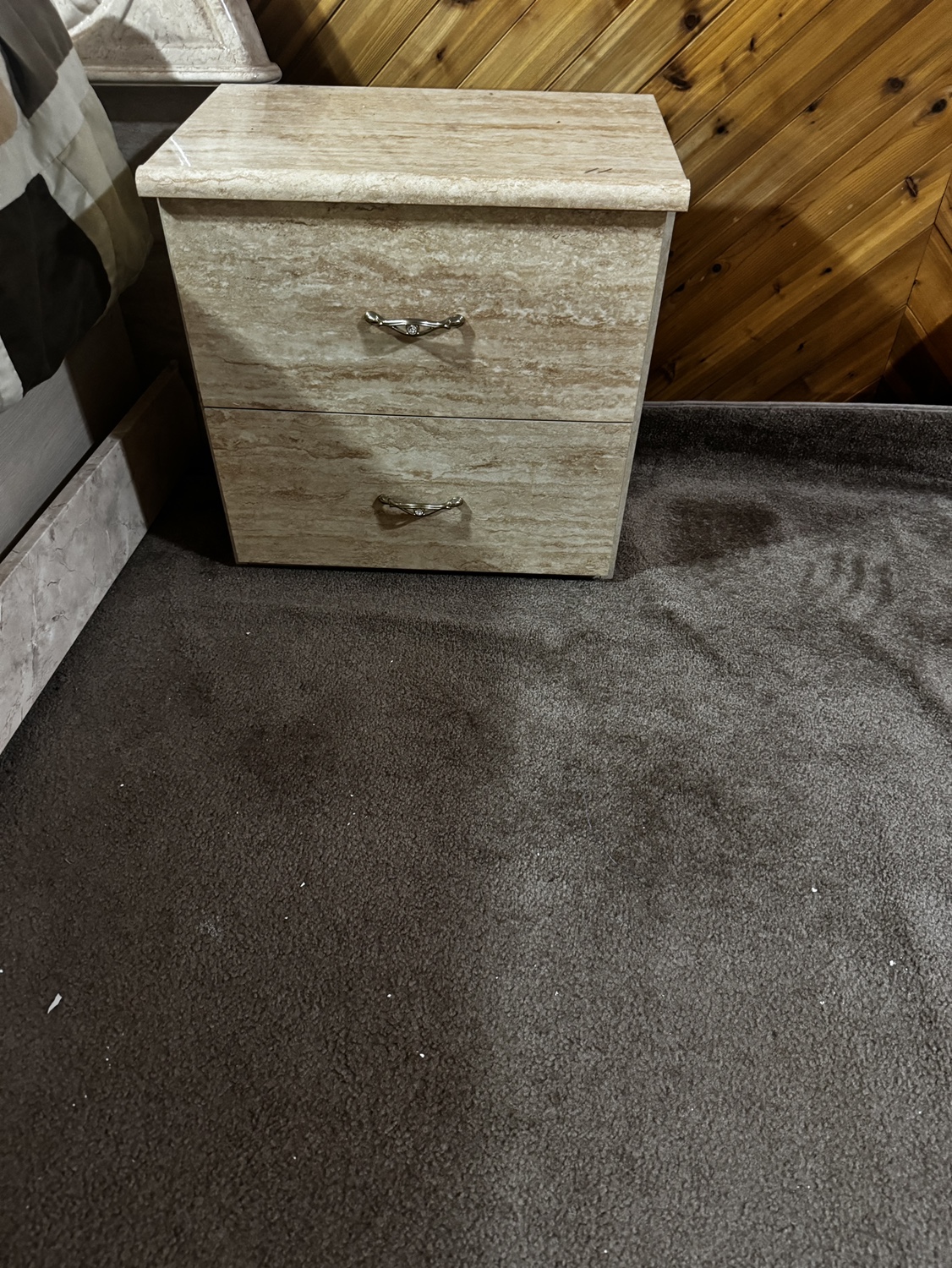 Two-drawer nightstand with marble-look finish. Matching dresser also available with mirror