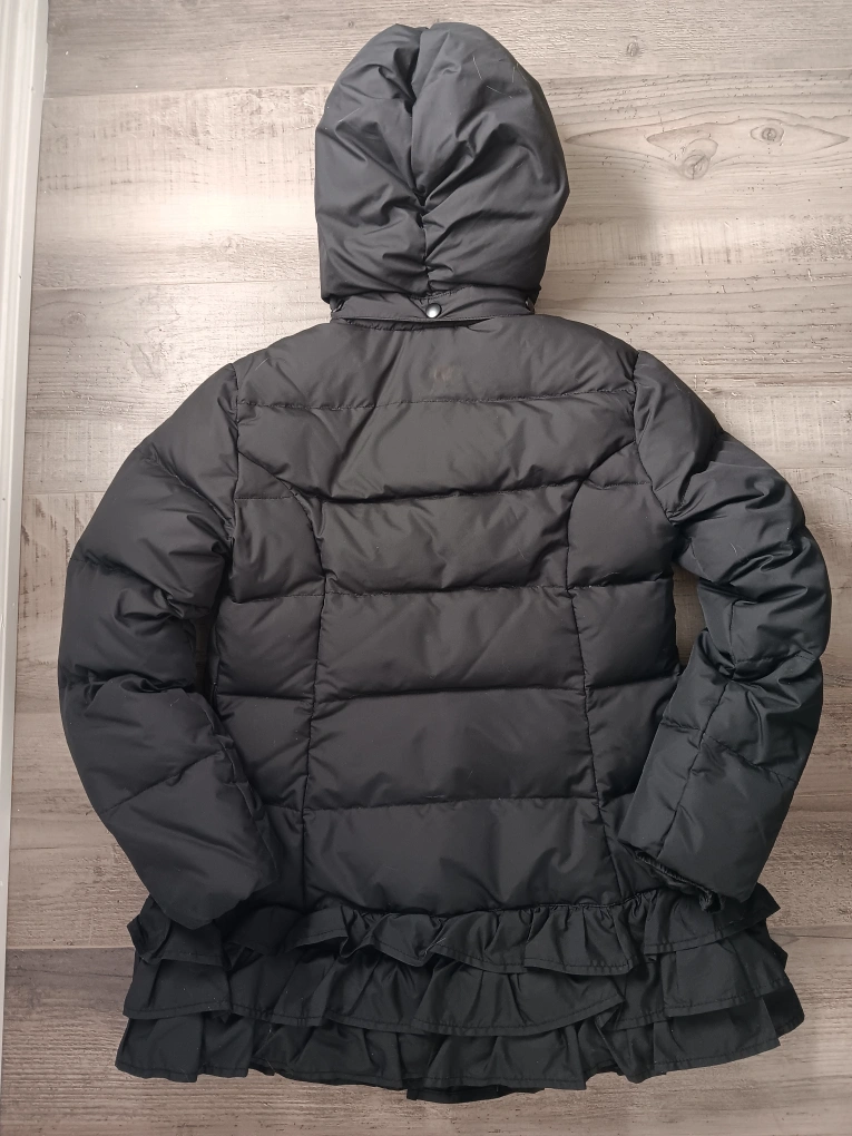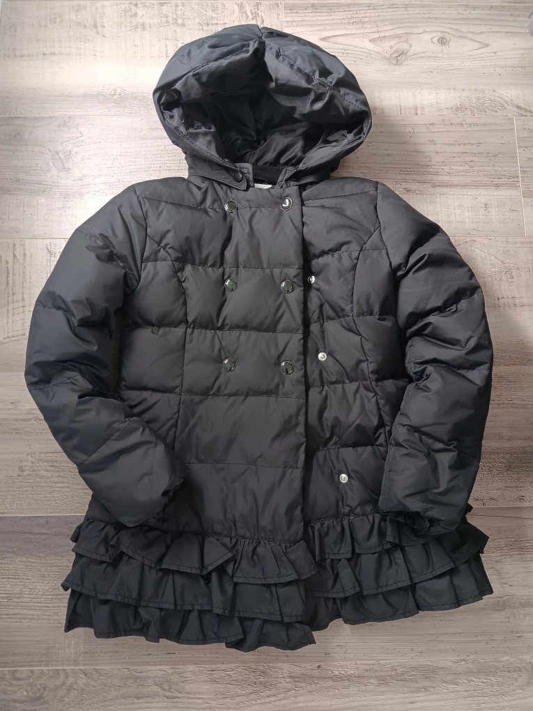 Gymboree down filled black puffer jacket with a ruffle hem. Features a hood. Size Large.