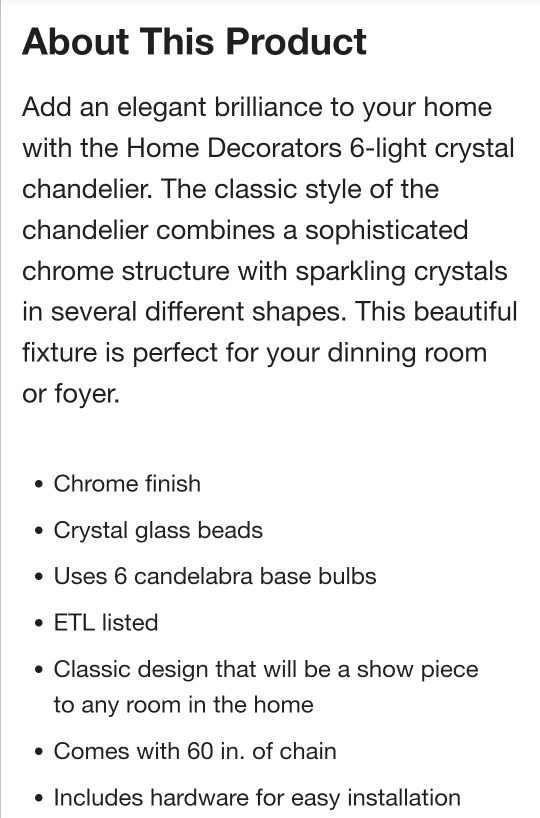 Chrome finish with crystal accents. Uses (6) B10 bulbs up to 60 watts (sold separately). 30 in H x 25 in diameter.