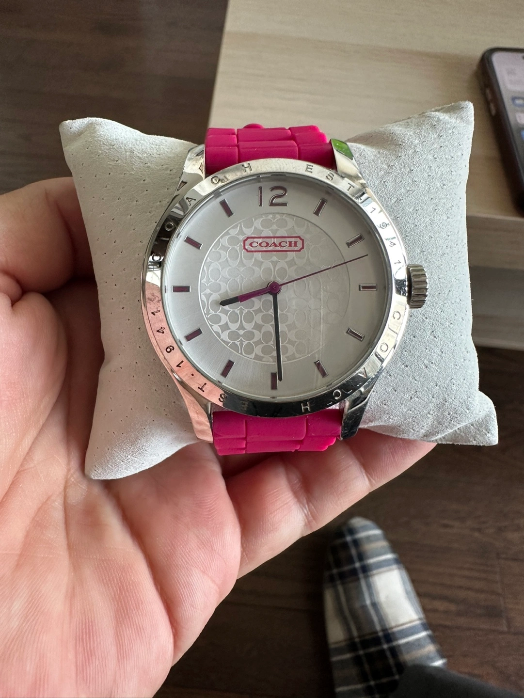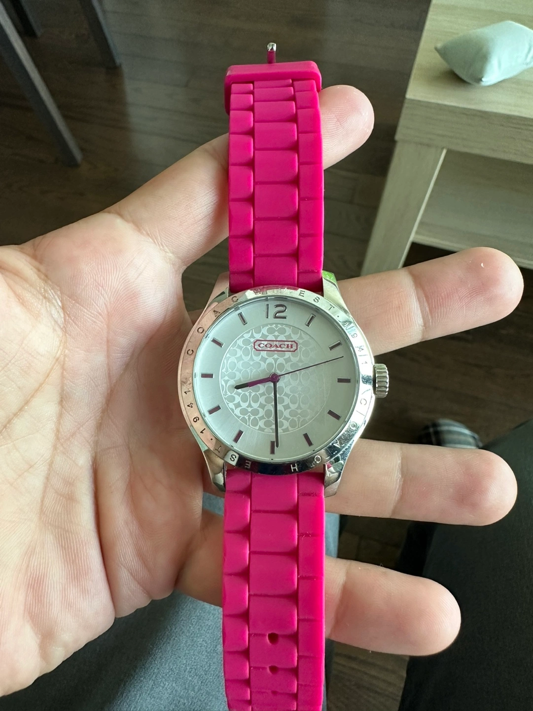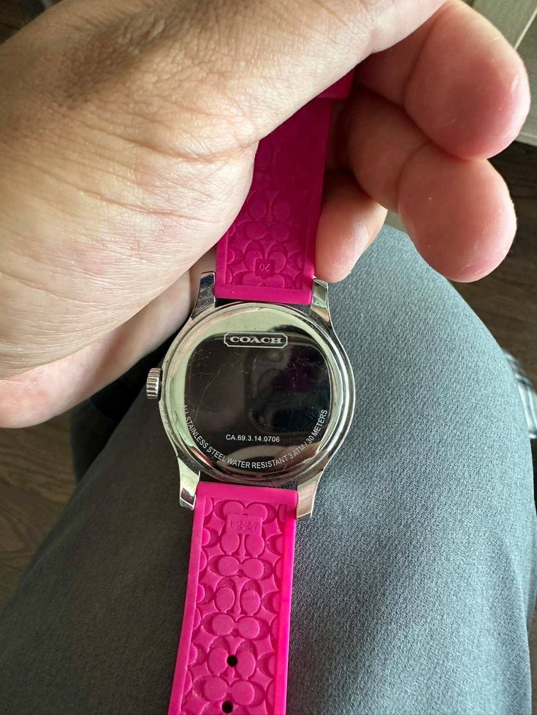 Great fashion Silver Coach watch with a pink silicone band. It will look great on your wrist. Face is white and features a silver Coach logo.