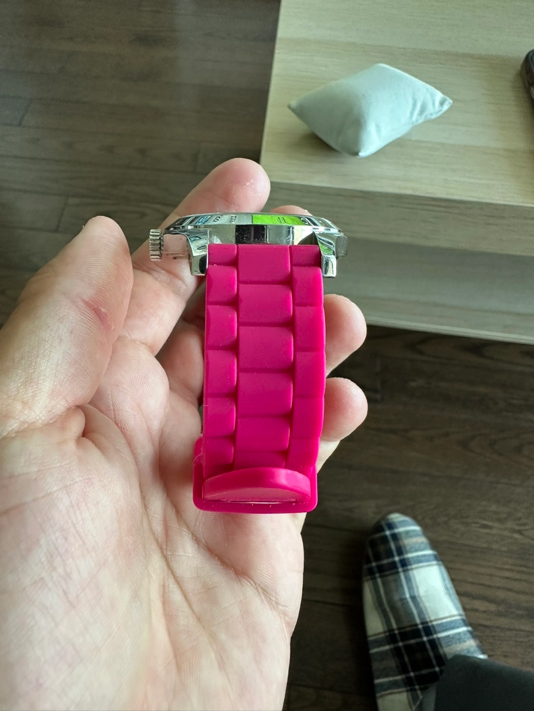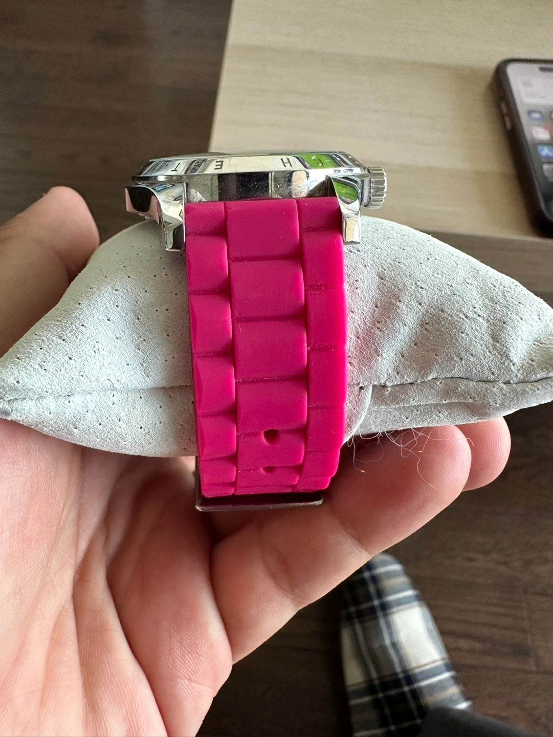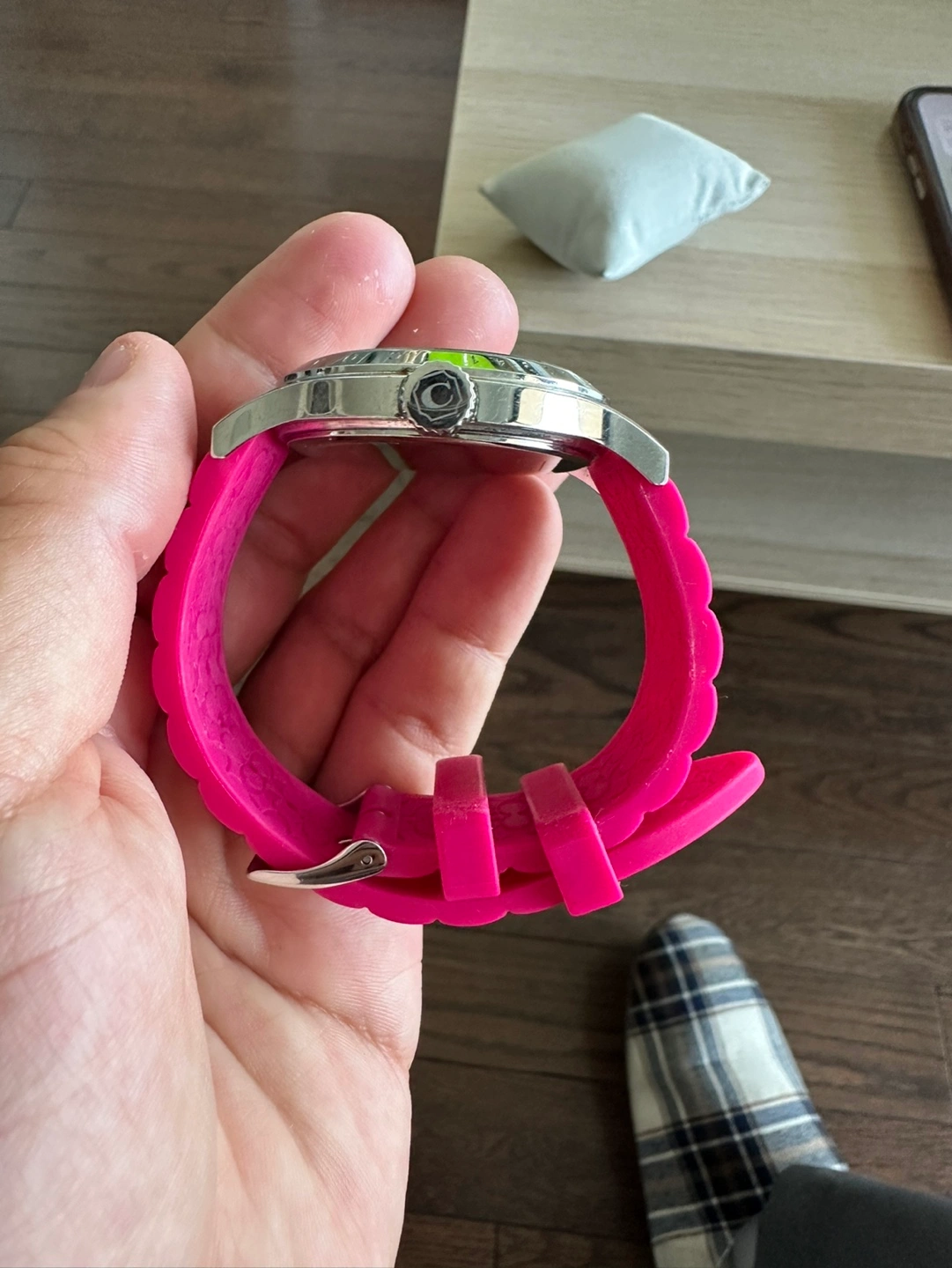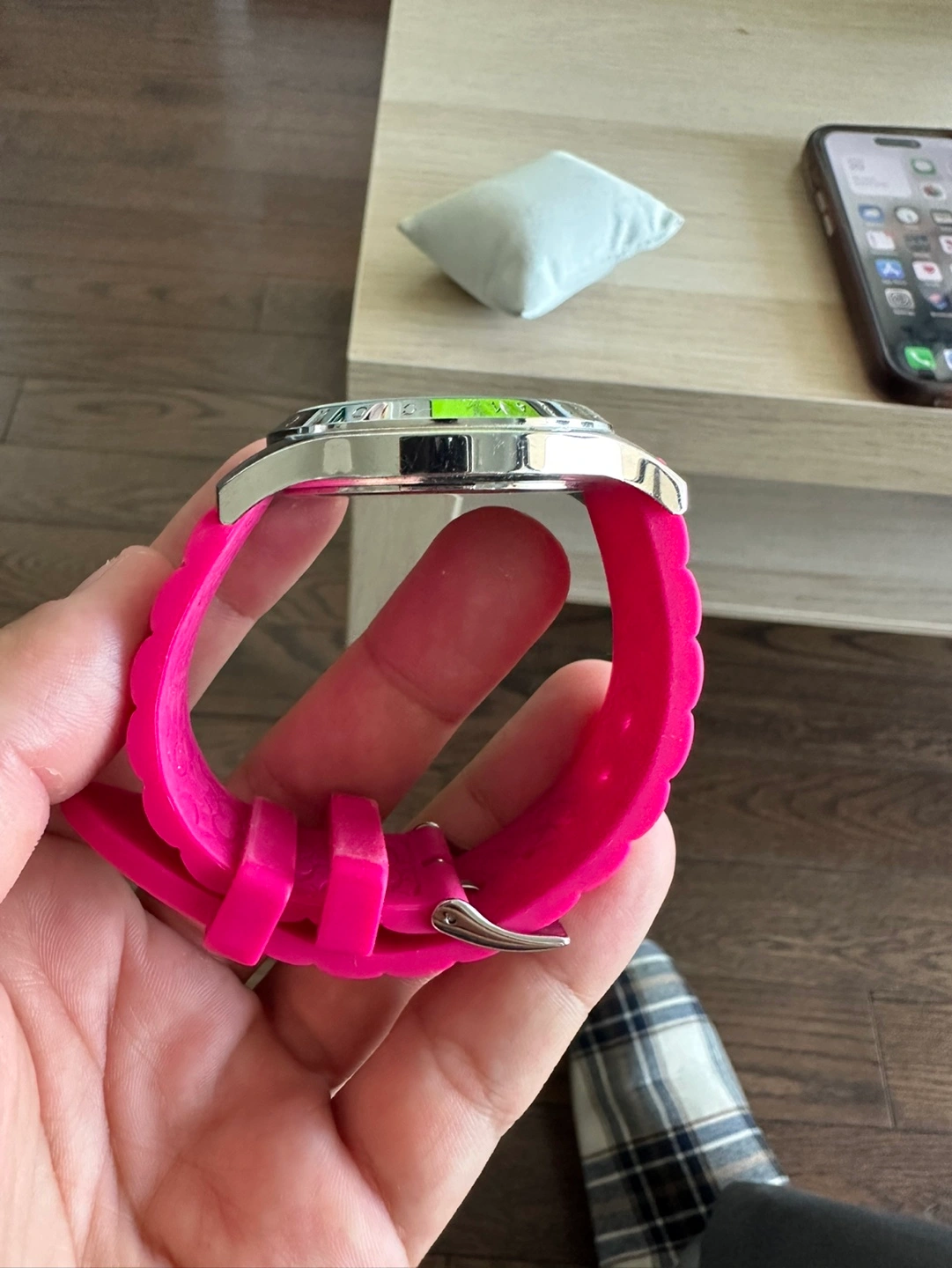 Great fashion Silver Coach watch with a pink silicone band. It will look great on your wrist. Face is white and features a silver Coach logo.