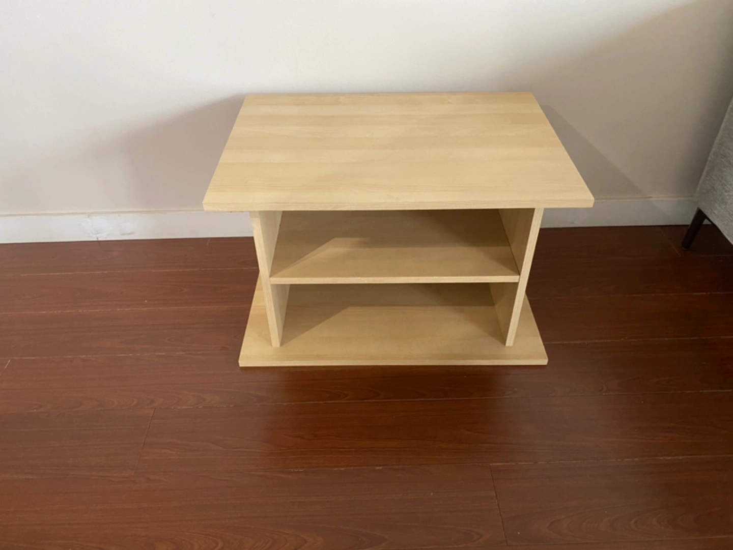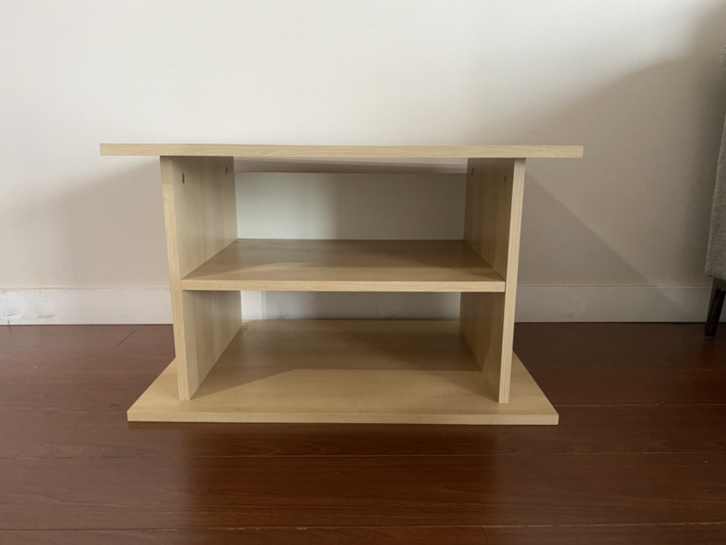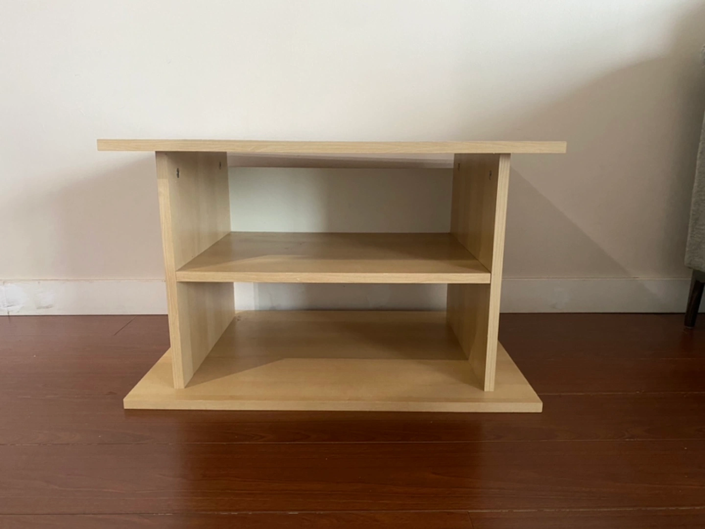 Small wooden shelf unit with two shelves. Good for storing books, electronics, or other small items. In good condition.