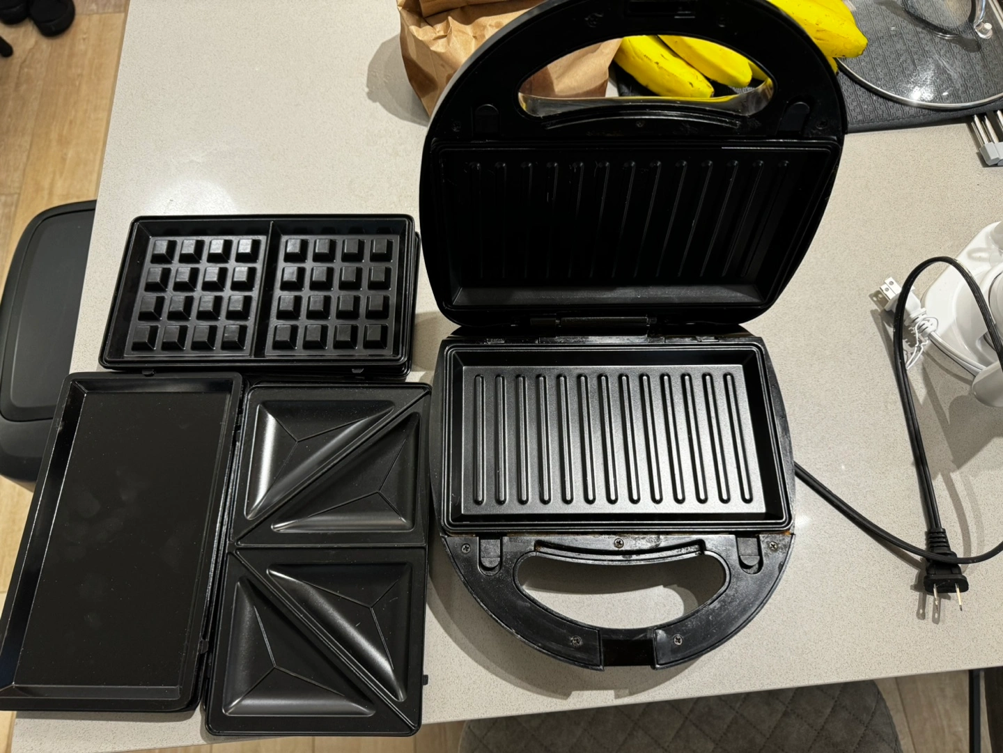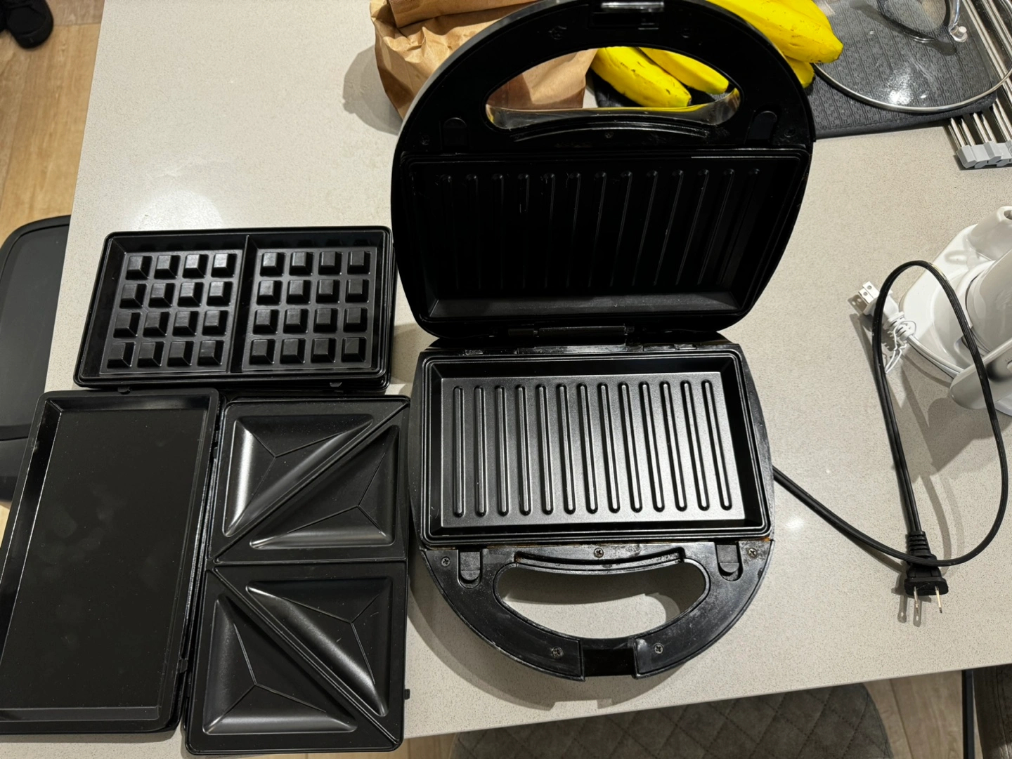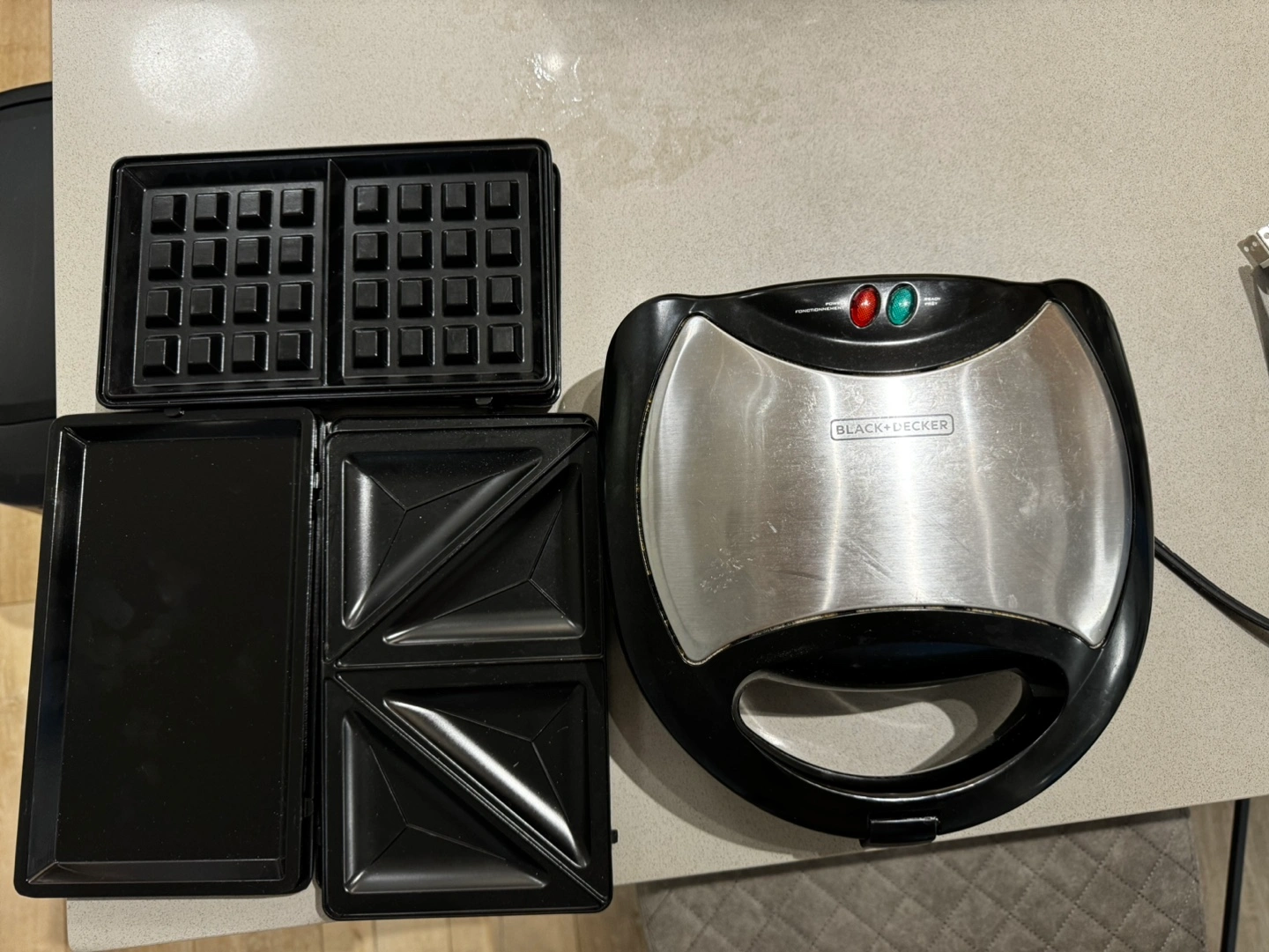 Black + Decker 4-in-1 electric appliance. Includes removable plates for making waffles, sandwiches, and grilling.