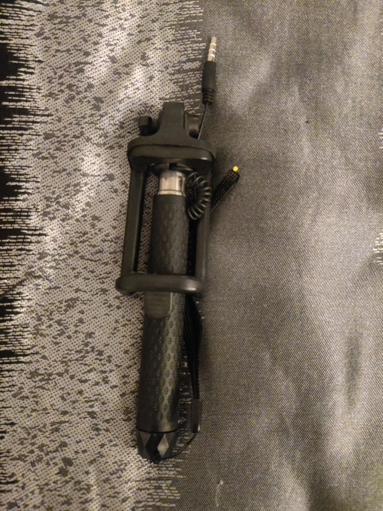 Black selfie stick with wired remote. Extends to about 30cm. Comes with a carrying strap as attached