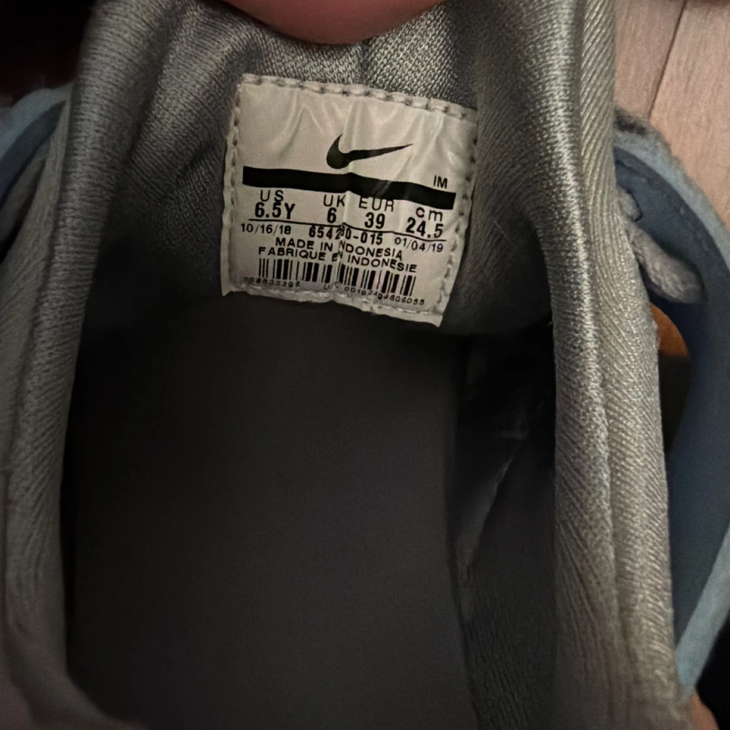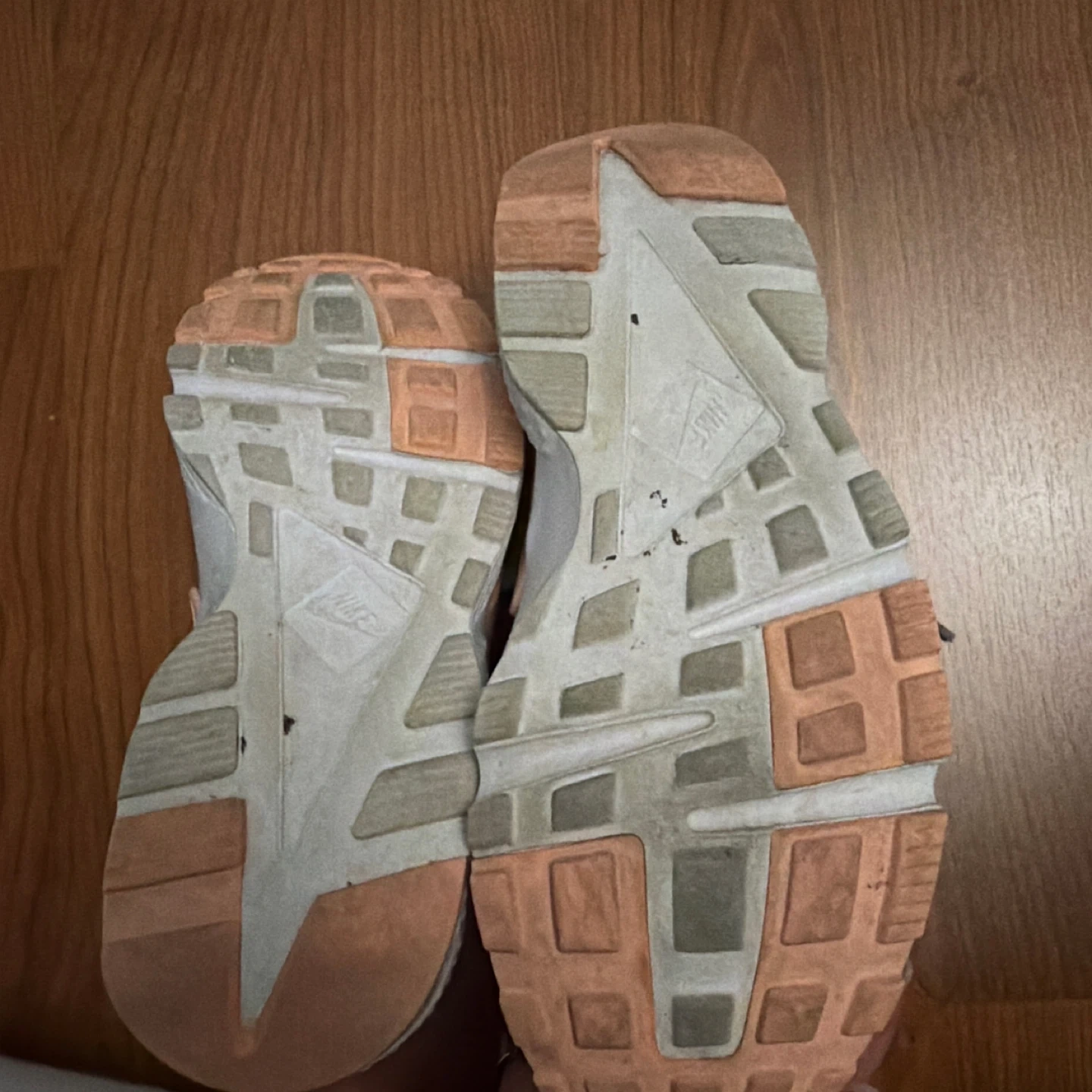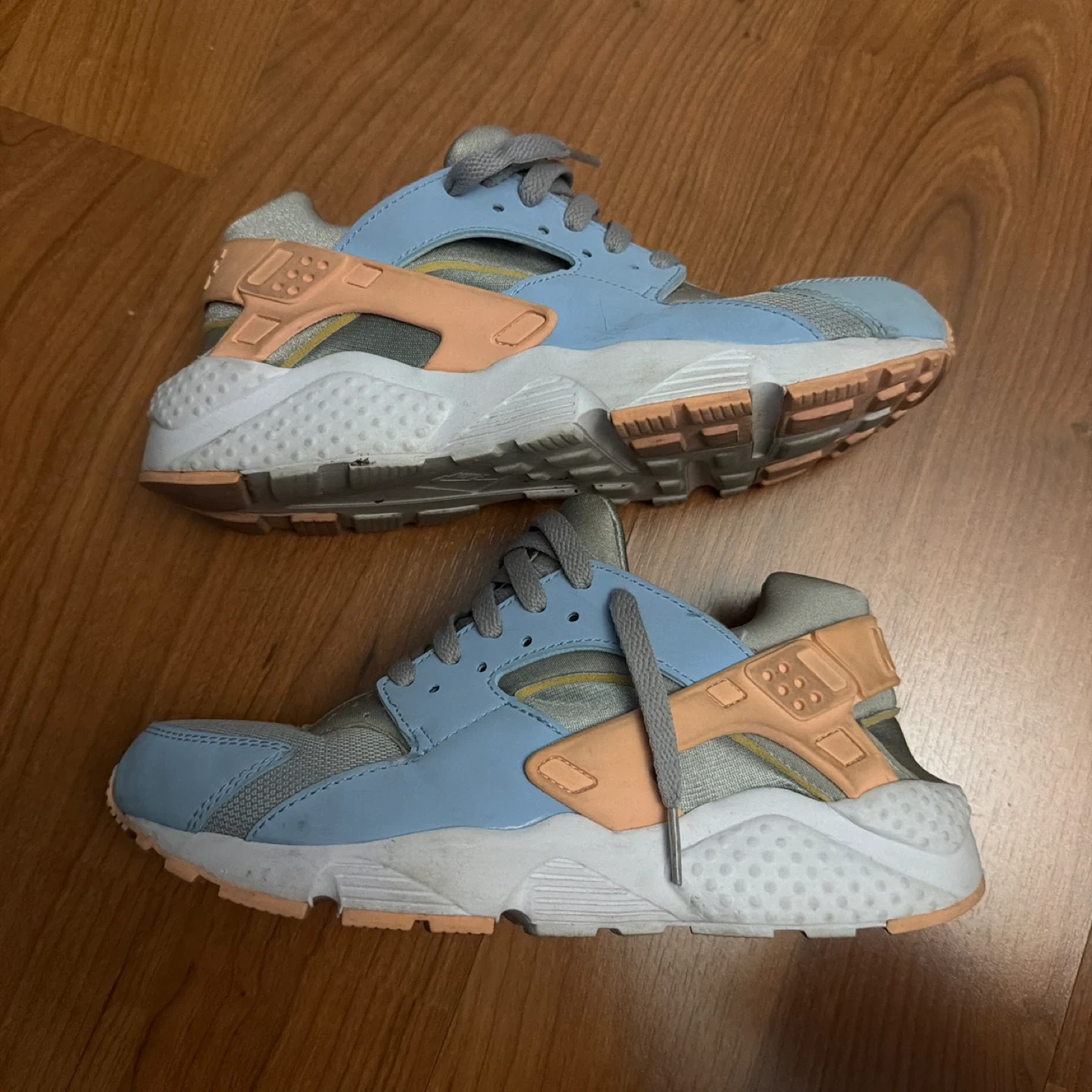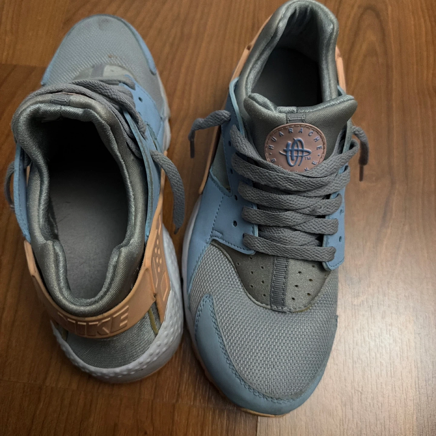 These are Nike Air Huarache youth shoes in a size 6.5Y. They're a mix of gray, light blue, and pale pink. These sneakers are great for everyday wear!