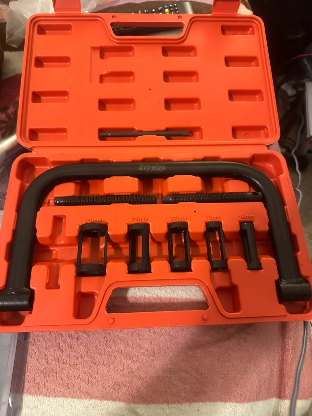 This is a valve spring compressor tool set. It includes various sizes for different applications. Comes in a durable red carrying case. Essential for engine maintenance and repair!