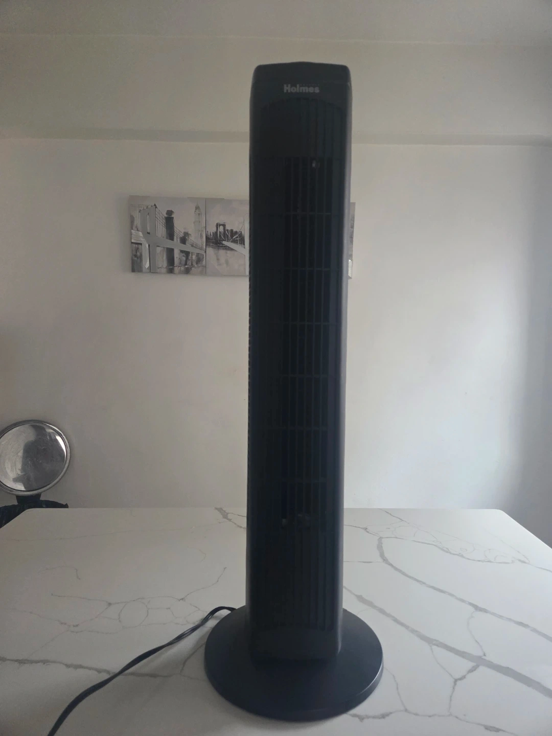 Holmes tower fan in black. It has multiple speed settings and is easy to use. Perfect for cooling down a room!