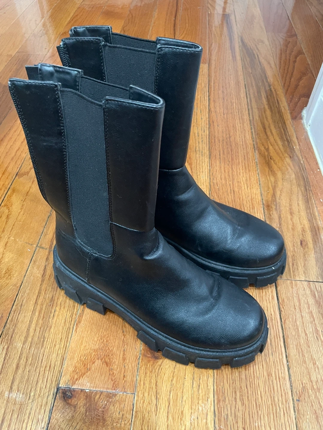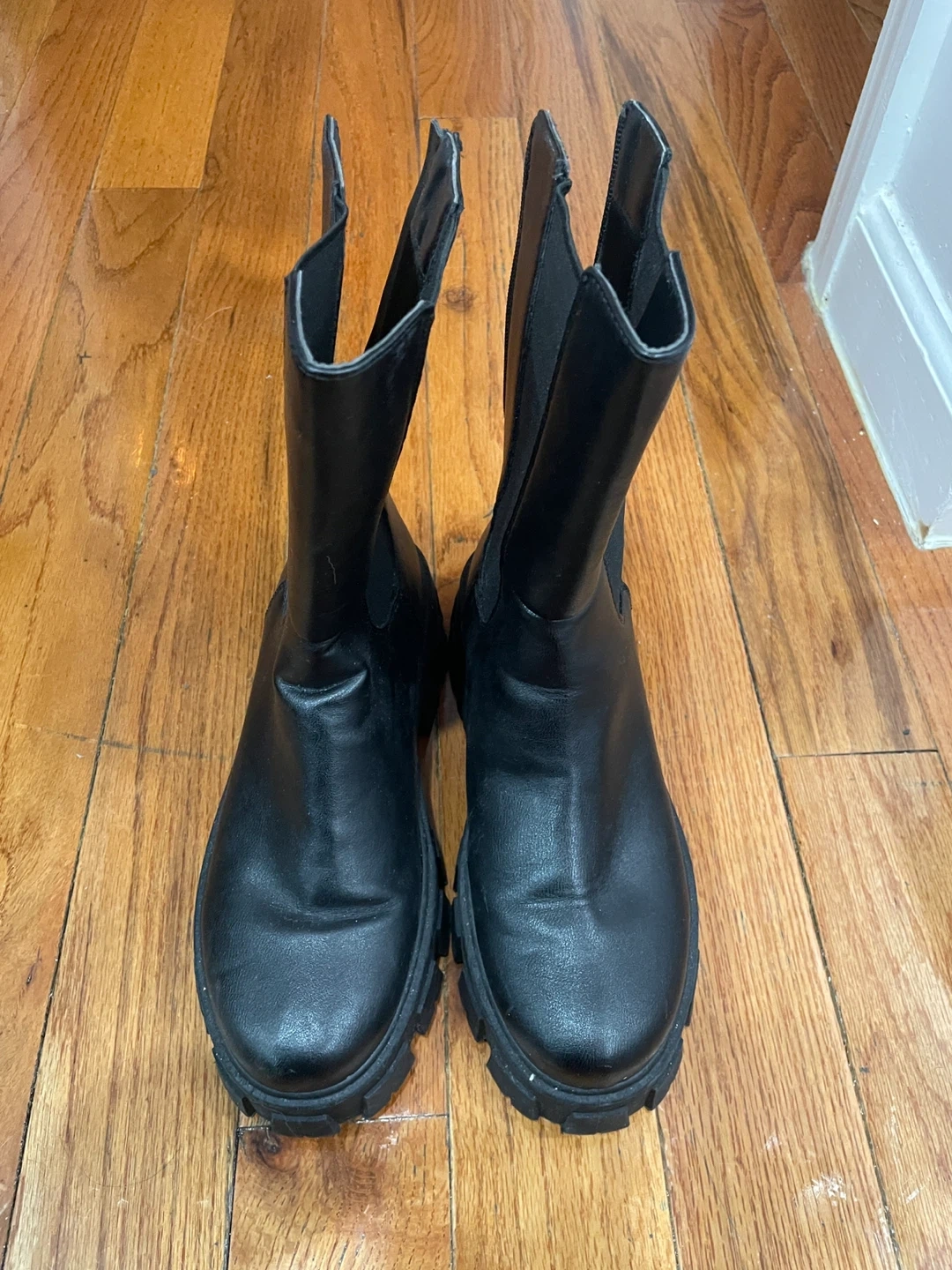 Black Chelsea boots with elastic side panels and a lug sole. These boots are made of faux leather. They feature a pull-on design with a side zipper. They're perfect for everyday wear.