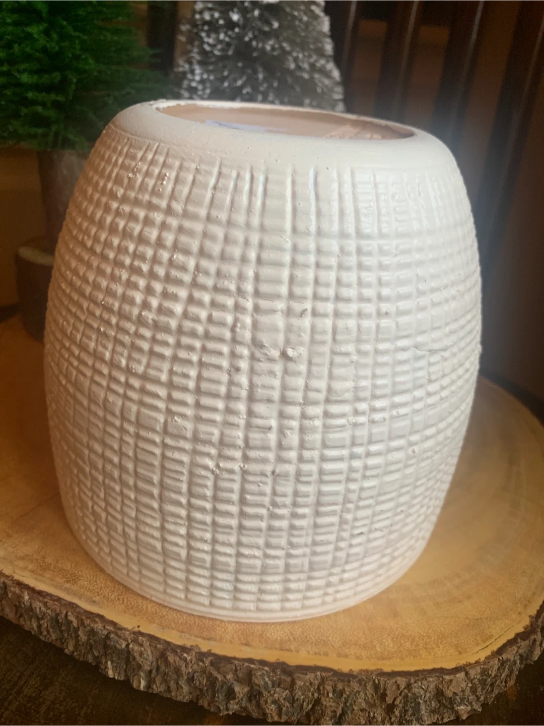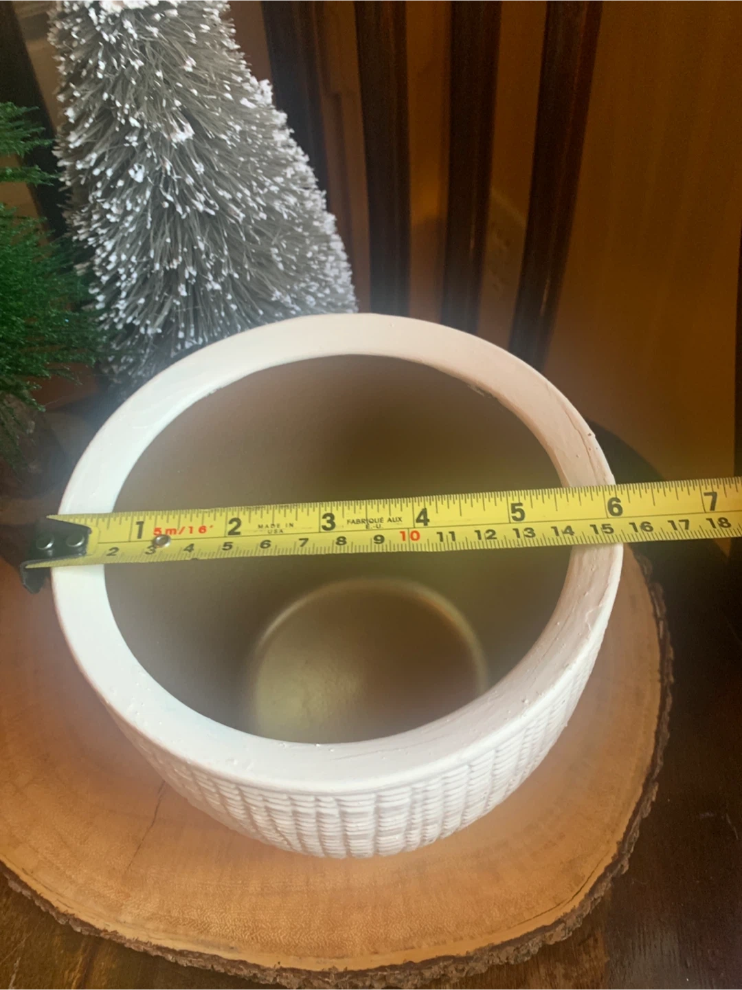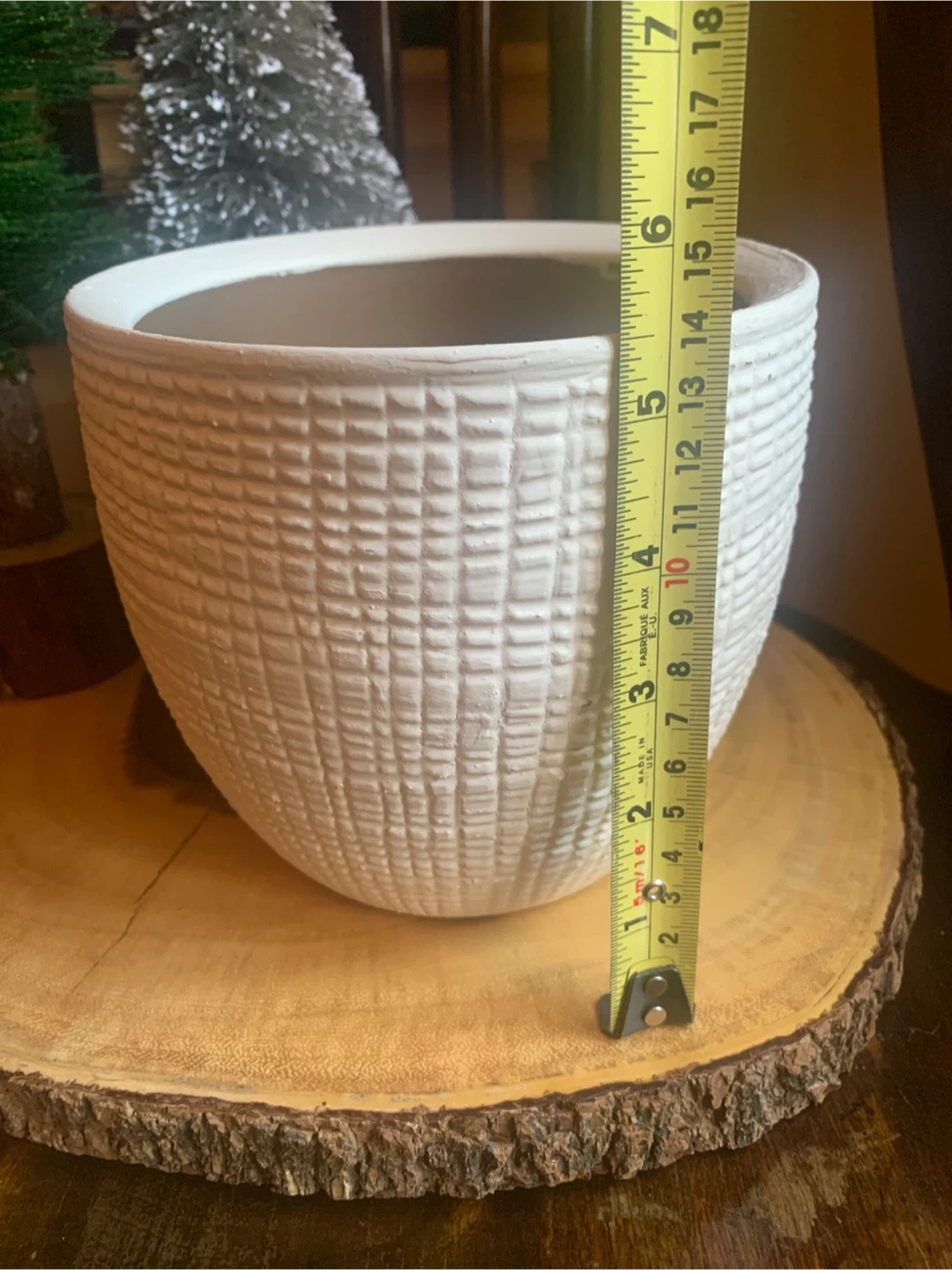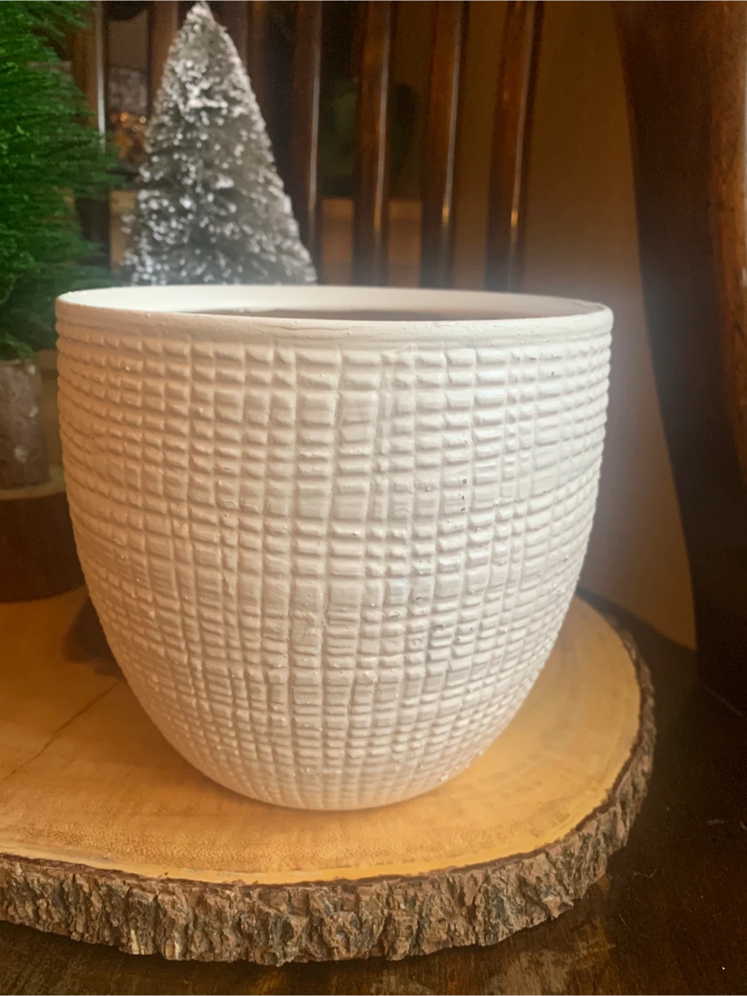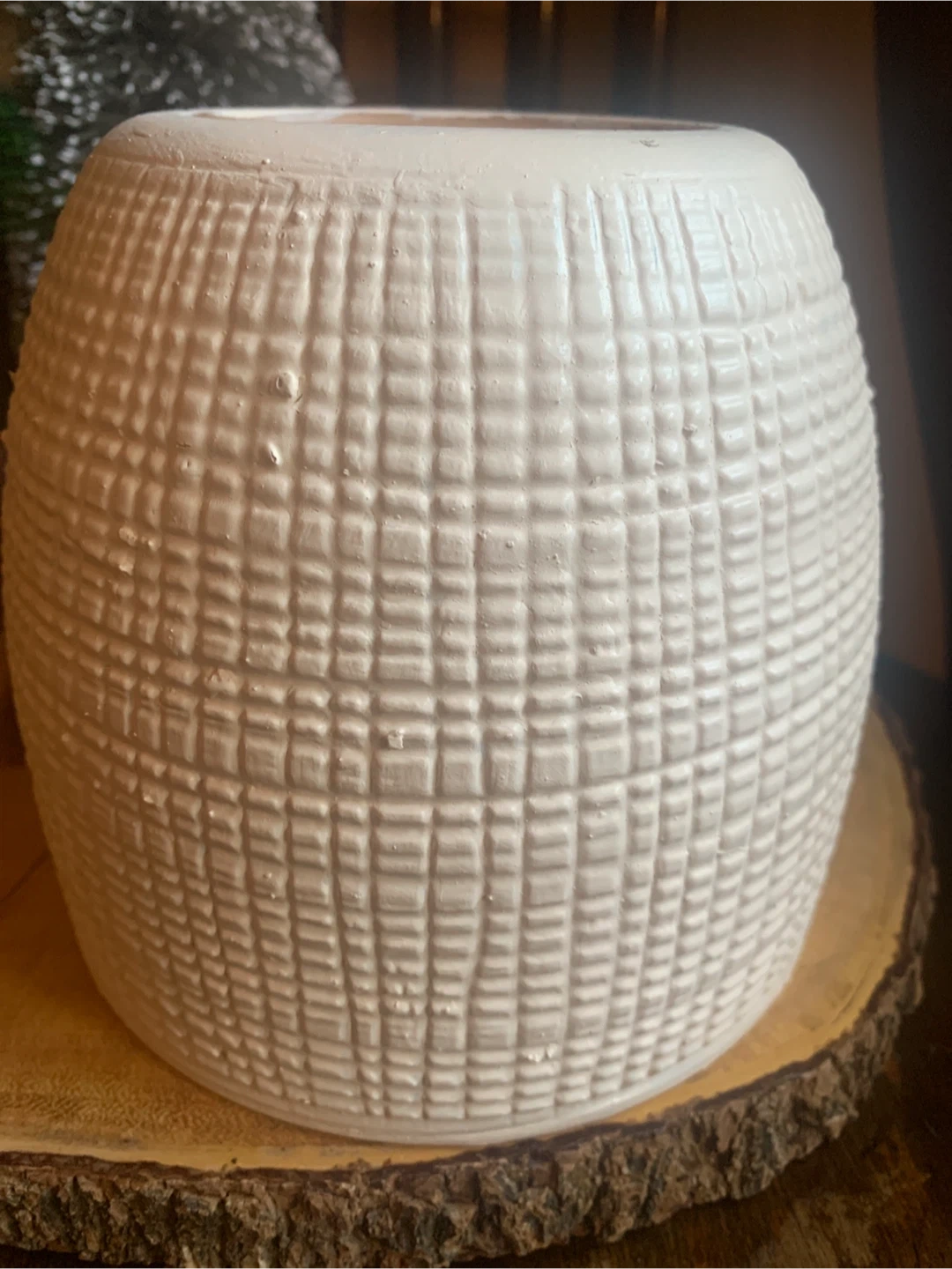 Lovely cream ceramic planter pot with a textured basket weave design. Made in German by Scheurich. Inside is glazed in gold. This pot's neutral colour and classic shape make it a versatile addition to any home decor. It has a few places where the glaze is worn off but no chips or cracks. It's a lovely piece for displaying plants. Would make a great shelf sitter on a stack of books in a bookshelf!