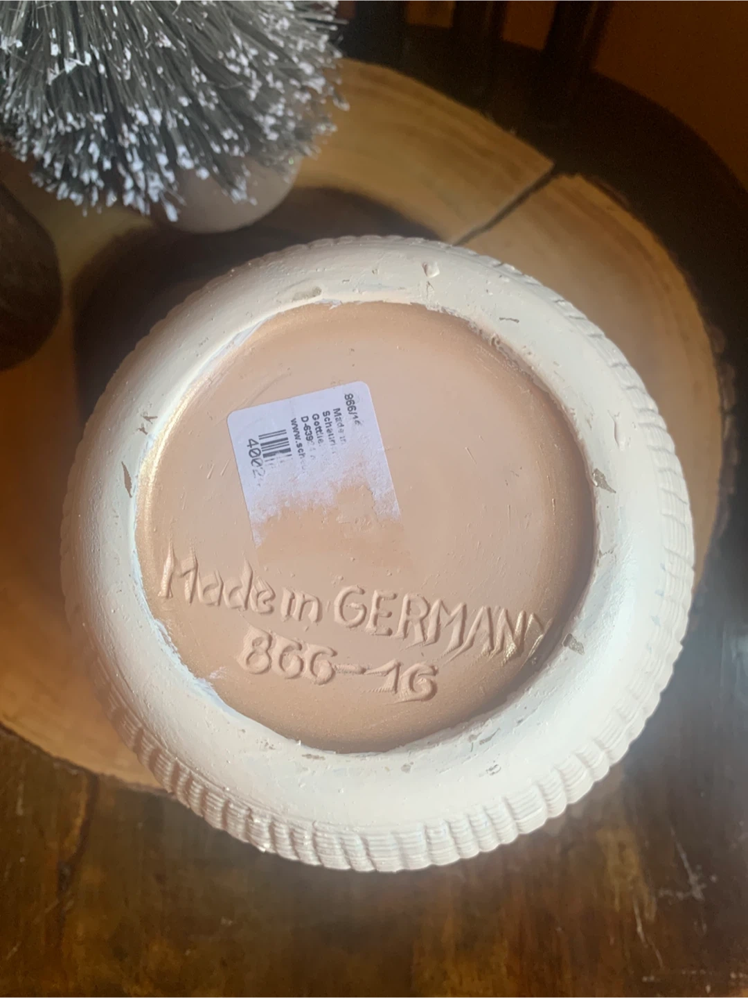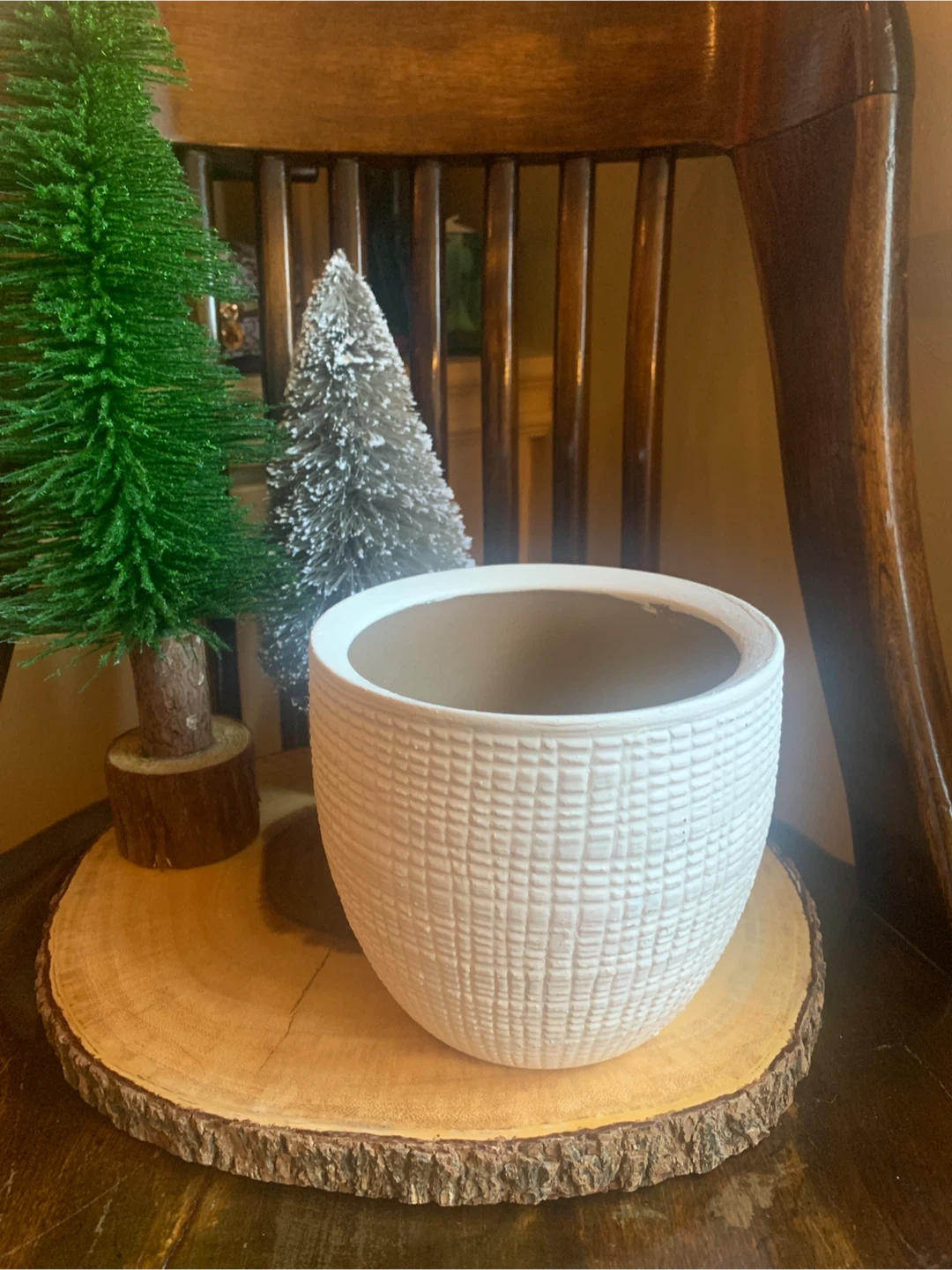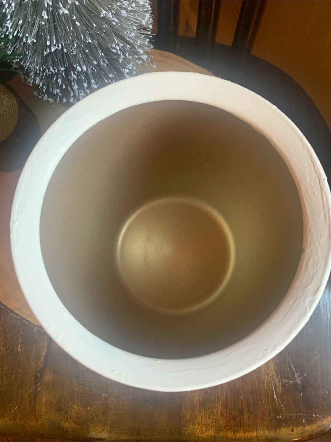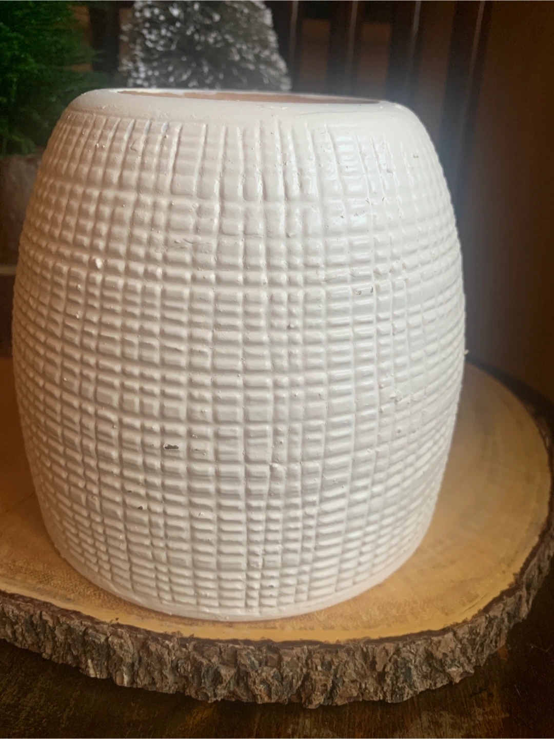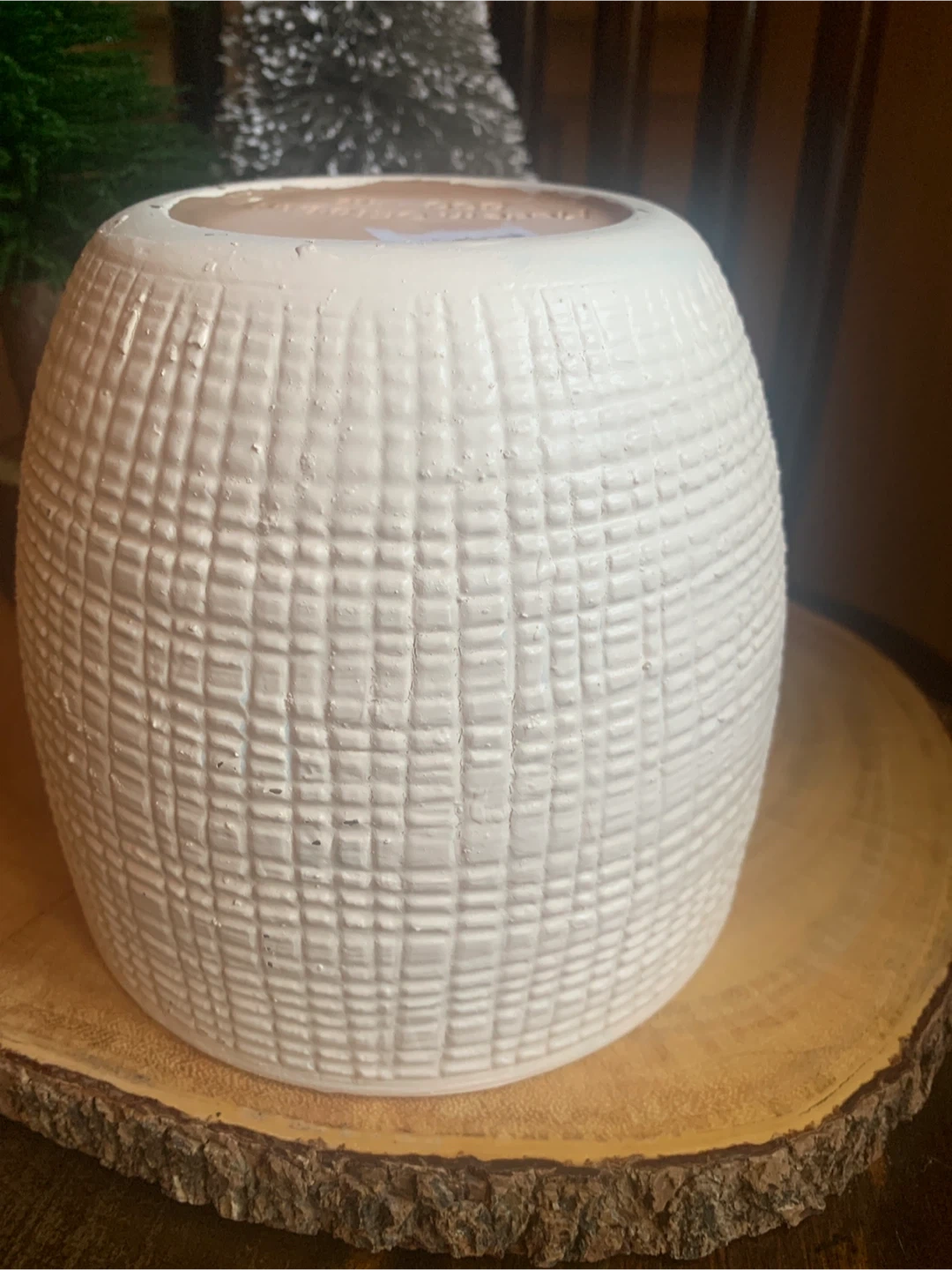 Lovely cream ceramic planter pot with a textured basket weave design. Made in German by Scheurich. Inside is glazed in gold. This pot's neutral colour and classic shape make it a versatile addition to any home decor. It has a few places where the glaze is worn off but no chips or cracks. It's a lovely piece for displaying plants. Would make a great shelf sitter on a stack of books in a bookshelf!