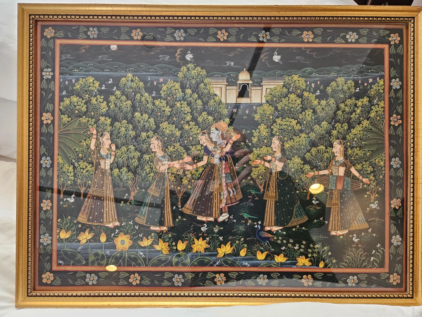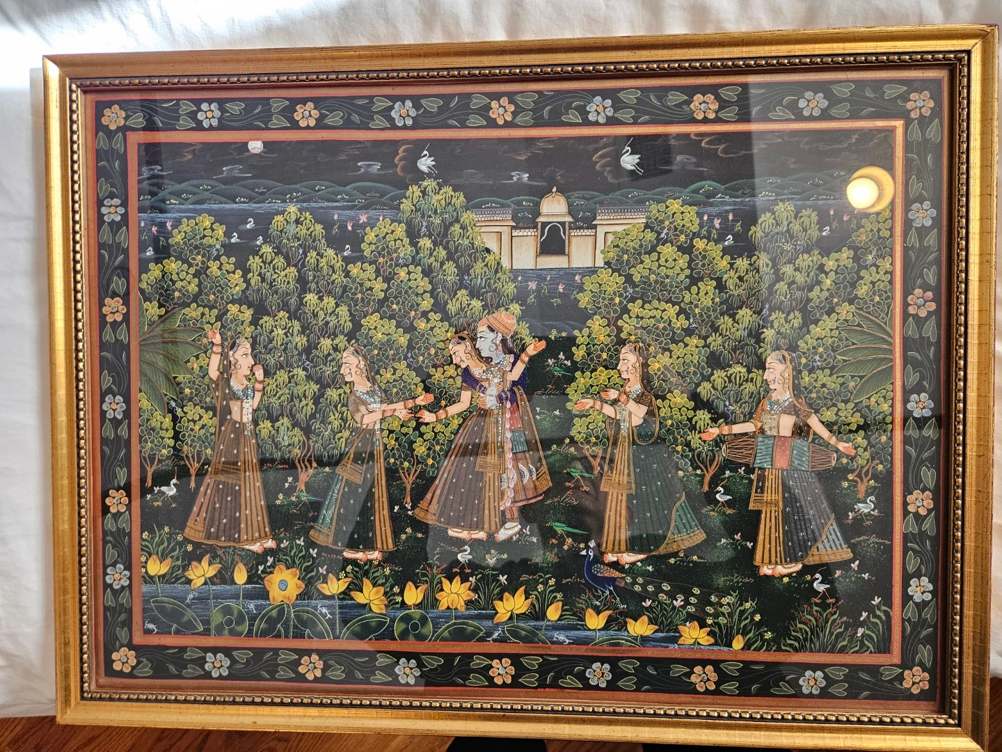 This framed miniature painting depicts a traditional scene with figures in ornate clothing amidst lush greenery and a building. It's crafted with intricate detail and vibrant colors. The frame is a classic gold.