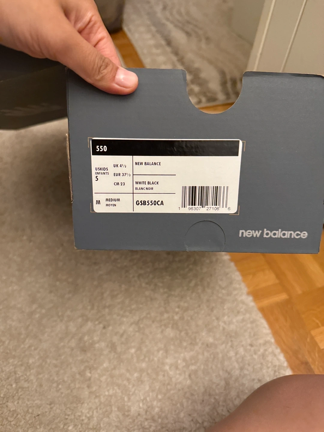 Selling a pair of New Balance 550 sneakers in white and black! They are us kids size 5 and come with the original box has been used but shoe looks gently used condition