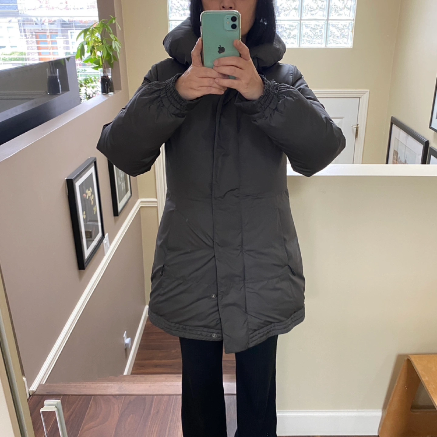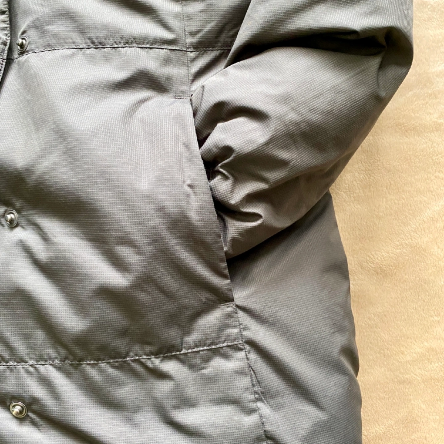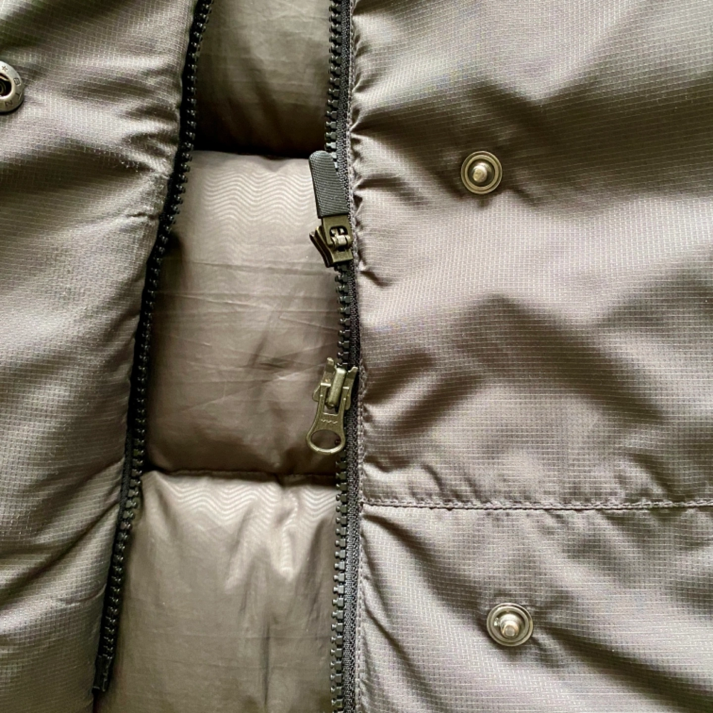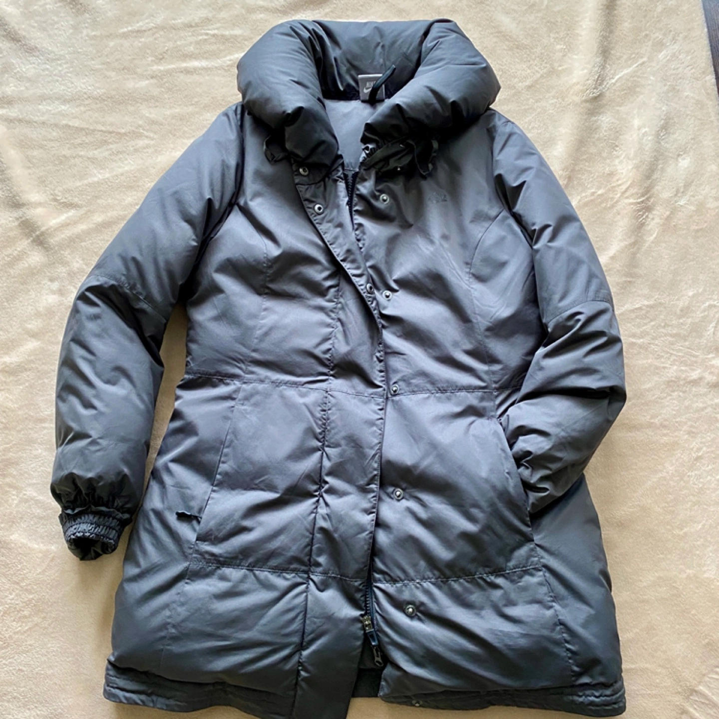 Dark grey puffer jacket with a zipper and button closure. Has a high collar and two pockets. Thick down fill keeps very warm and fit snugly.