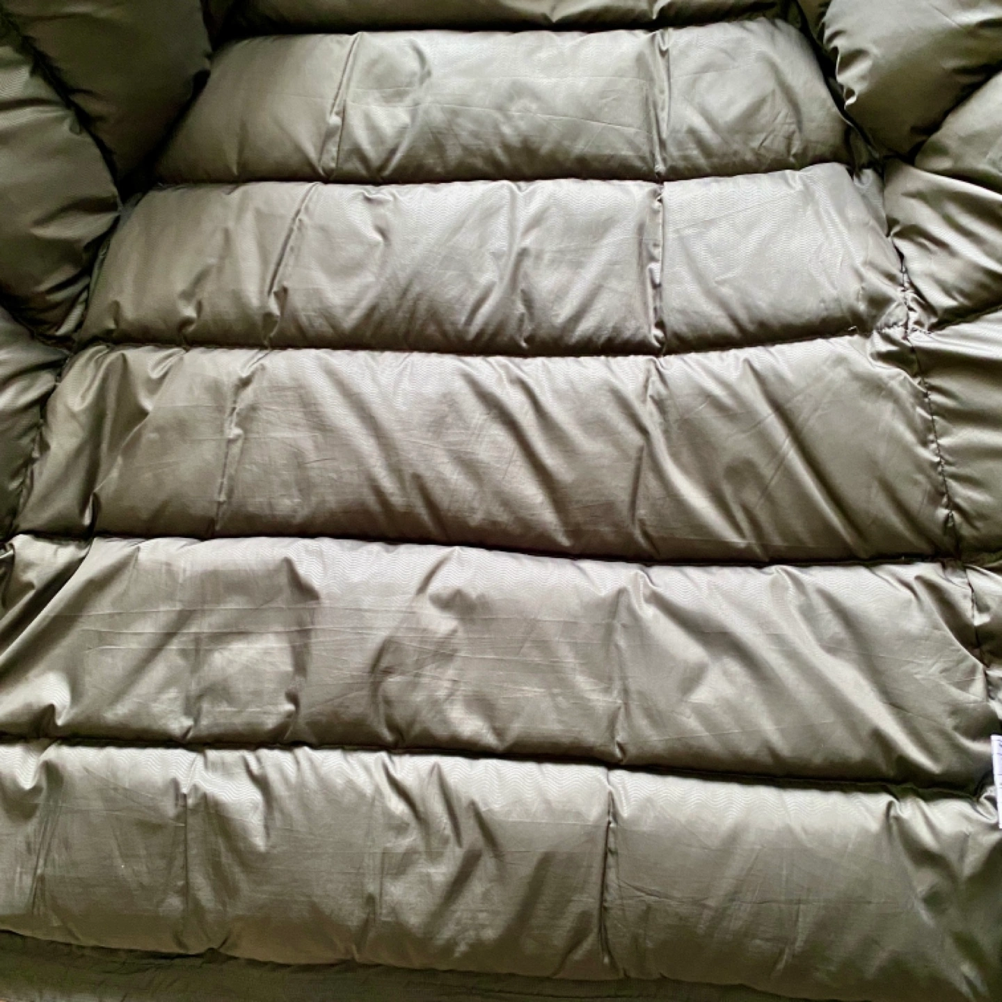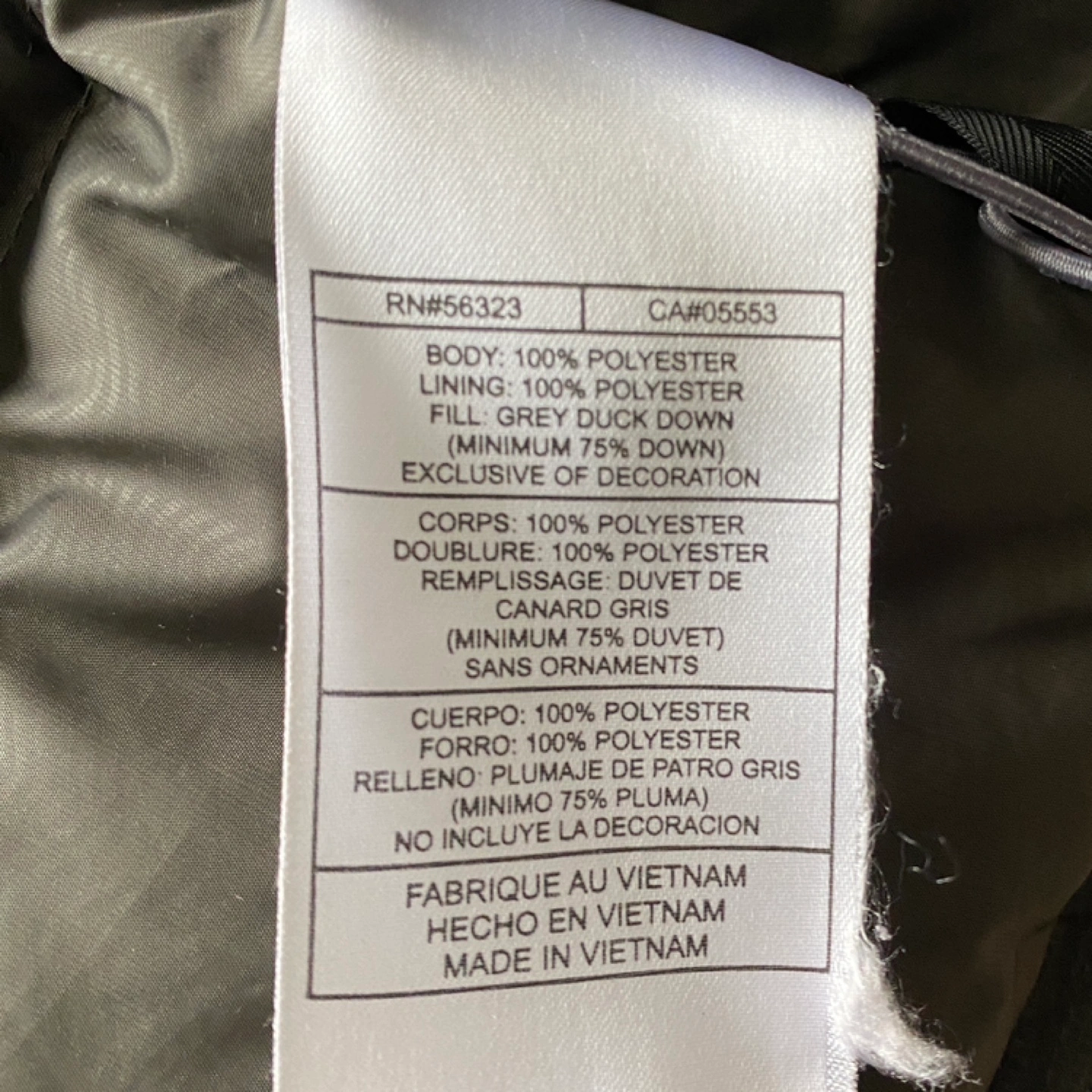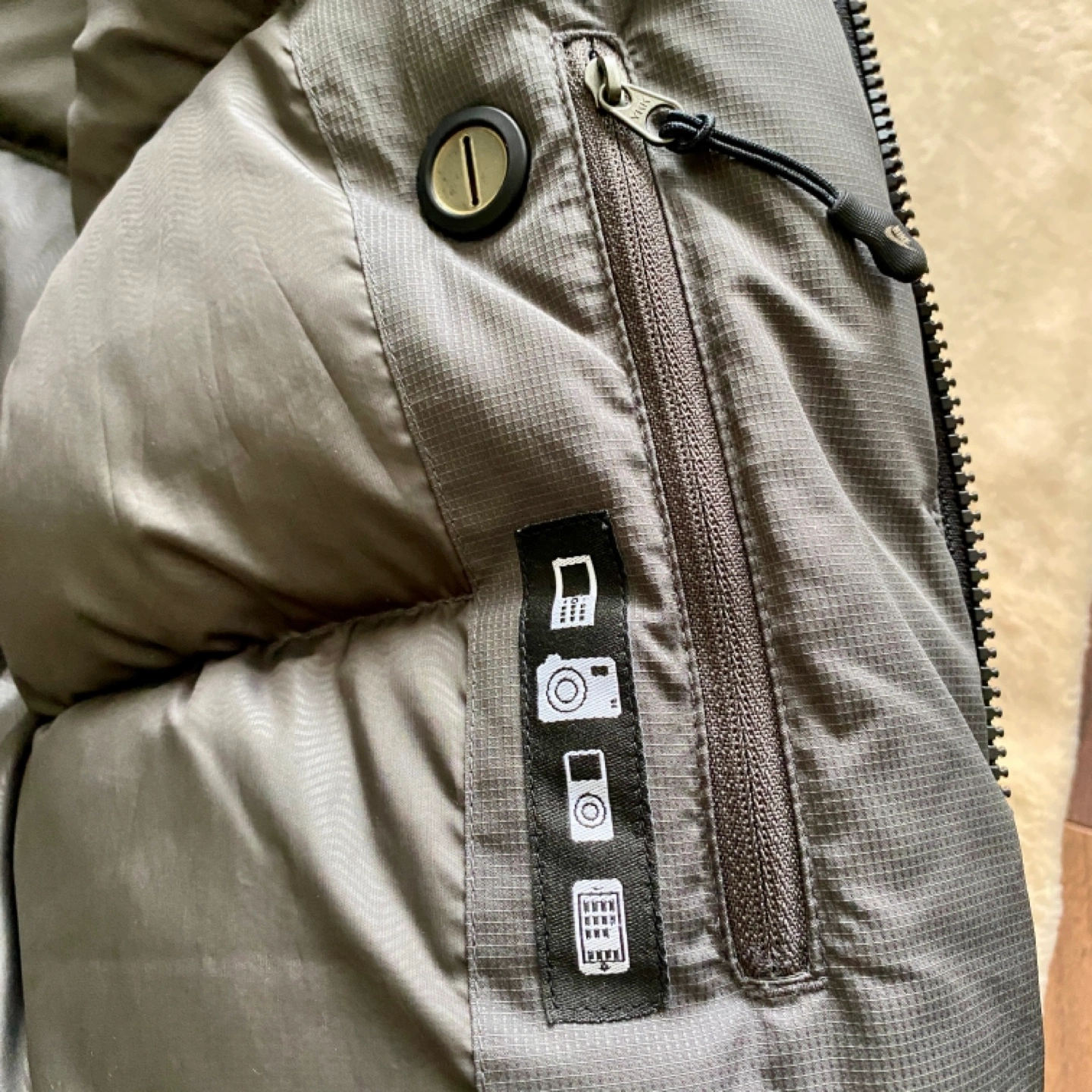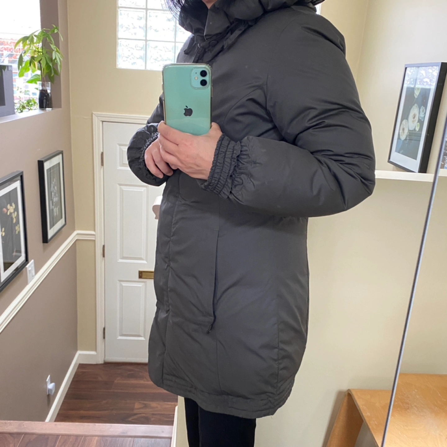 Dark grey puffer jacket with a zipper and button closure. Has a high collar and two pockets. Thick down fill keeps very warm and fit snugly.