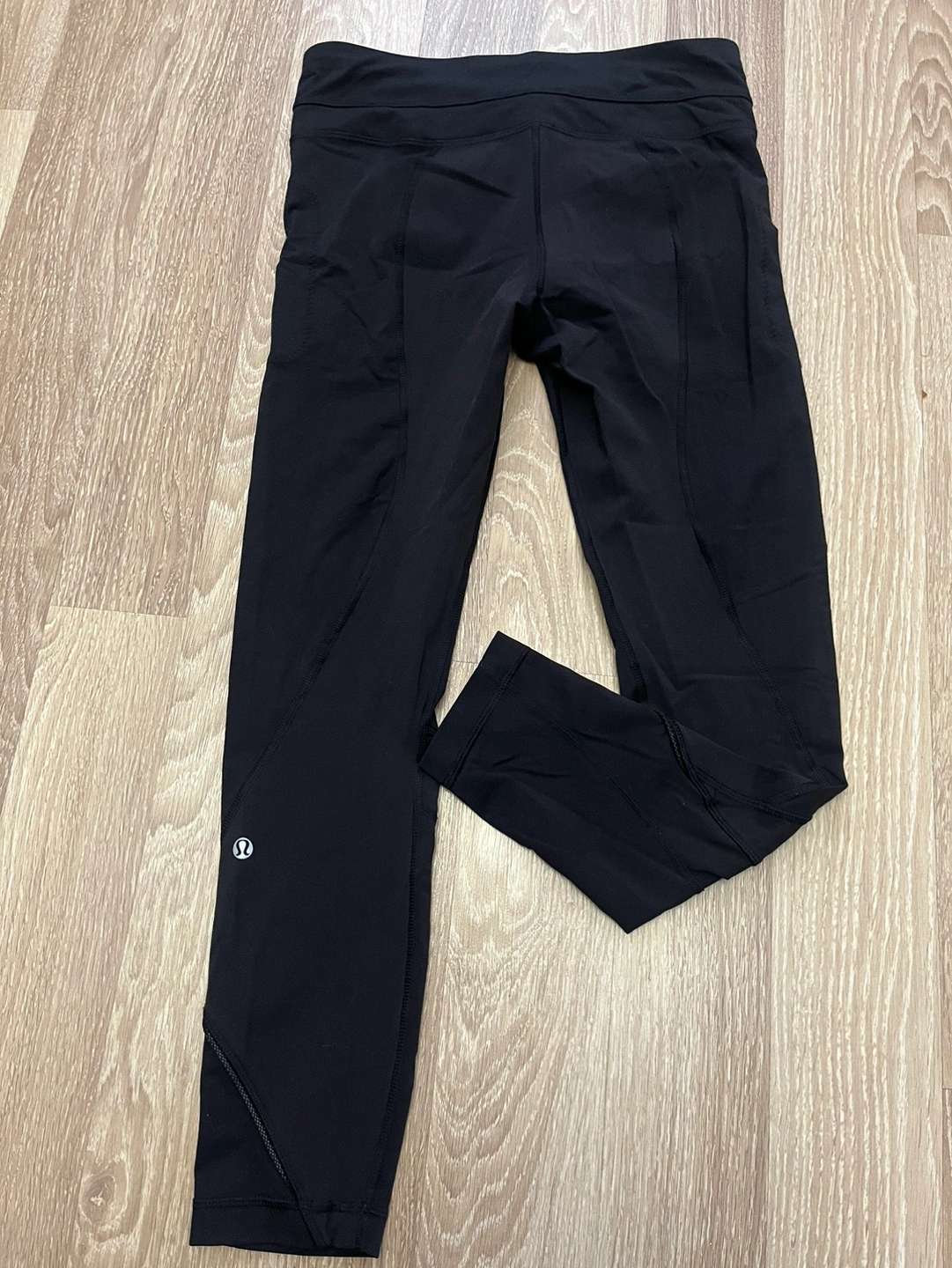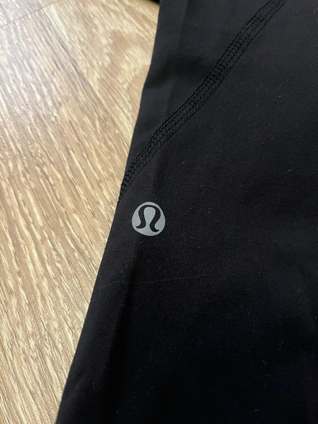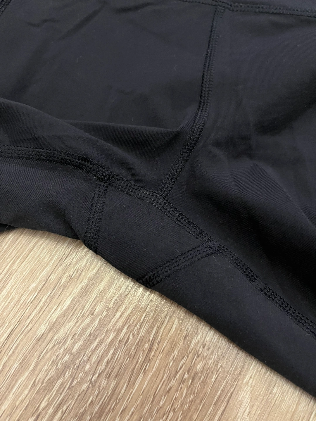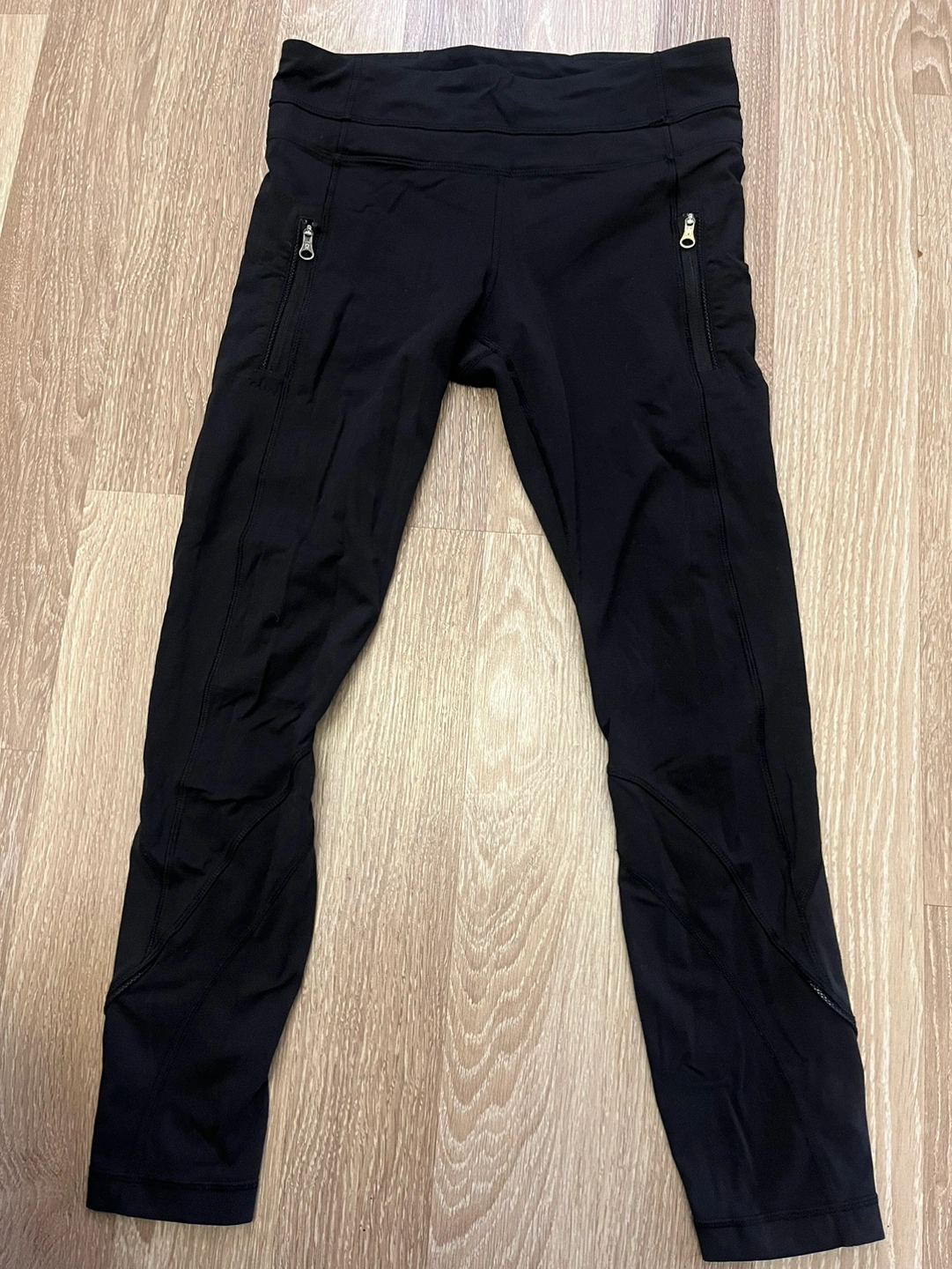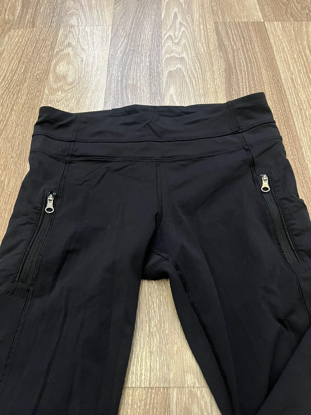 Black running tights with side pockets and zippers. No rips/stains/peeling.