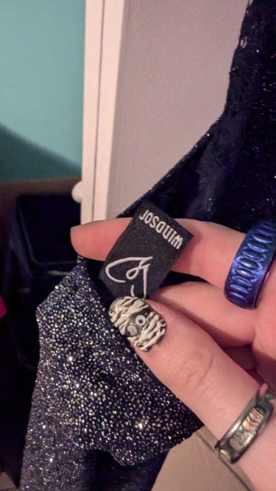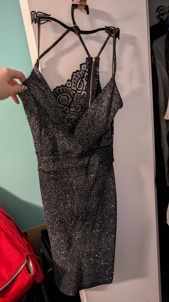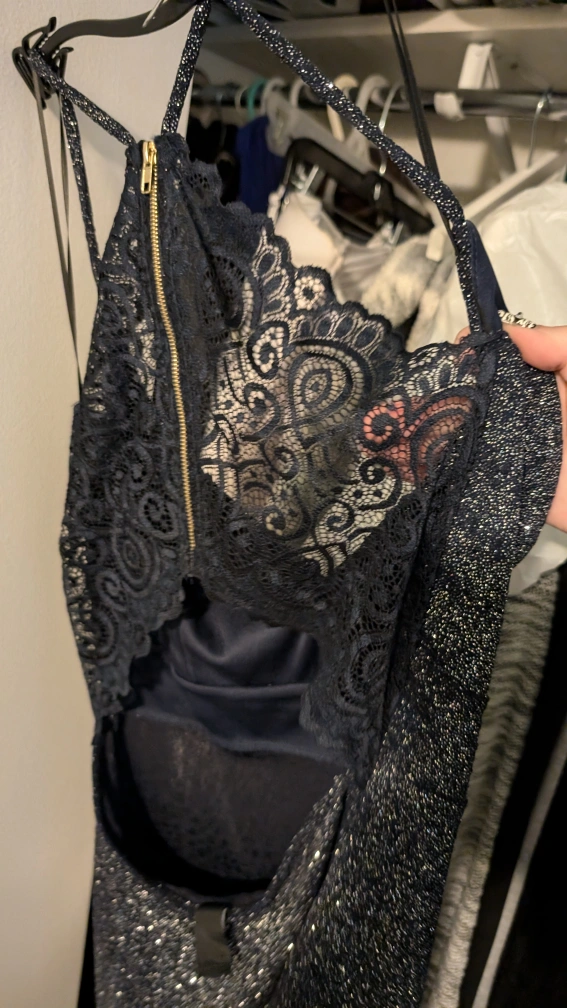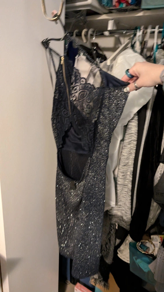 Sparkly navy dress with lace detail on the back. Sleeveless, form-fitting, and has a zipper closure in the back. From home with dogs. Chicago 60618