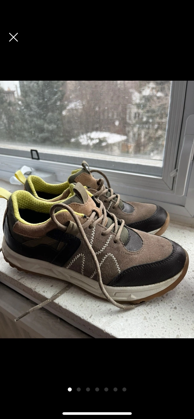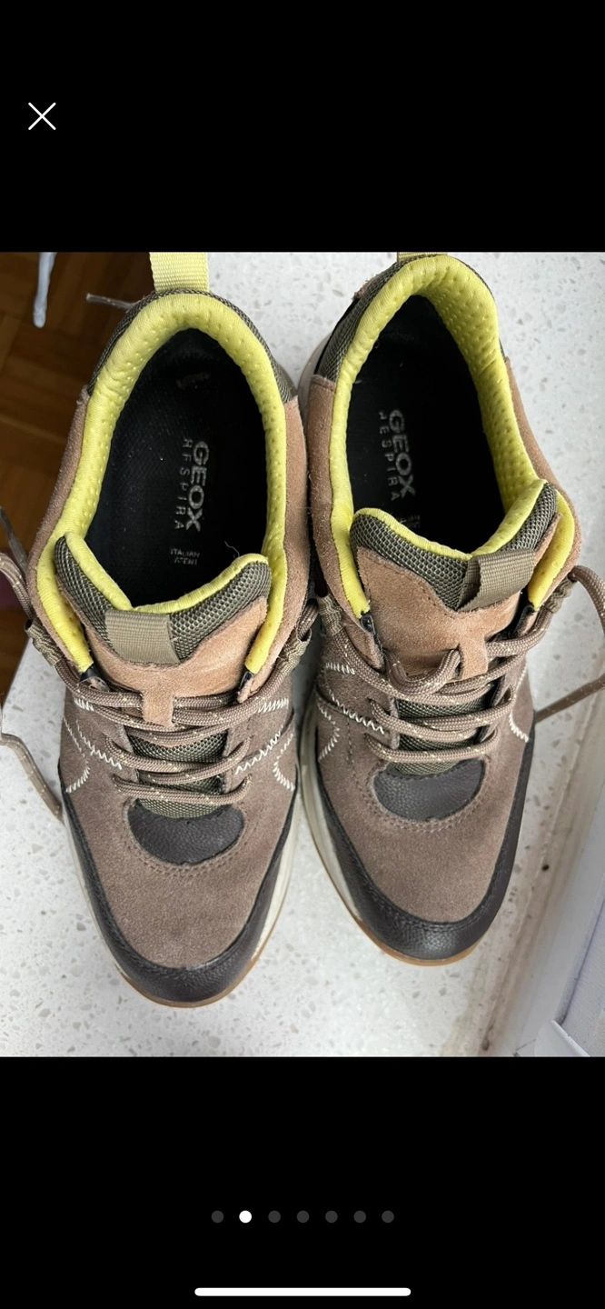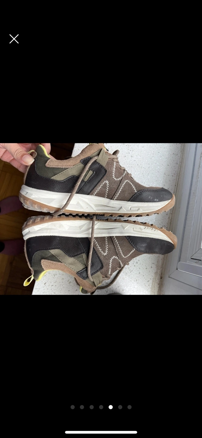 Brown suede sneakers with green and yellow accents. Lace-up closure. Breathable. Size 8