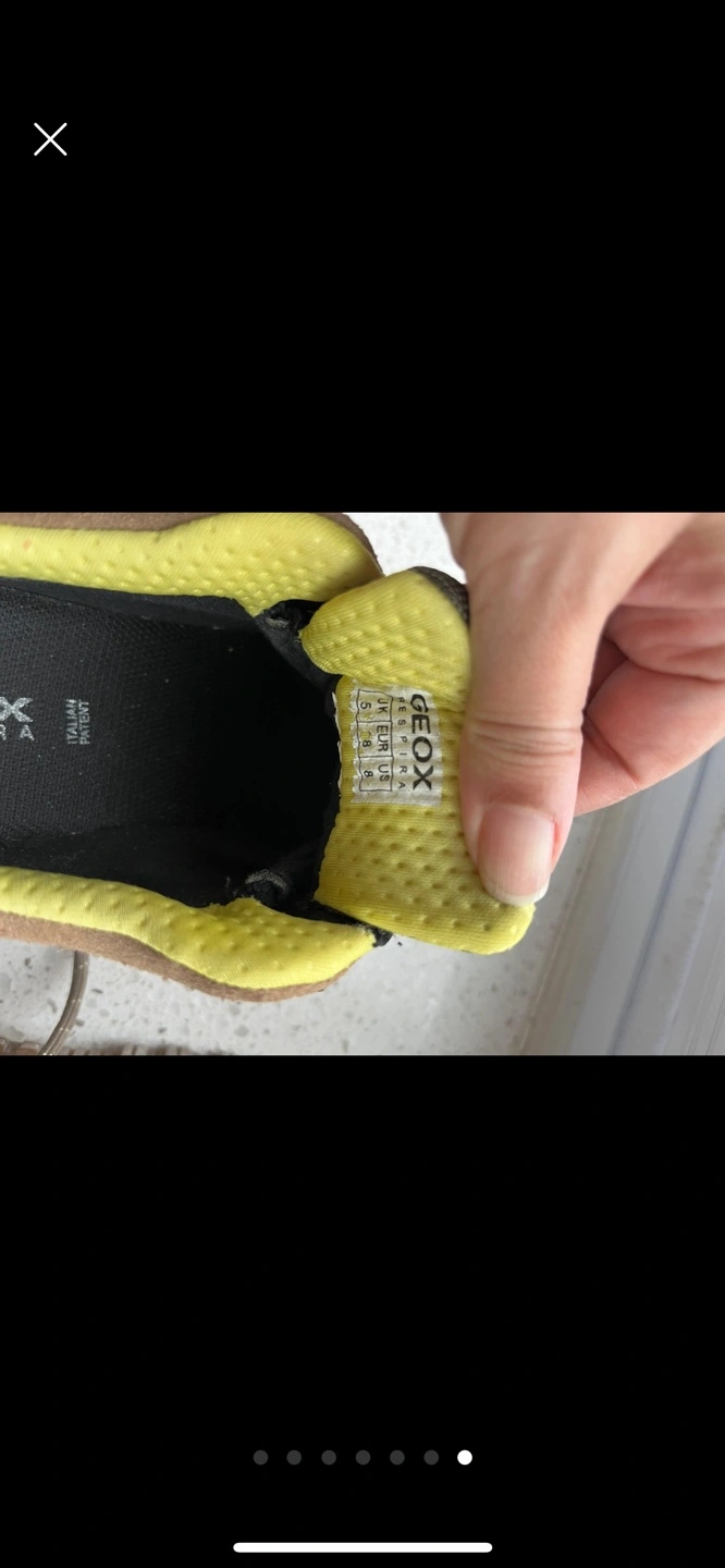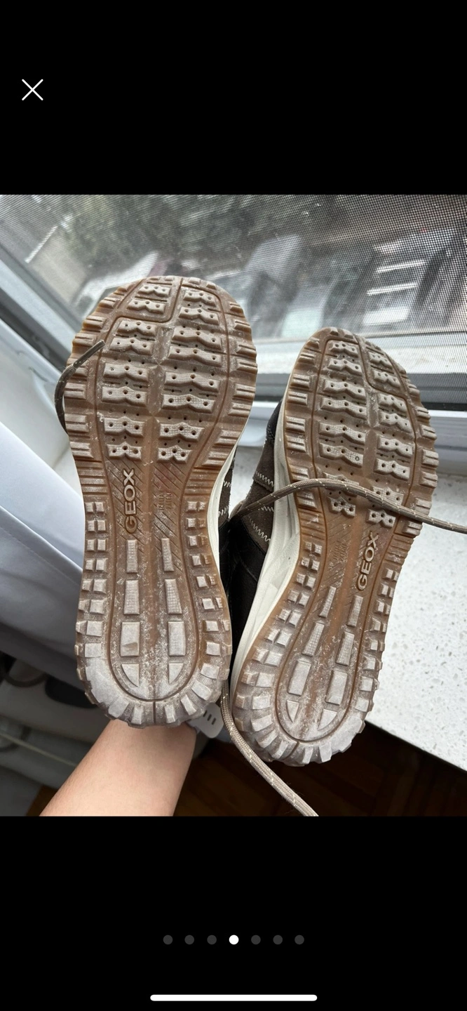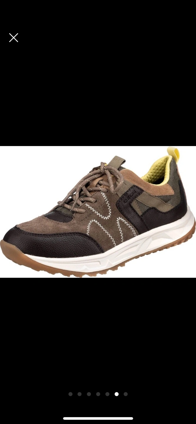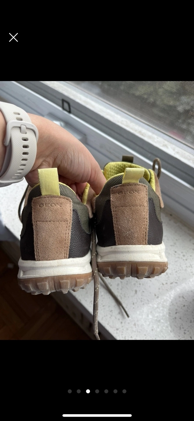 Brown suede sneakers with green and yellow accents. Lace-up closure. Breathable. Size 8