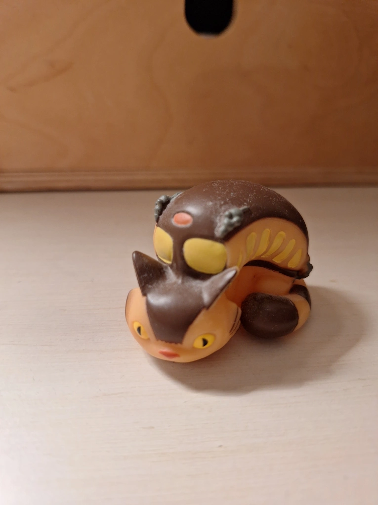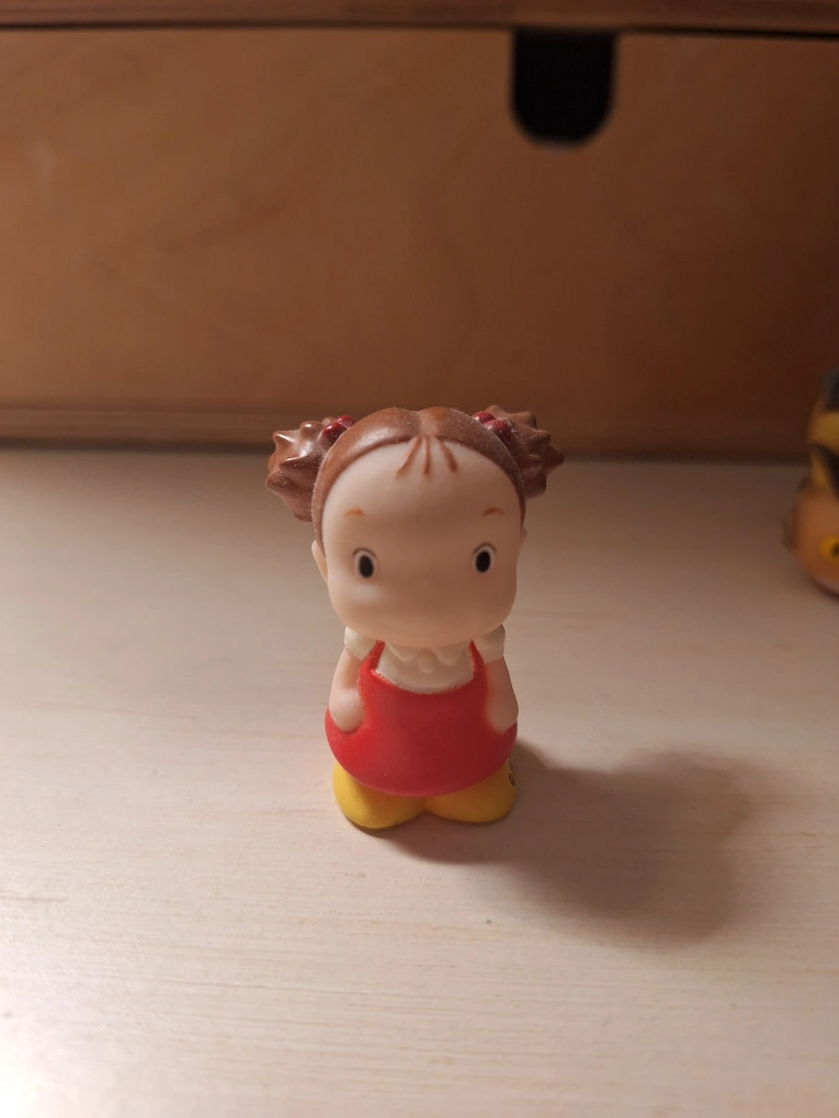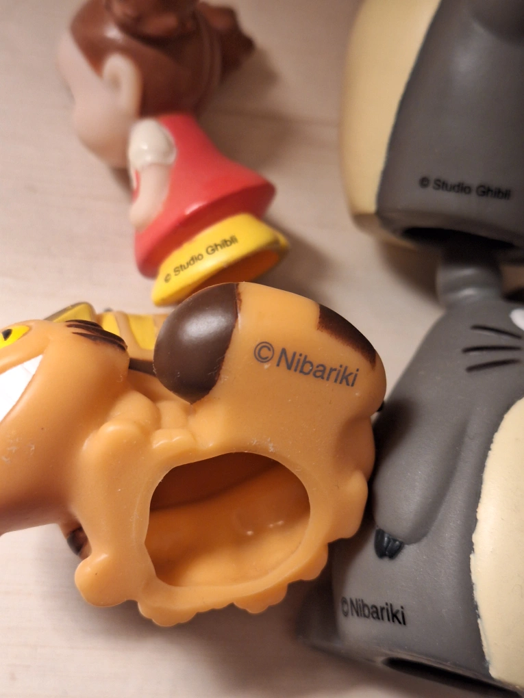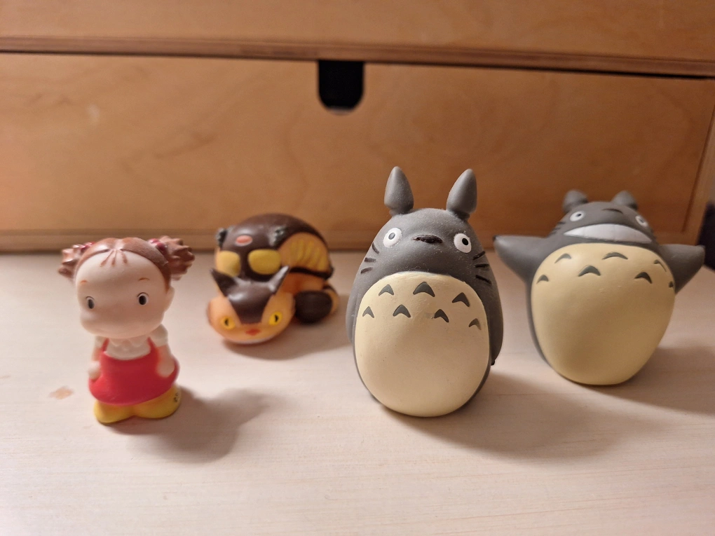 Set of four Studio Ghibli figurines featuring Totoro, a cat bus and a young girl. All from Ghibli studio store.