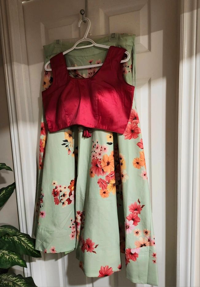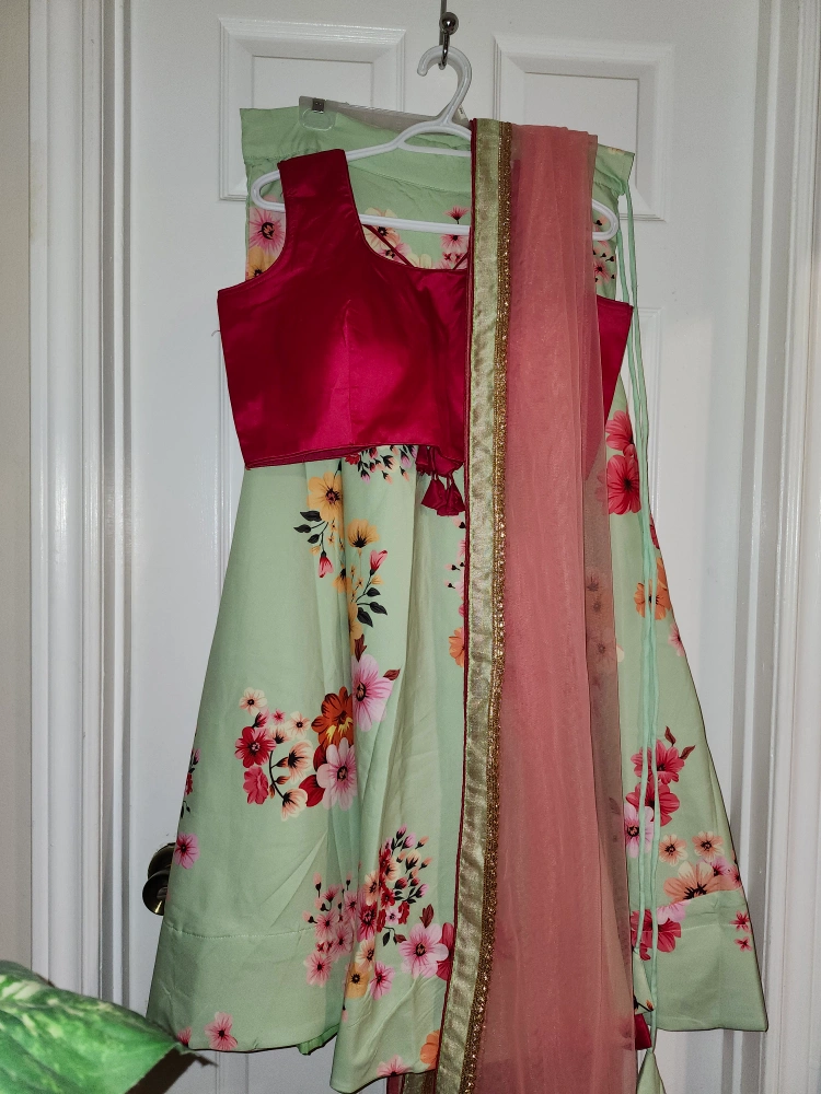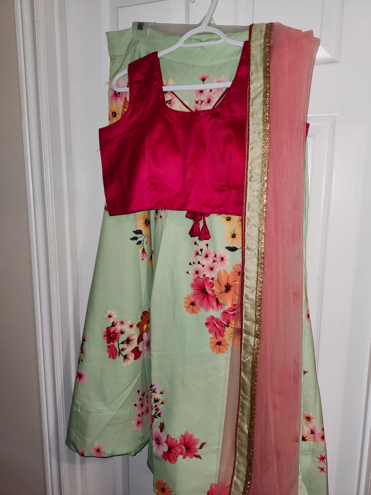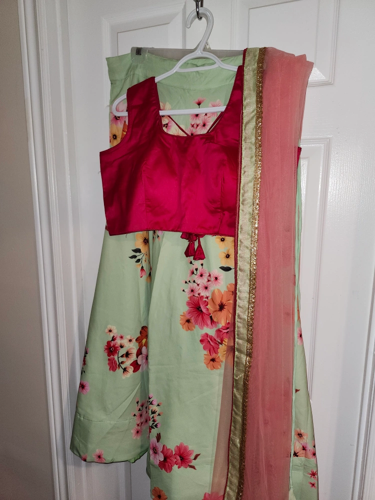 New Lime Green Floral Lehenga with Pink Blouse + Pink Shawl