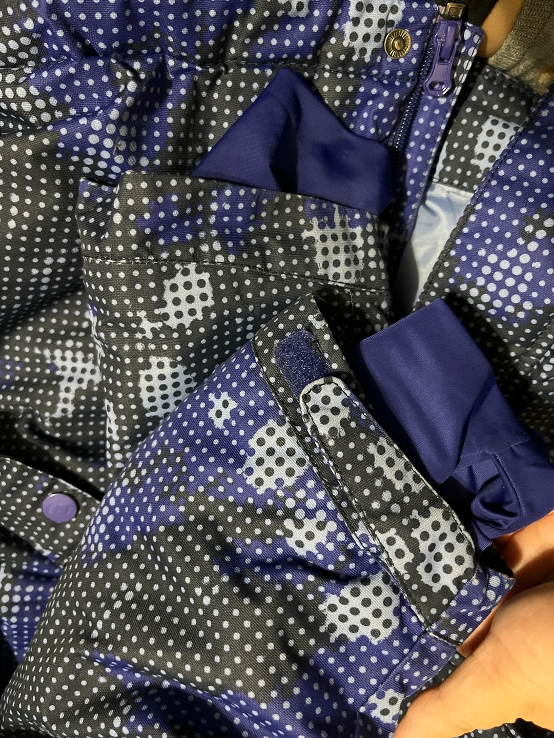 Blue/purple and black patterned winter jacket with a hood. It has a zipper closure and a fleece lining.